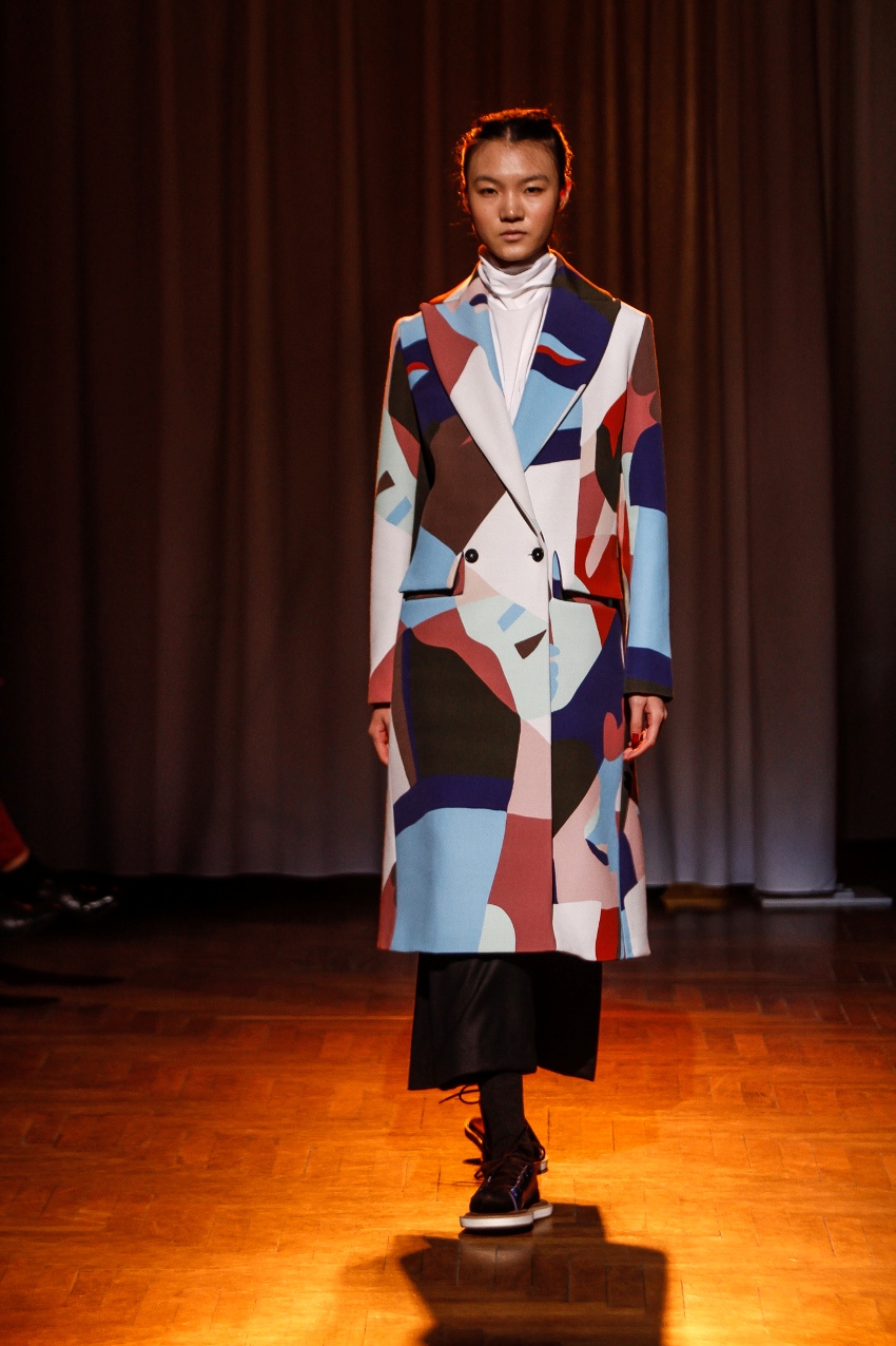 La collezione A/I 2017-18 trova il suo elemento caratterizzante nel colore; ciò non è nuovo nello stilista che si esprime spesso in modo “astratto”, attraverso la geometria e il colore. Il designer usa colori primari stampati sul tessuto a moduli geometrici in totale sintonia con la geometria delle forme. E’ il colore a dare movimento e personalità all’intera collezione. Contribuisce a definire la forma come nella giacca dall’ampio collo rosso, dove il gioco del bianco e marrone crea una asimmetria che riesce a sottolineare il punto vita. Il colore accentua la personalità del capo in un gioco di contrasti; come accade nel capotto di ispirazione orientale dal deciso collo nero e stampa a grandi chiazze dal bianco al blu, mentre la silhouette è risolta con la corposità del tessuto. E’ la disposizione del colore – giochi di macchie- che richiama l’attenzione sul cappotto dai grandi revers e due bottoni scuri all’altezza della vita. E’ il cappotto il grande protagonista della collezione: stretto in vita da un laccio, tasche asimmetriche; colorato in rosso deciso o in giallo; kimono nero chiuso da un’ alta cintura; puro gioco di tasselli colorati per ironizzarne la severa linea.