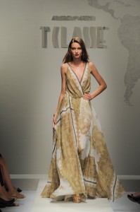 Gli outfit più belli sono abiti lunghi e camicie morbide in georgette, arricchita da fili lurex con le stampe di un palazzo di sultani sull’oro e sul grigio. Le altre stampe Geo risultano poco decise sui fondi beige, rosa pastello, champagne, crema o verde pallidissimo.