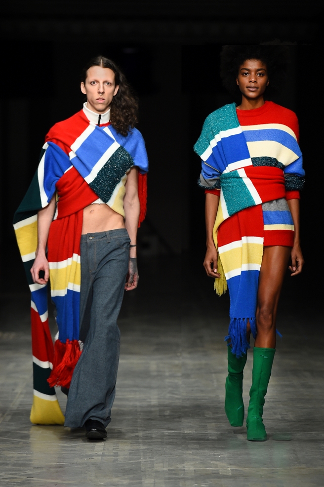 A volerli definire e descrivere sinteticamente il loro lavoro, di Vanotti diciamo: designer razionale anti romantico, predilige le linee geometriche, chiare e decise, asciutte, ma sa costruire abiti femminili, eleganti sobri, impeccabili da un punto di vista sartoriale. Per Angel Chen sottolineamo la presenza di uno spirito giovanile quasi sfrenato che diventa, nelle sue collezioni, innovazione, ma rischia di sconfinare nella stravaganza là dove manca una punta di ironia in grado di smorzarne l’enfasi; la sua espressività si esprime nell’uso del colore che talvolta ha tonalità eccessive. Due personalità molto diverse, ambedue però hanno scelto di portare in passerella capi femminili e maschili e di adottare alcuni elementi dell’abbigliamento hip hop giovanile -specialmente nella linea dei pantaloni-, e di virare talvolta verso una modalità genderless (stessa idea per i due sessi, ma non lo stesso concetto di abito, non si tratta neppure di un abito unisex) come ad esempio nella collezione di Angel Chen in quei capi maschile/femminile che sfilano assieme richiamandosi a vicenda: una serie di sciarpe colorate –bianco, celeste, rosso- che costruiscono per lei completamente un abito corto, per lui il sopra di pantalone grigio.