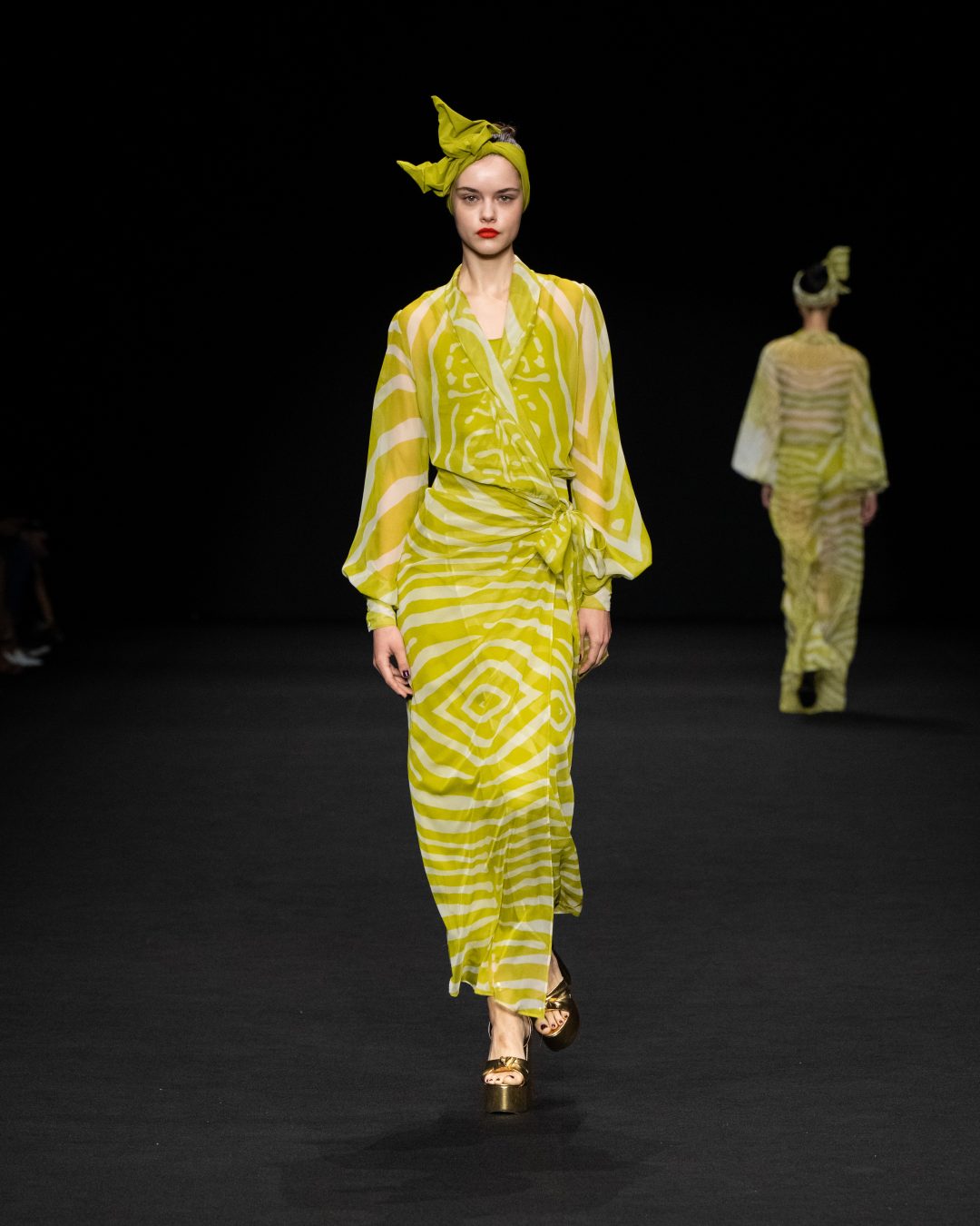 Interessanti le stampe a zebra o a macchie di giaguaro che rivelano l’ispirazione esotica della collezione spesso corredata da turbanti dello stesso tessuto; più classiche le personali interpretazioni grafiche dei tradizionali motivi di stampe per cravatte.