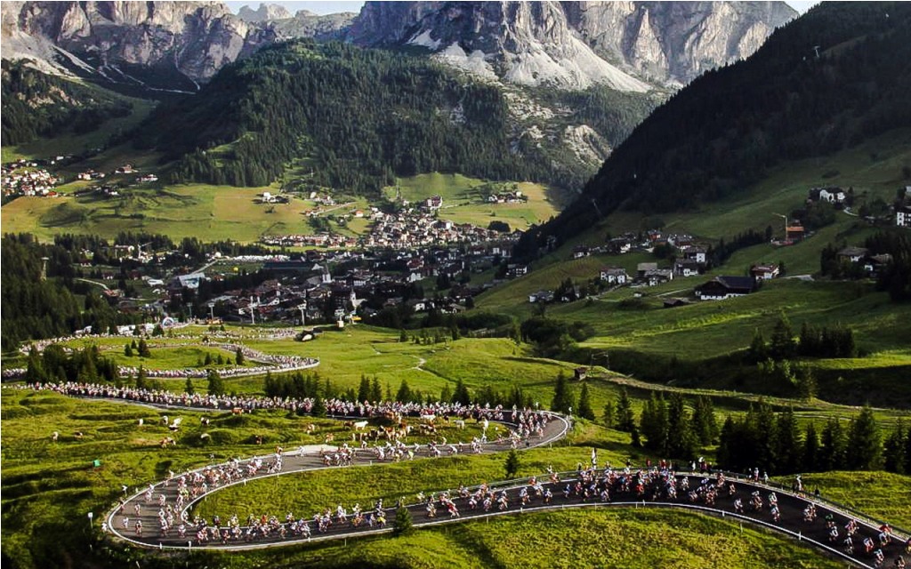Un sibilante serpentone di bici attraverso i fiabeschi paesi della Val Badia su cui vigila il maestoso Gruppo del Sella: per celebrare i trent’anni della Maratona dles Dolomites (sic in lingua ladina) – la granfondo più famosa d’Italia e uno degli eventi più prestigiosi del nostro ciclismo amatoriale – il Giro d’Italia quest’anno ha fatto tappa a Corvara (il 21 Maggio), dopo aver superato passi dolomitici entrati nel mito come Pordoi, Sella, Gardena, Campolongo, e macinato 210 km con oltre 5000 metri di dislivello (partendo da Farra d’Alpago).