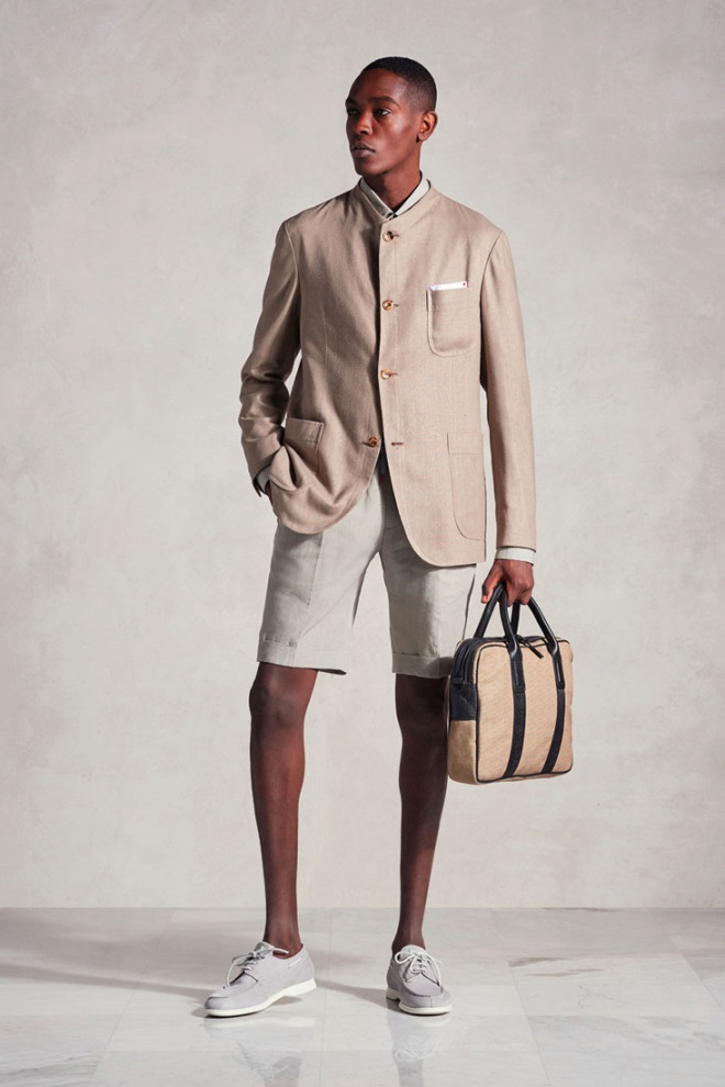 Kiton non rinuncia alla sua tradizione. Ciò che ci mostra è perfetto. Anche i capi più formali non perdono di raffinatezza nell’acquisire una nuova, più fluida modernità, come ad esempio i pantaloni del doppio petto in seta lavata che hanno elastico o coulisse in vita; oppure i completi con pantaloni corti, i bermuda, così inusuali alle nostre latitudini.
