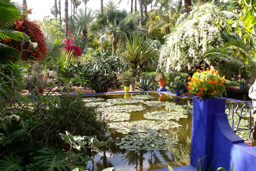 Una giornata di fine marzo ai Giardini di Majorelle, Rue Yves Saint Laurent, Gueliz, Marrakech, Marocco. Se si presta un po’ di attenzione si possono distinguere il canto del merlo, del passero, e del bul bul; si può osservare il volteggiare della cinciallegra, della ballerina bianca, del codirossi e dello spazzacamino, il pigliamosche comune che dialoga con le colombelle, e i falchi che danzano liberi nell’aria.
