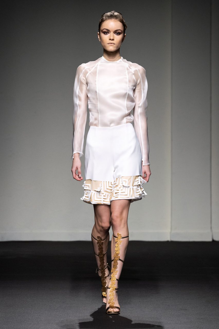Donne di una femminilità sensuale ed assertiva che la designer esprime proponendo una collezione che celebra uno stile elegante dove ci si veste per sedurre e ci si copre per proteggersi. Ad enfatizzare l’aspetto marziale delle guerriere ci sono le acconciature con capelli morbidamente raccolti da fermagli metallici per emulare eleganti elmi a protezione del capo.