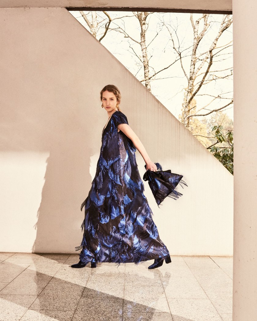 Uno stile definito e per questo riconoscibile, che ritroviamo nella collezione presentata all’interno del calendario della MFW di febbraio 2019 nelle sale del Museo Bagatti Valsecchi dove, oltre agli abiti su manichini, vengono proiettati gli scatti della campagna ADV preparata da Guido Taroni che ben ambientano e sottolineano, -grazie agli edifici di architettura moderna contro cui campeggiano le modelle-, l’essenza della visione stilistica di Laura Aparicio. Scopriamo subito-è ben evidente- un legame, una assimilazione di elementi provenienti dal mondo del design nelle forme pure e pulite, nei tagli secchi e rigorosi, nel minimalismo della costruzione, assolutamente priva di enfasi, e quindi di adorni e orpelli.