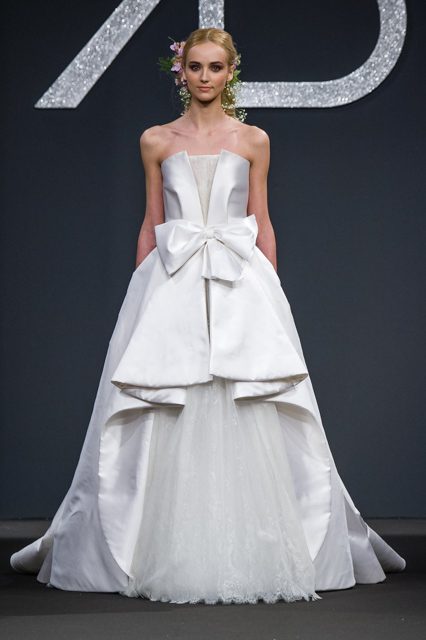 Nell’insieme la collezione non ha convinto, talvolta, in alcune uscite, lascia la sensazione di cose già viste, anzi di cose di sapore vintage, come l’abito dalla gonna in tulle e inserti, effetto maculato, o quello lungo color melanzana, a balze ondeggianti; o le applicazioni di grandi fiori sulla giacchina acquamarina e sull’abito monospalla color glicine. Belli invece l’abito rosa dalla gonna plissettata, la baschina lavorata con applicazioni che fanno effetto nido d’ape. Tessuto leggerissimo celeste, stampato a fiori più chiari, per il bell’abito dalla scollatura all’americana fermata, come la cintura, da un nastro con incrostazioni luminose. Di effetto e fortemente appariscente, l’abito dai grandi fiori stampati, foderato in rosso, dall’ampio strascico; ammiratissimo l’abito in tulle glicine col corpetto dalla profonda scollatura, impreziosito da rose ricamate in tutte le nuance; ancora tulle per l’abito di strati di viole lungo malva pallido con spirale di ruche nel corpino, nella gonna e nell’orlo. Infine, chiude la collezione l’abito da sposa in candido mikado e pizzo chantilly, equilibrato nella costruzione, un “edificio” assolutamente simmetrico; classico, ma di effetto.