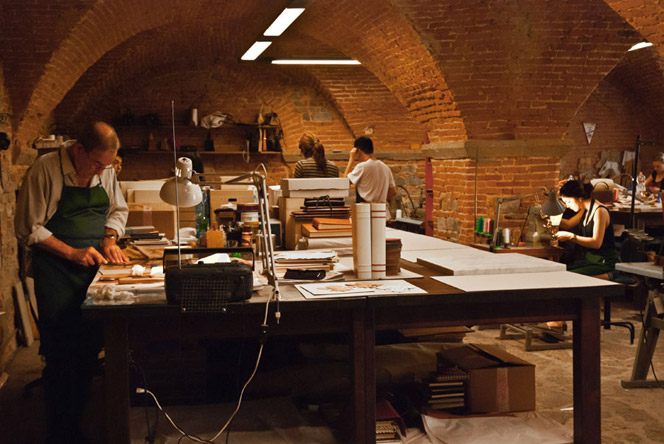 Nasce dopo la Seconda Guerra Mondiale dalla collaborazione tra i Frati Francescani del Monastero di Santa Croce e le famiglie Gori e Casini, rinomati artigiani fiorentini. L’obiettivo era quella di insegnare agli orfani della guerra un mestiere pratico che potesse diventare un vero e proprio lavoro. I Frati Francescani misero a disposizione della famiglia Gori e degli studenti artigiani il vecchio dormitorio posizionando tavoli da lavoro lungo il corridoio. Agli studenti venivano insegnate: le differenze tra i vari tipi di pellame, le tecniche per tagliare la pelle a mano e come realizzare articoli in pelle, dai piccoli prodotti alle grandi borse. Agli studenti più talentuosi veniva oltretutto insegnata l’arte della doratura, realizzata soprattutto su oggetti come scrittoi e portagioie.
