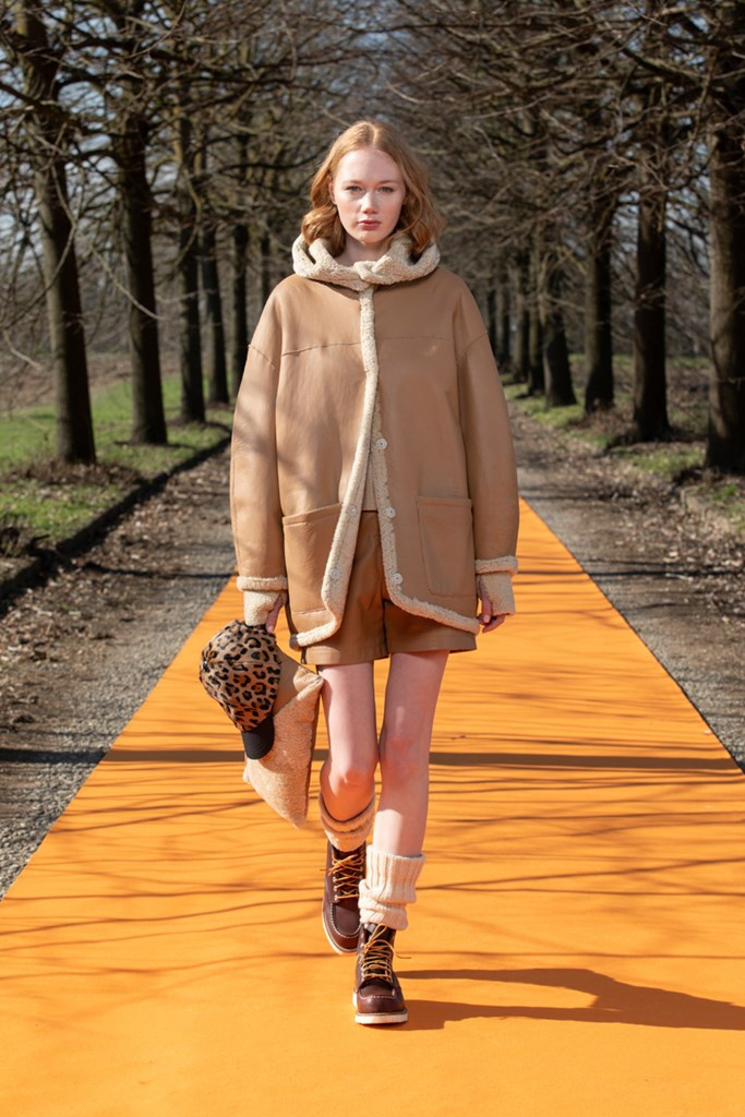 La maglieria gioca un ruolo importante con morbidi pantaloni jogging e felpe in cachemire da portare con gilet in montone arancio o con la camicia-gilet in visone taupe combinata con visone e zibellino.