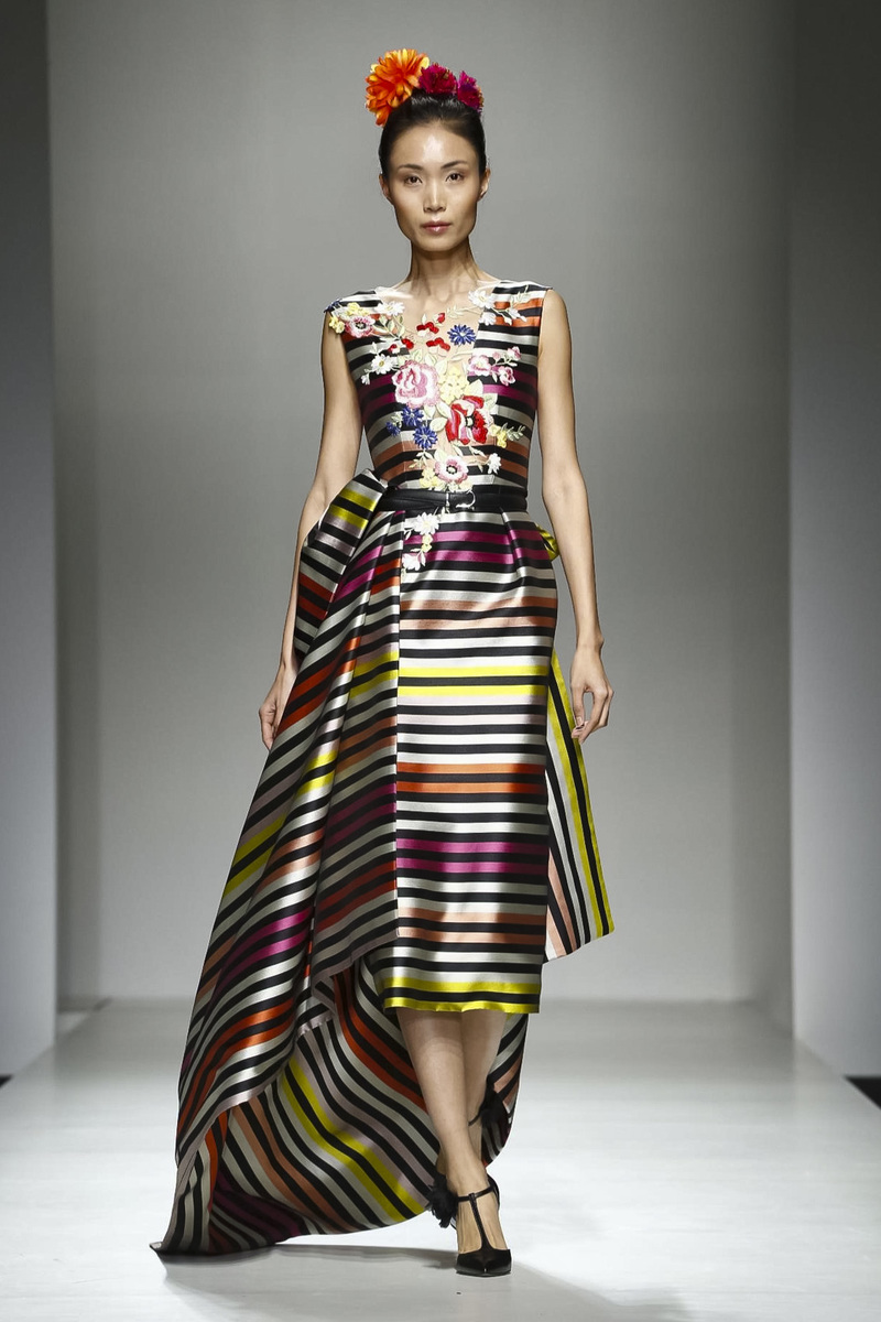 Una couturier sofisticata, che nella collezione “Giardino Segreto” Haute Couture P/E 2017 ha evidenziare le sue capacità espressive e ha saputo utilizzare quelle soluzioni stilistiche sorprendenti e proprie del lavoro nell’alta moda espressa in una ready couture, una pronta couture, di alta creatività. Abiti sontuosi nella loro semplicità, dal taglio geometrico netto rettangolare, solo talvolta smussato da una curva; dove le stampe, i ricami, i tessuti giocano un ruolo importante per dare valore alla creazione, mantenendone però l’espressione di estrema leggerezza e geometrica semplicità. Basti, come esempio, osservare l’abito da sposa, realizzata in un duplice gioco di sfumature: linea semplicissima, ricchezza espressa nella gonna e nelle applicazioni di ricami in vita e nel corpino. Oppure guardiamo l’abito di tessuto stampato a fiori, gonna corta sul davanti che permette di apprezzare il compito del tulle che doppia internamente la gonna gonfiandola e sostiene lo strascico rendendolo voluminoso. Belle le stampe a fiori sul voile di seta e sul cadì; sapienti gli accostamenti delle sfumature di colore, studiati gli effetti ottenuti con i panneggiamenti del tessuto a righe colorate. Una sottile cintura nera segna il punto vita e sdrammatizza anche gli abiti più costruiti.
