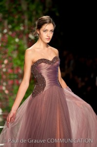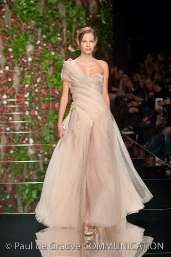 Una donna ultrafemminile e seducente, conquista la passerella dell’alta moda capitolina. Le trasparenze divengono elemento caratterizzante e centrale nella collezione per la Primavera/Estate 2011 dello stilista libanese Abed Mahfouz. Corpini-bustier e ampi scolli si associano a drappeggi e volumetrie che giocano con il corpo, velandolo e svelandolo, in un intreccio malizioso fra forme naturali e soluzioni sartoriali che vogliono costruire architetture ideali e sognanti. Abiti peplo, tagli monospalla, strascichi e dettagli dorati, caratterizzano la donna di Mahfouz, una divinità contemporanea, consapevole di se stessa, che sceglie prevalentemente abiti lungi creati per soirèe d’eccezione.