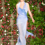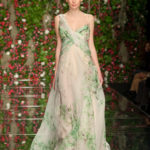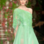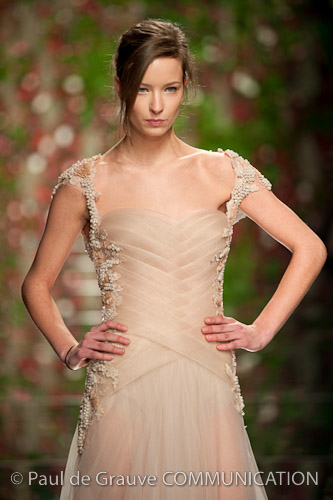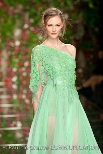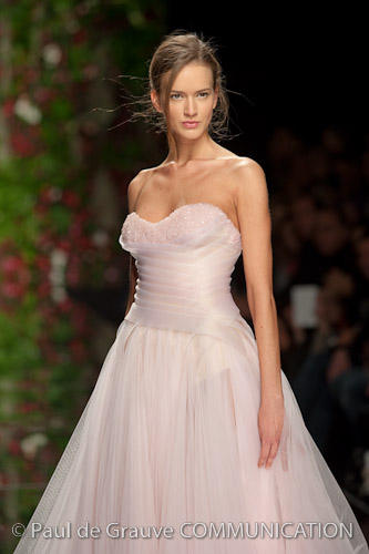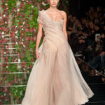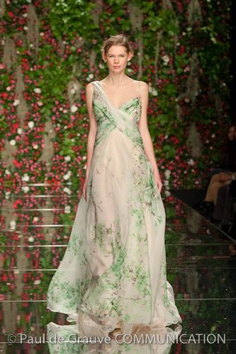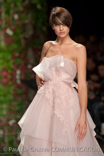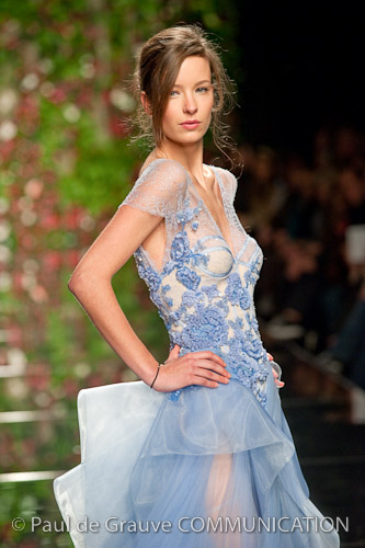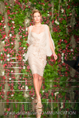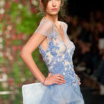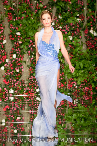 Il lato romantico della seduzione è espresso attraverso cascate di volants e mini inserti in tulle, l’uso di fantasie floreali, la scelta cromatica. La palette di colori è caratterizzata da nuances pastello a effetto poudrés: blu acqua marina e rosa, verde pistacchio e arcadian. Sfilano abiti malva, in celeste e lilla sfumato, color carne white e off-white. Pietre semi-preziose creano giochi di luce arricchendo le stoffe, attraversate da elaborati ricami. Gli abiti simulano motivi cristallizzati, attraverso lo studio delle volumetrie applicato ai tessuti: la mussola, il pizzo, il crin. Il ritratto della femminilità che viene fuori è un ritratto sontuoso, una moda che rifiuta ogni minimalismo, nel tentativo di incantare contemporaneamente Oriente e Occidente.
