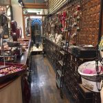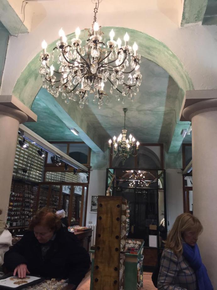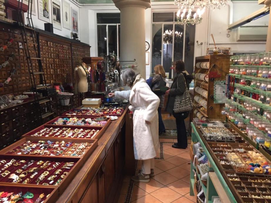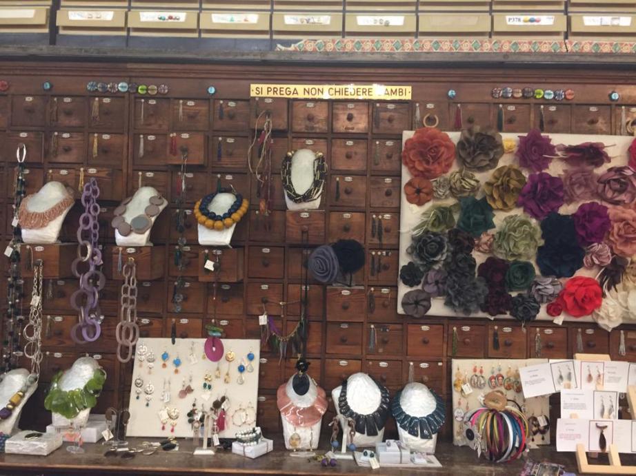 Le vetrine appoggiate allo scricchiolante parquet -quasi una musica- proteggono i monili più pregiati mentre fanno bella vista di sé sugli scaffali “liberi” le collane variopinte dal tratto più spiritoso.
