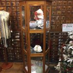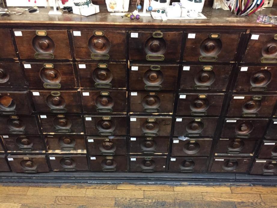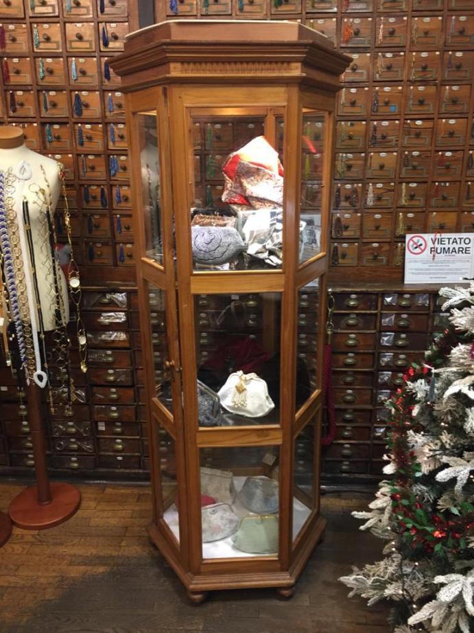 I bancali originali del primo ‘900 supportano espositori contenenti bigiotteria sia d’antan sia contemporanea.