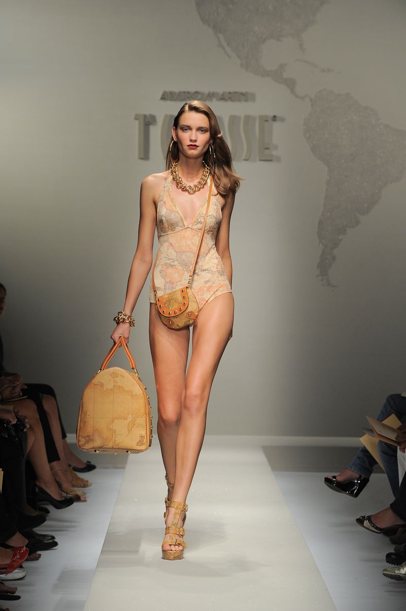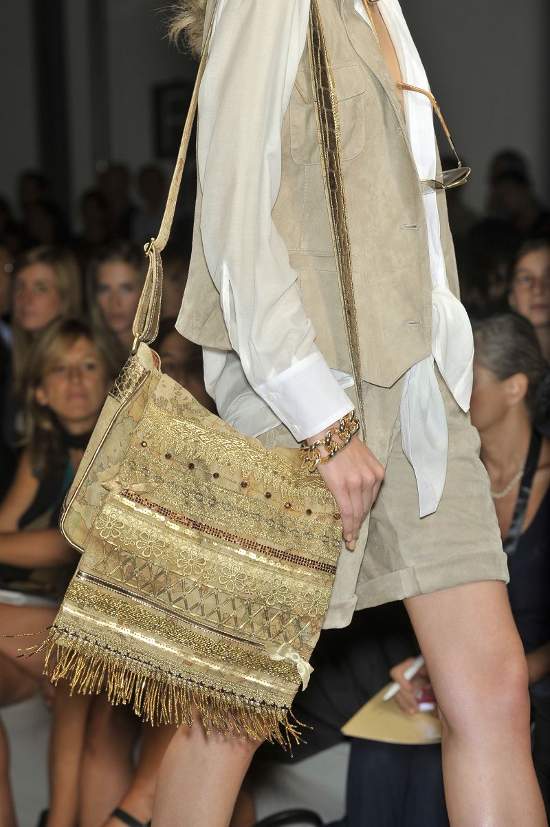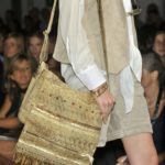 Ricchi invece gli accessori: orecchini dorati e grandi collane, cinture alte in cuoio e oro. A rompere l’insieme di sobrietà, i sandali oro alla schiava eccessivamente alti. Le borse vanno dai pezzi tradizionali con stampe Geo classiche, anche arricchite con borchie dorate, a borse in canvas di cotone con stampe a fogliame tropicale, che si sovrappone alle stampe classiche.