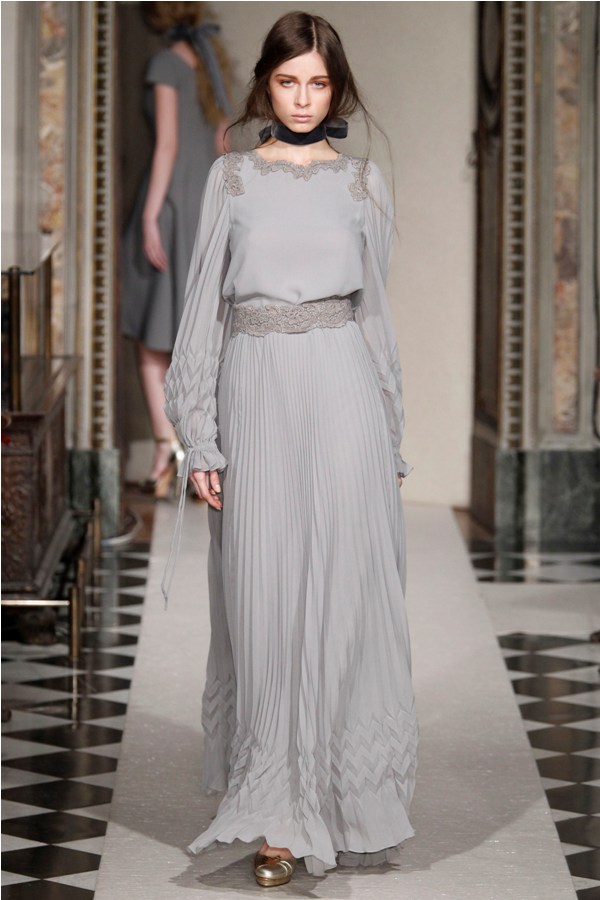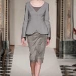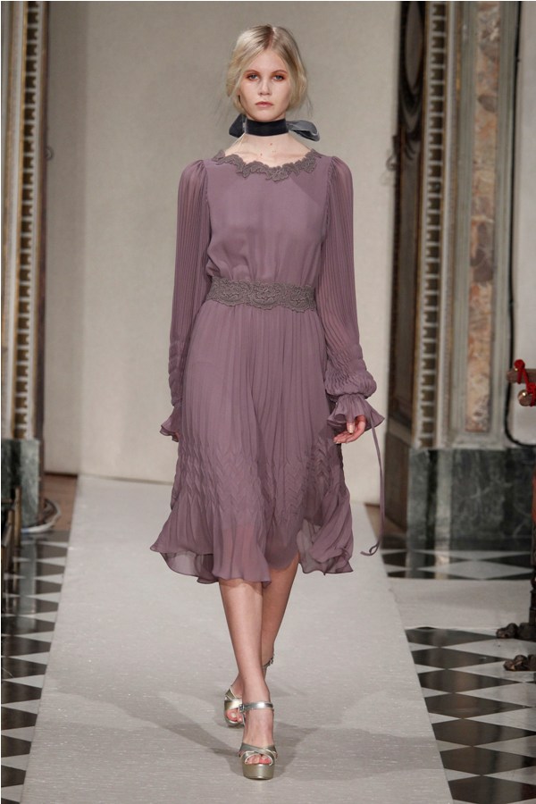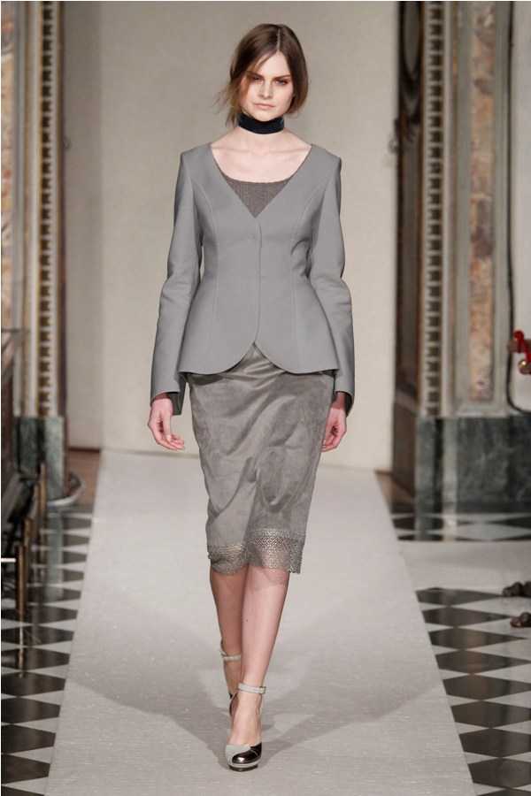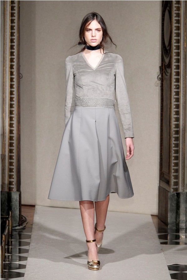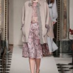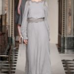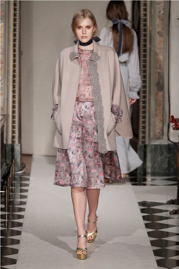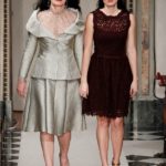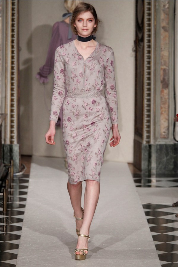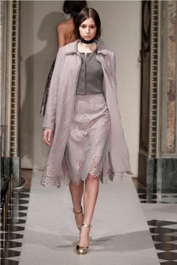 Equilibrio tra struttura e fluidità, alternanza tra lunghezze midi e maxi -piccole e garbate “infiltrazioni” di mini!-, armonia tra i capi da giorno e quelli destinati al calar della sera. Tailleur dalle giacche sagomate e dalle gonne accostate al corpo o simili a corolle; stampe sofisticate e delicatissime per impreziosire il raso di seta in contrasto con il tweed lavorato a intarsio; fitte plissettature sulle maniche delle camicie oversize e sui bordi delle gonne fluttuanti e morbide; geometrie inedite dagli effetti tridimensionali e innovativi sugli abitini svelti e portabilissimi; alcantara usata come fosse una seconda pelle; pizzi romantici e impalpabili con effetto camaieu; nastri di velluto intonati ai colori-base al collo e fra i capelli; lavorazioni a filigrana negli splendidi abiti da cocktail forse a occhieggiare i gioielli rinascimentali e le atmosfere evocate dal palazzo ospitante. Quasi un ripasso della storia del costume.