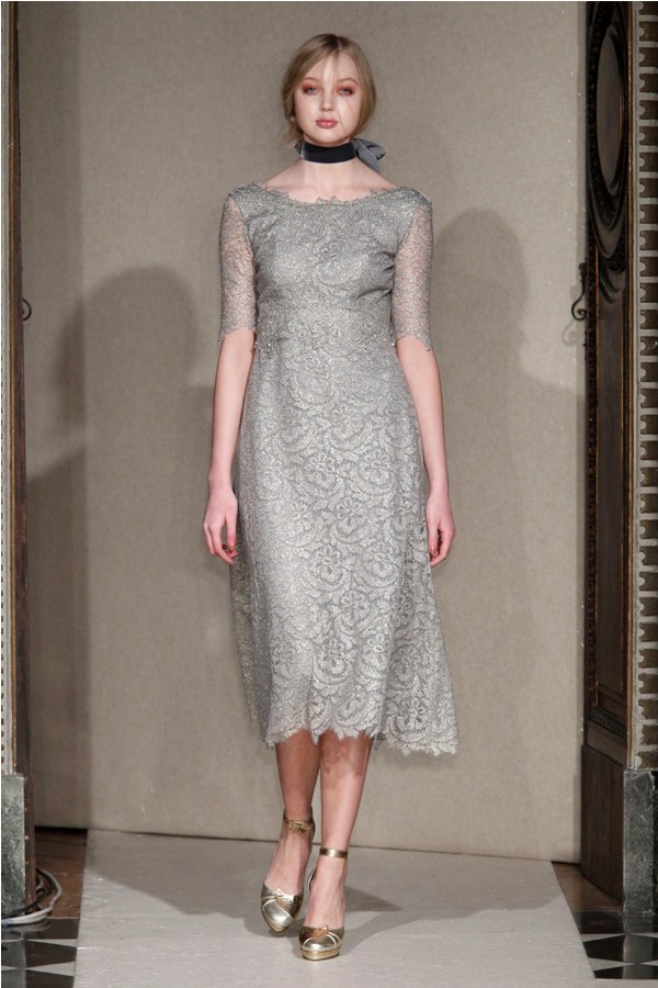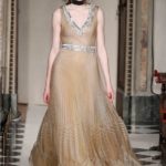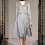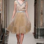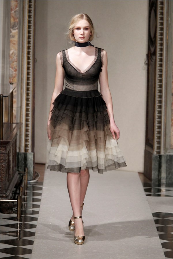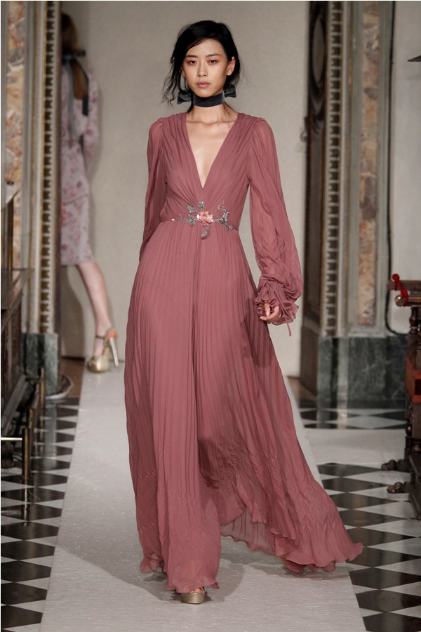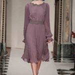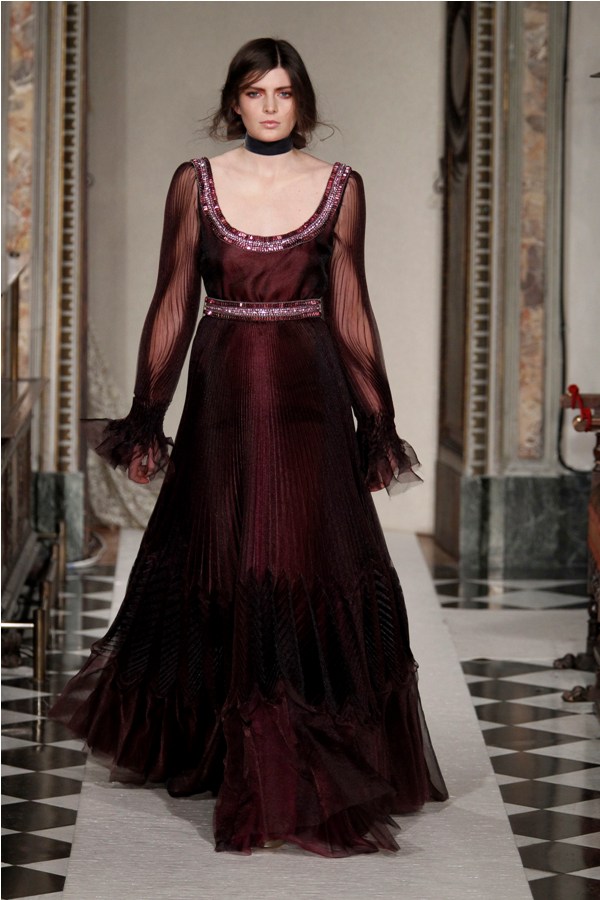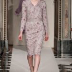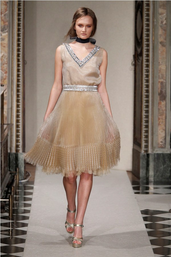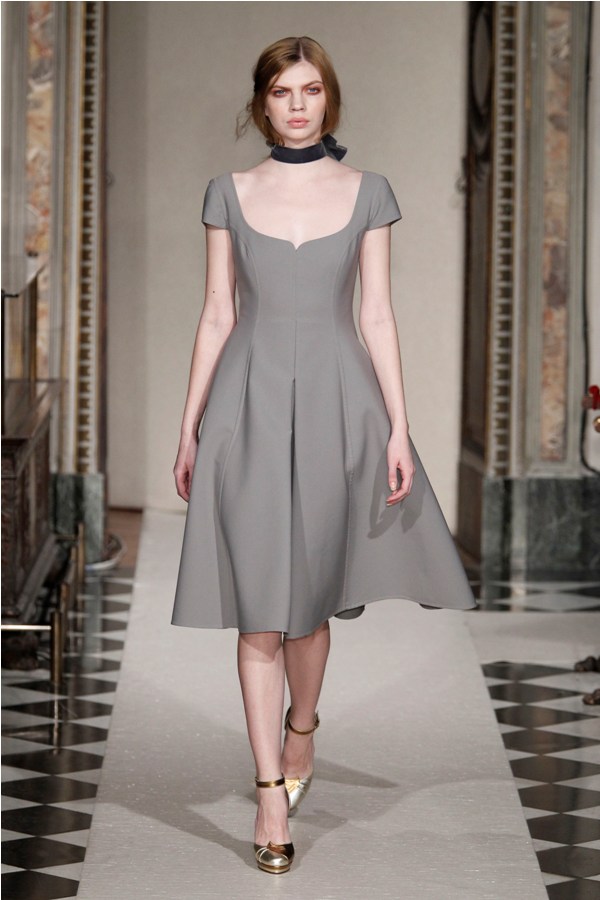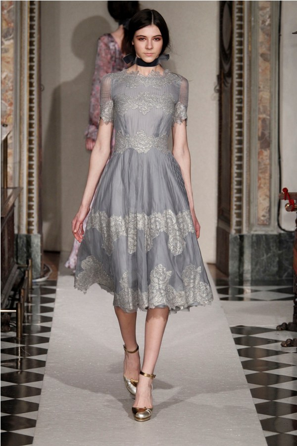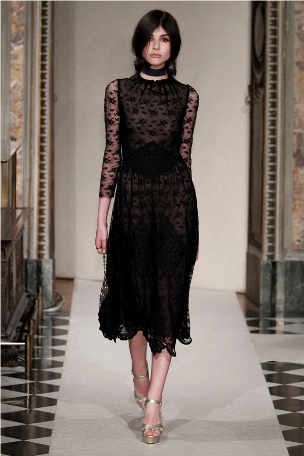 Equilibrio tra struttura e fluidità, alternanza tra lunghezze midi e maxi -piccole e garbate “infiltrazioni” di mini!-, armonia tra i capi da giorno e quelli destinati al calar della sera. Tailleur dalle giacche sagomate e dalle gonne accostate al corpo o simili a corolle; stampe sofisticate e delicatissime per impreziosire il raso di seta in contrasto con il tweed lavorato a intarsio; fitte plissettature sulle maniche delle camicie oversize e sui bordi delle gonne fluttuanti e morbide; geometrie inedite dagli effetti tridimensionali e innovativi sugli abitini svelti e portabilissimi; alcantara usata come fosse una seconda pelle; pizzi romantici e impalpabili con effetto camaieu; nastri di velluto intonati ai colori-base al collo e fra i capelli; lavorazioni a filigrana negli splendidi abiti da cocktail forse a occhieggiare i gioielli rinascimentali e le atmosfere evocate dal palazzo ospitante. Quasi un ripasso della storia del costume.