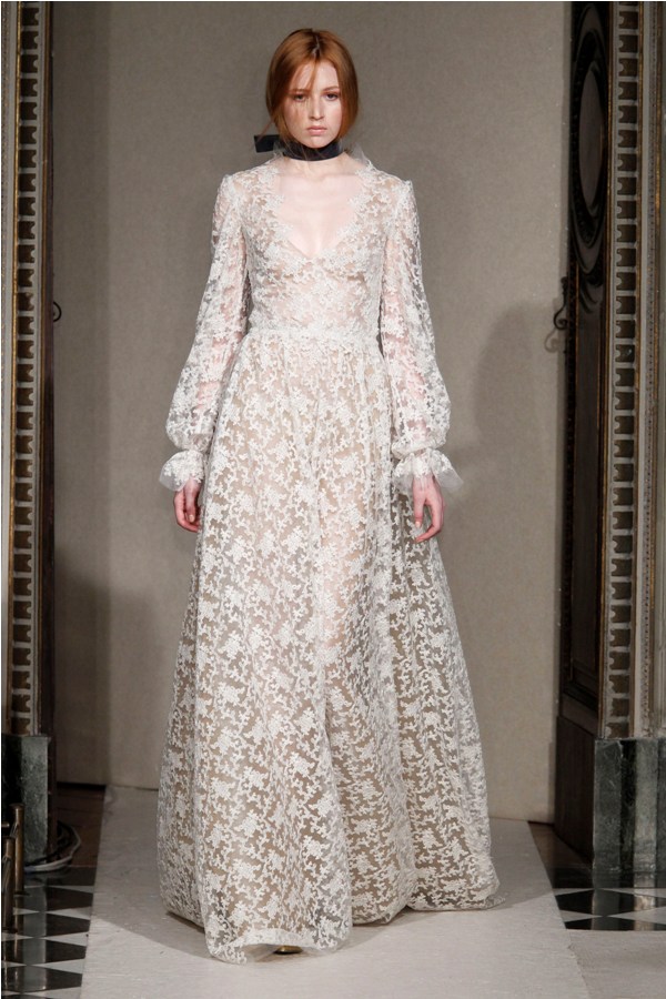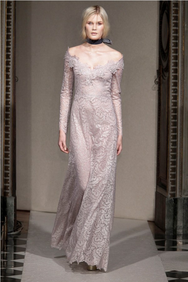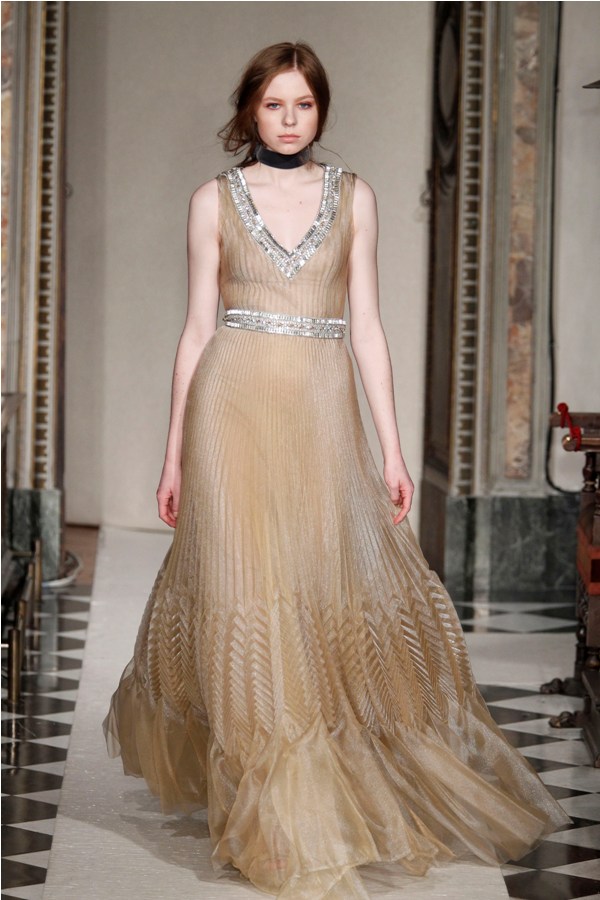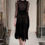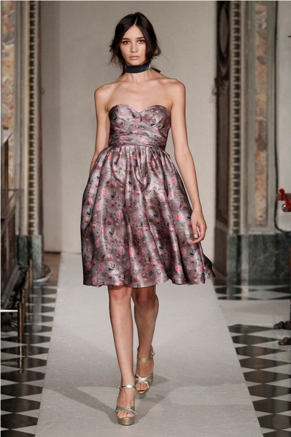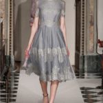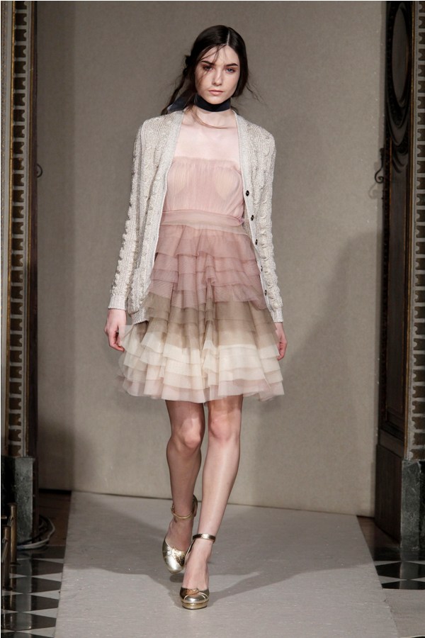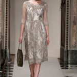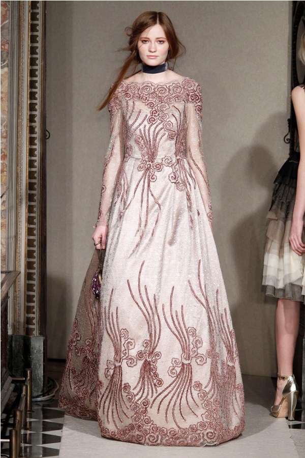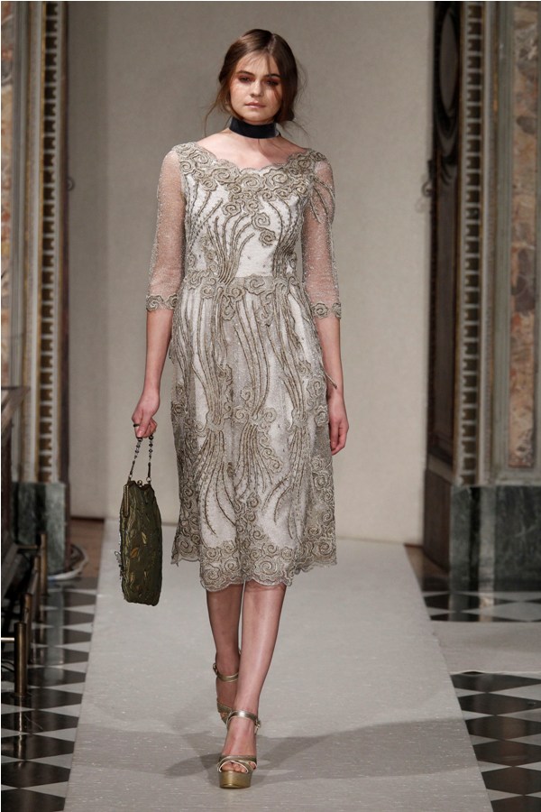 Equilibrio tra struttura e fluidità, alternanza tra lunghezze midi e maxi -piccole e garbate “infiltrazioni” di mini!-, armonia tra i capi da giorno e quelli destinati al calar della sera. Tailleur dalle giacche sagomate e dalle gonne accostate al corpo o simili a corolle; stampe sofisticate e delicatissime per impreziosire il raso di seta in contrasto con il tweed lavorato a intarsio; fitte plissettature sulle maniche delle camicie oversize e sui bordi delle gonne fluttuanti e morbide; geometrie inedite dagli effetti tridimensionali e innovativi sugli abitini svelti e portabilissimi; alcantara usata come fosse una seconda pelle; pizzi romantici e impalpabili con effetto camaieu; nastri di velluto intonati ai colori-base al collo e fra i capelli; lavorazioni a filigrana negli splendidi abiti da cocktail forse a occhieggiare i gioielli rinascimentali e le atmosfere evocate dal palazzo ospitante. Quasi un ripasso della storia del costume.
