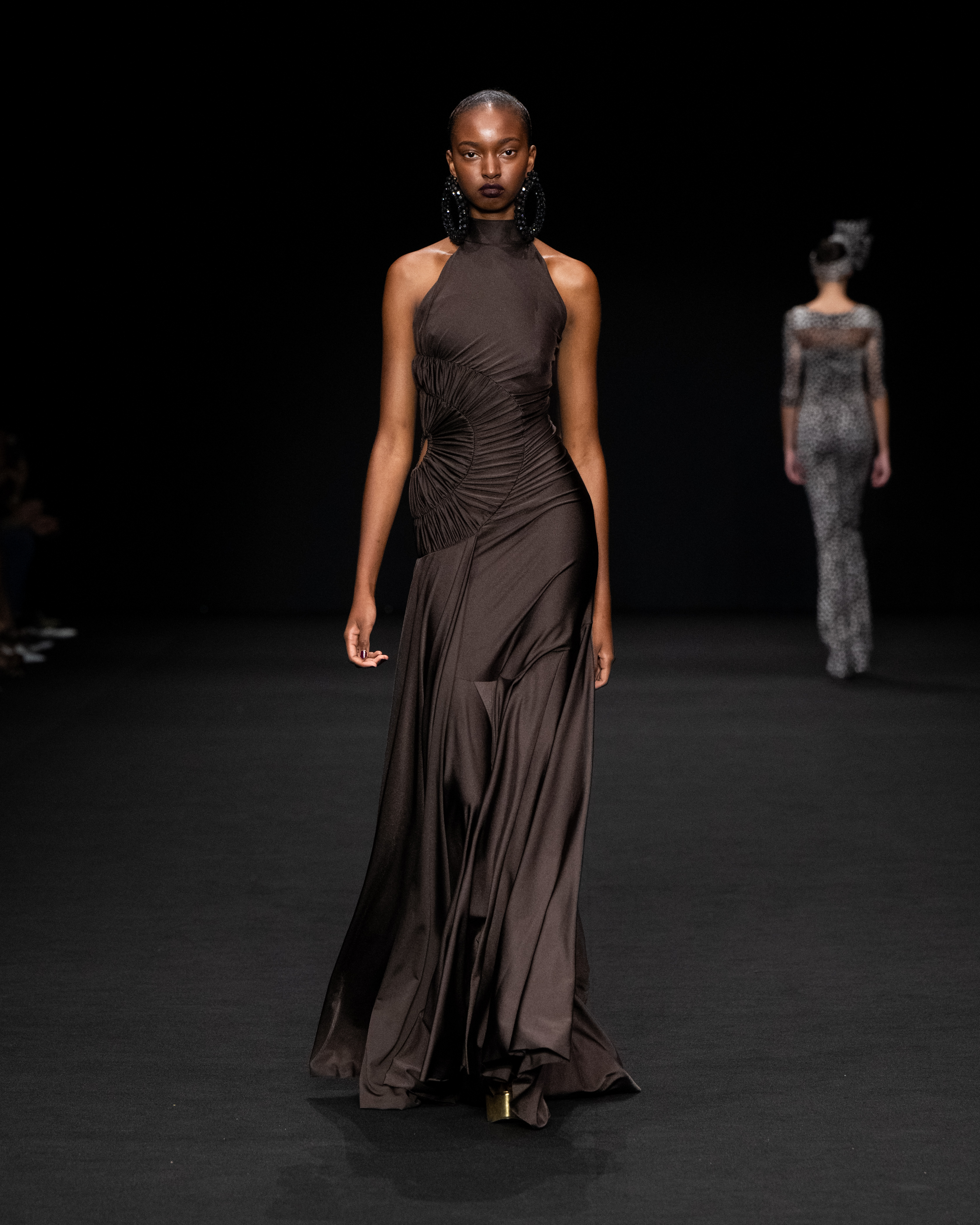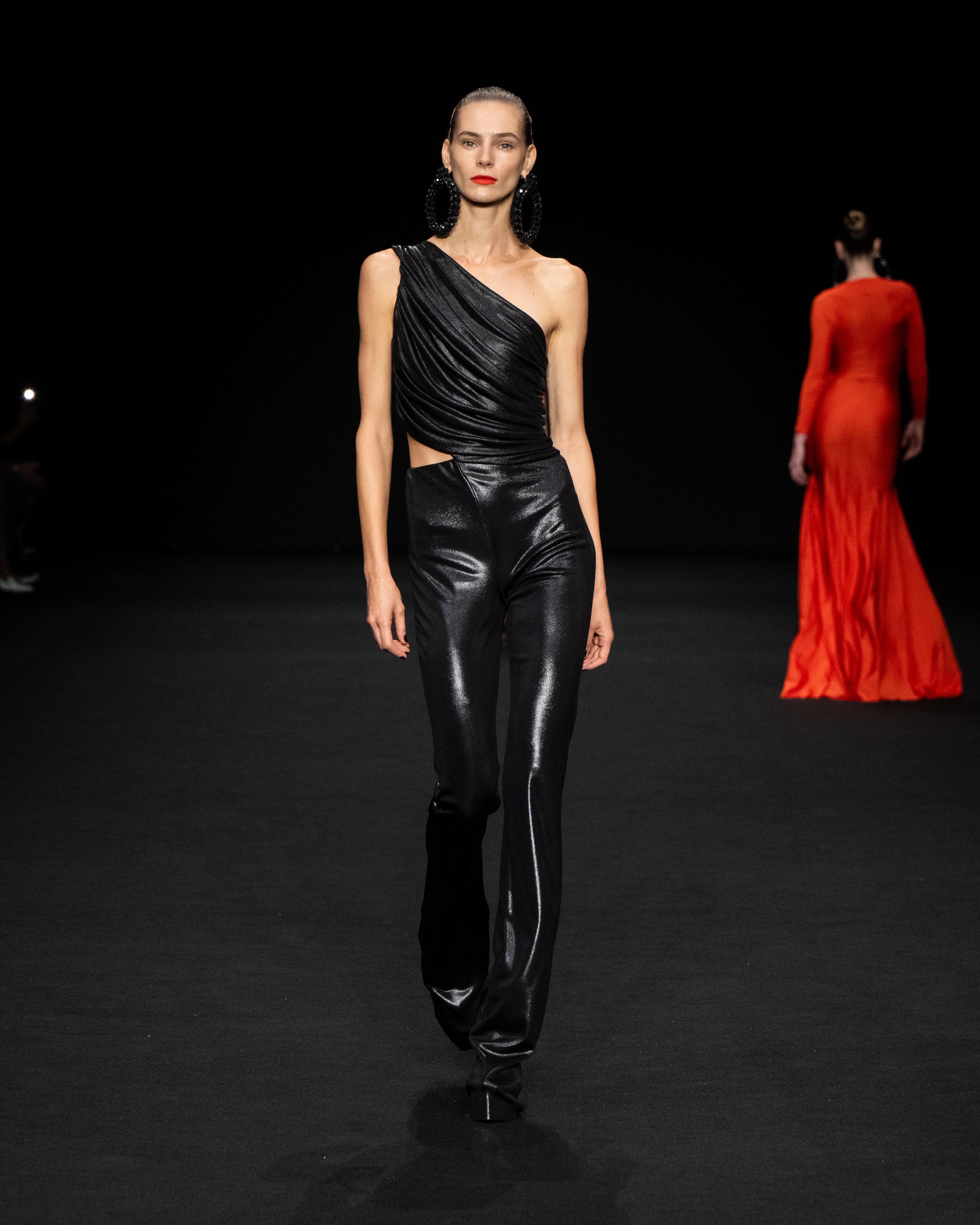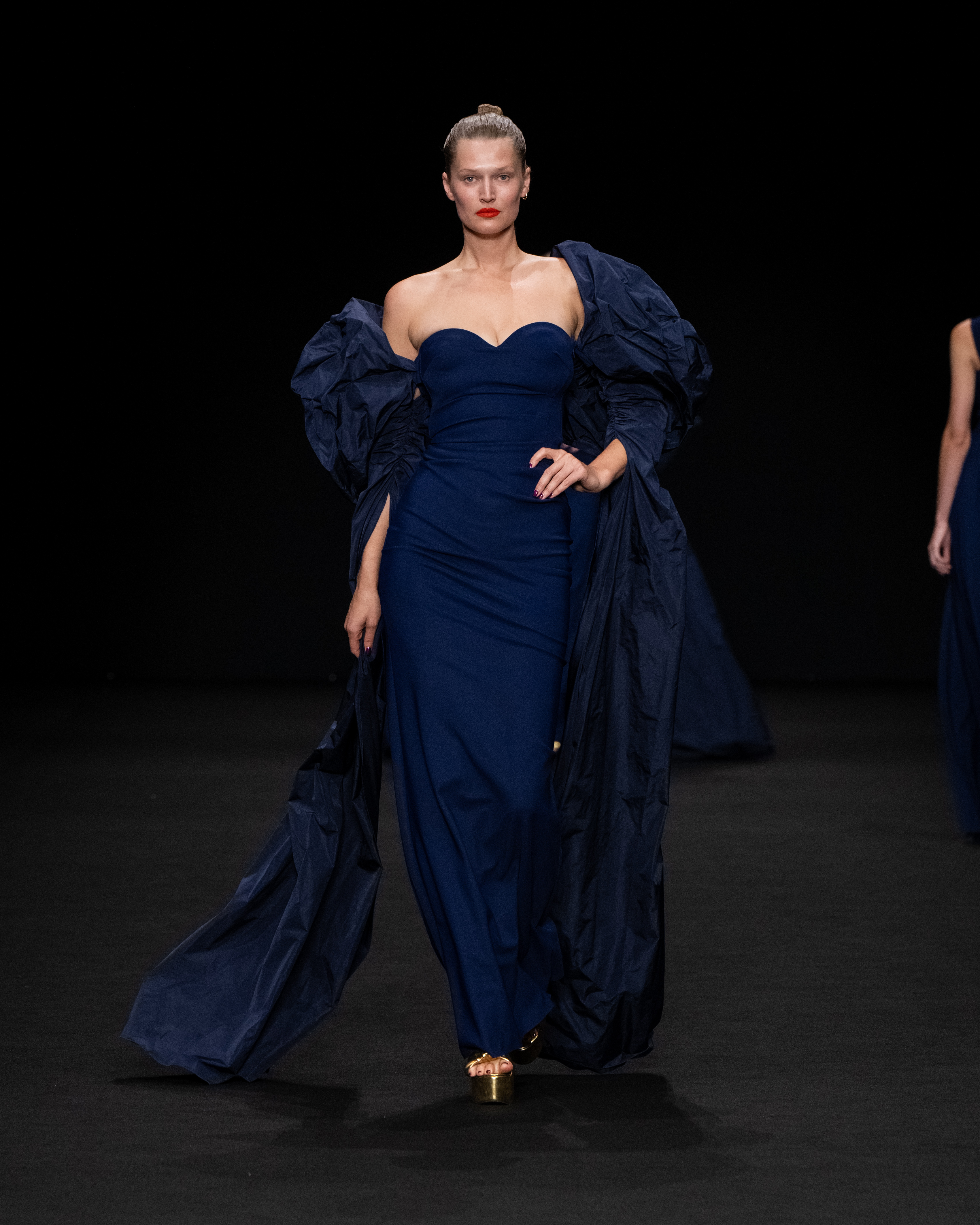 I tessuti sono particolarmente importanti per l’esito della intera collezione, come abbiamo detto permettono un confort unico agli abiti più aderenti. Sono nuovi tessuti jersey, morbidissimi e leggermente contenitivi; raso ultraleggero; taffetà per gli abiti e le cappe di chiusura.