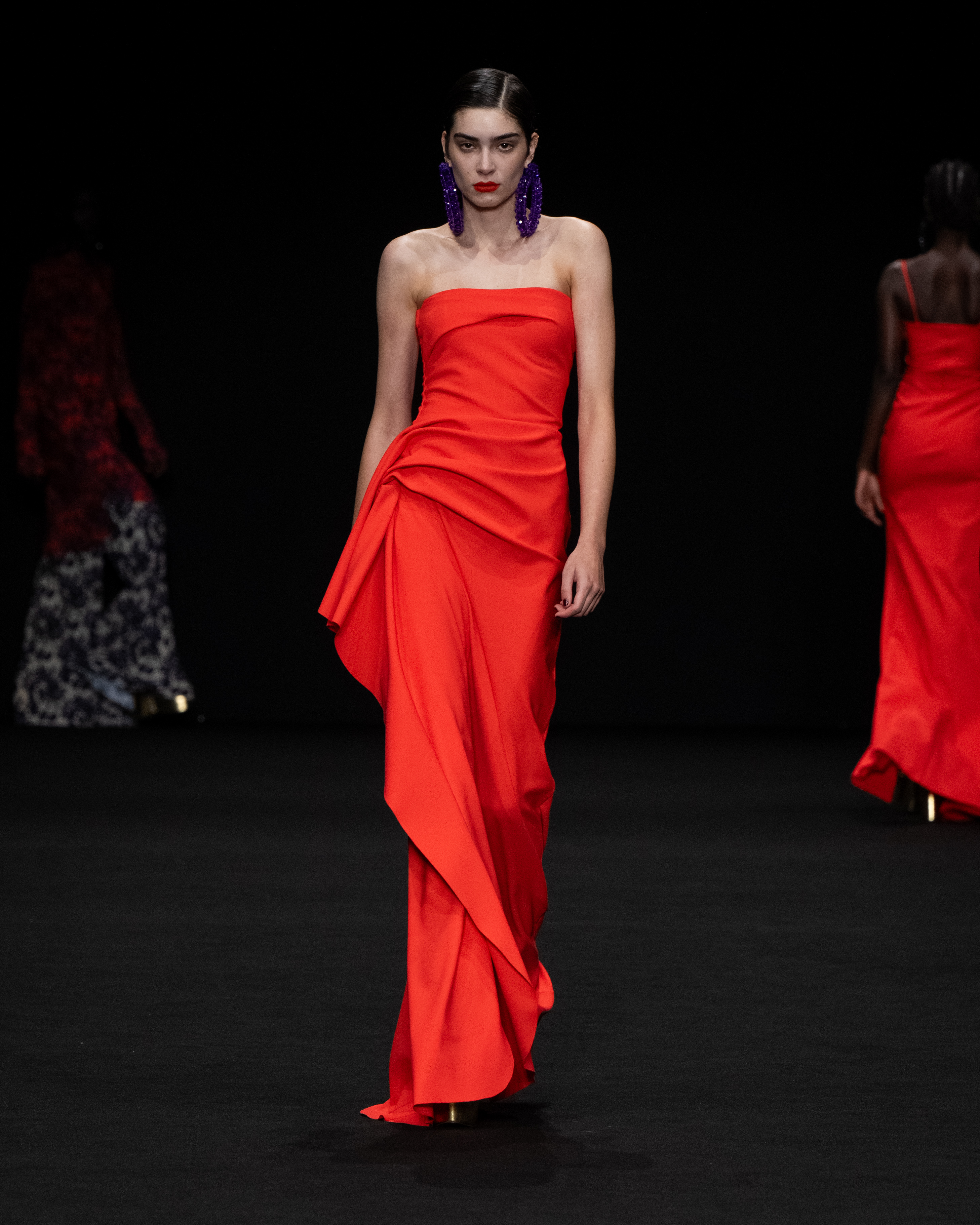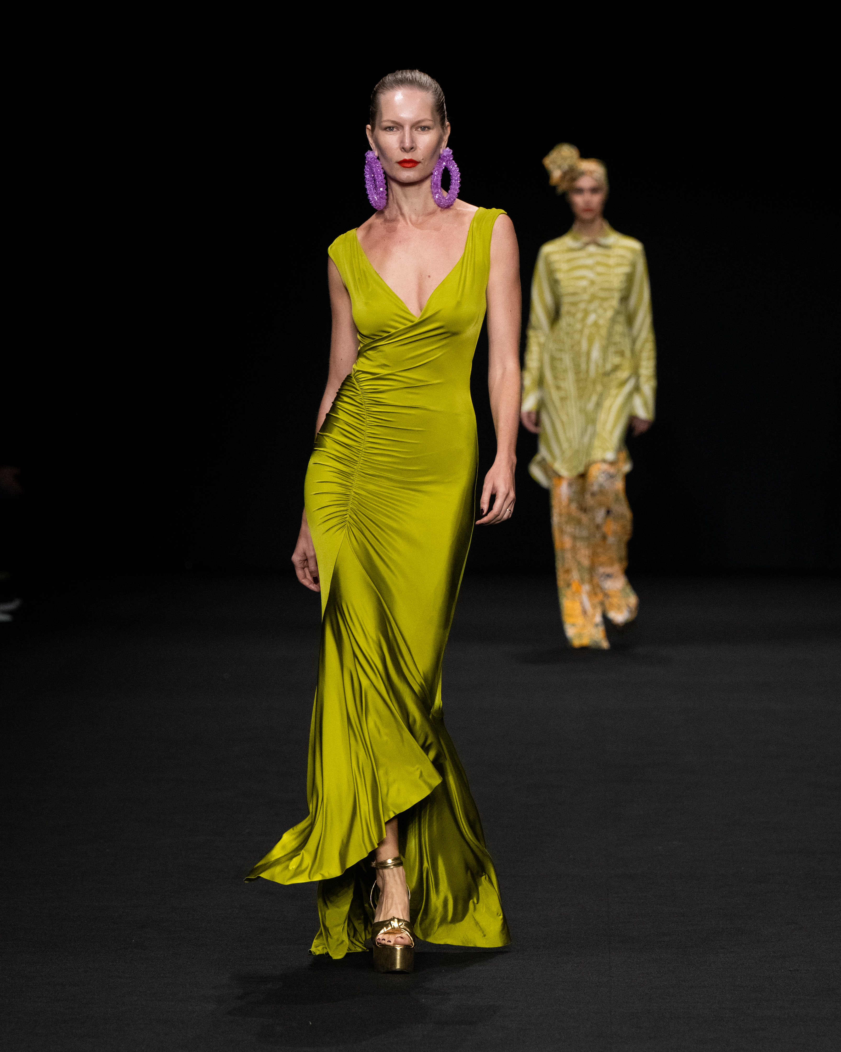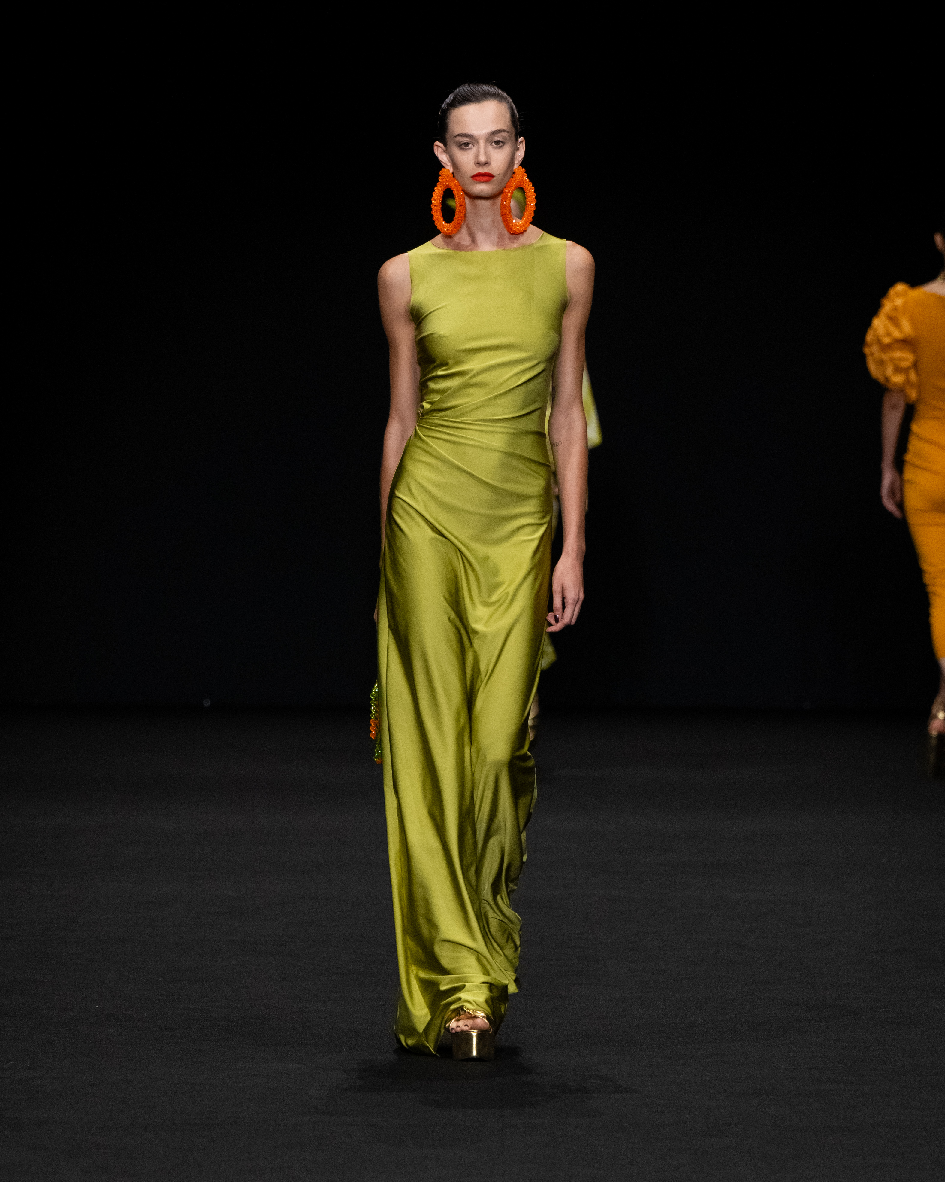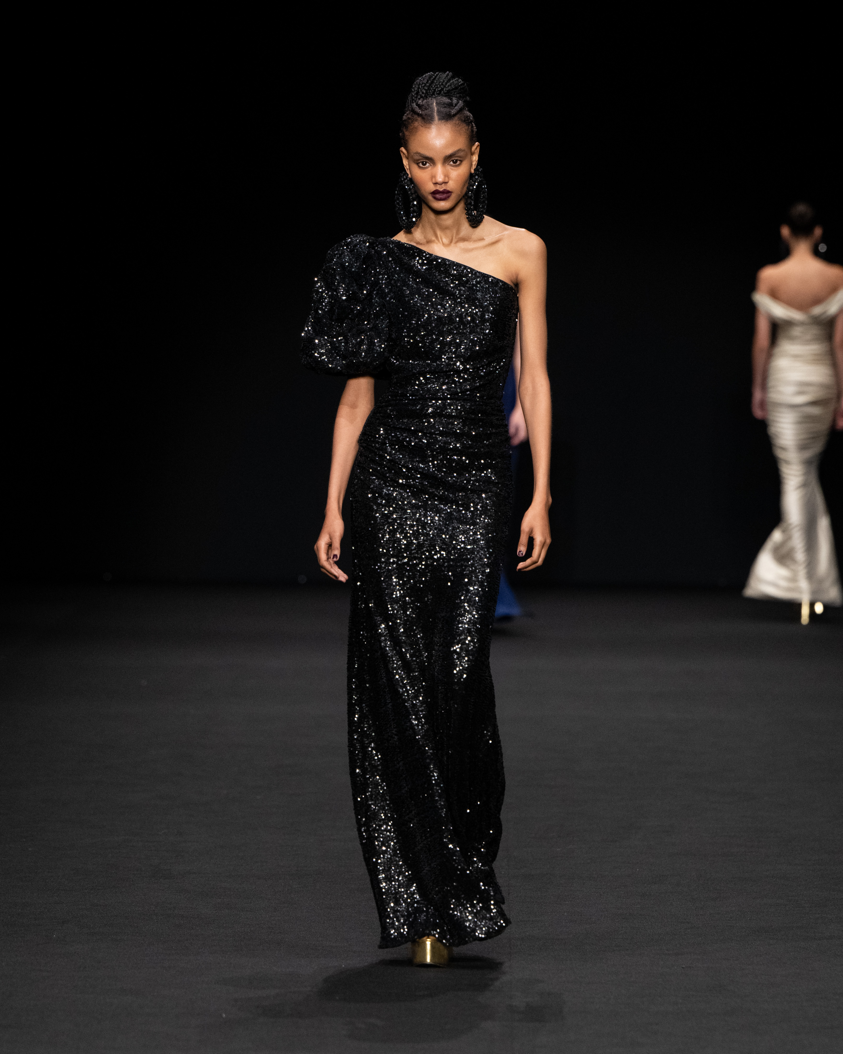 I tessuti sono particolarmente importanti per l’esito della intera collezione, come abbiamo detto permettono un confort unico agli abiti più aderenti. Sono nuovi tessuti jersey, morbidissimi e leggermente contenitivi; raso ultraleggero; taffetà per gli abiti e le cappe di chiusura.