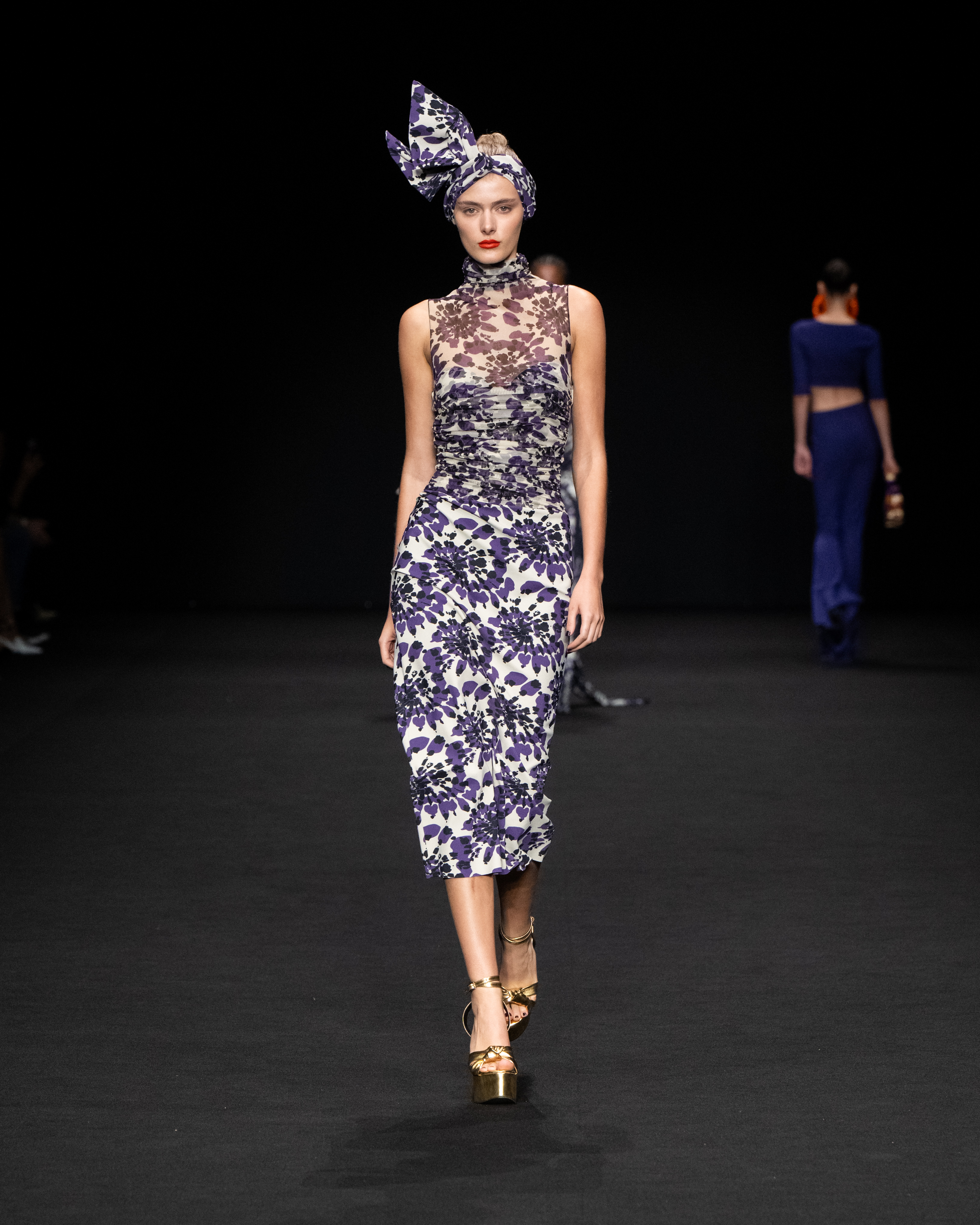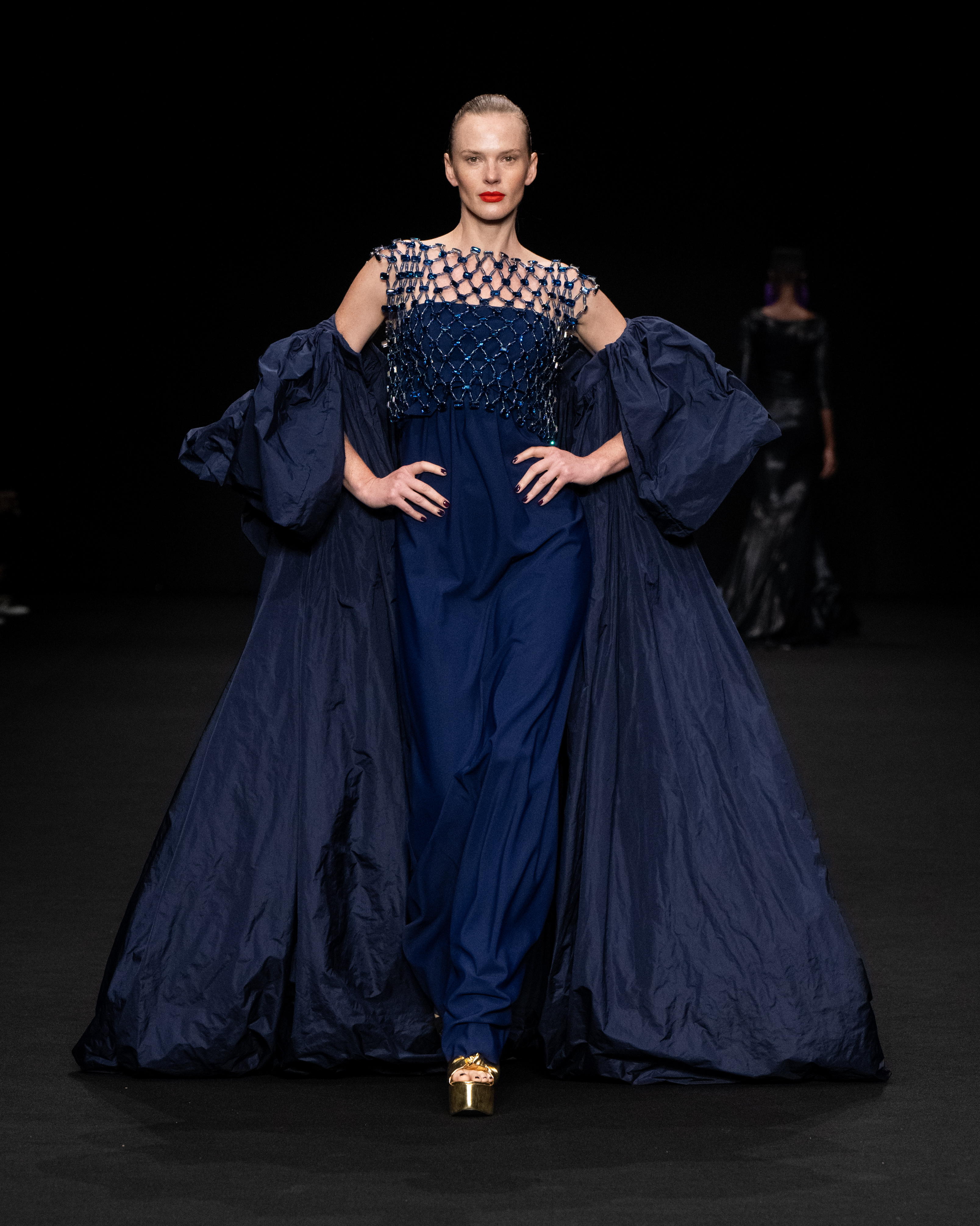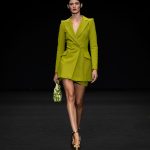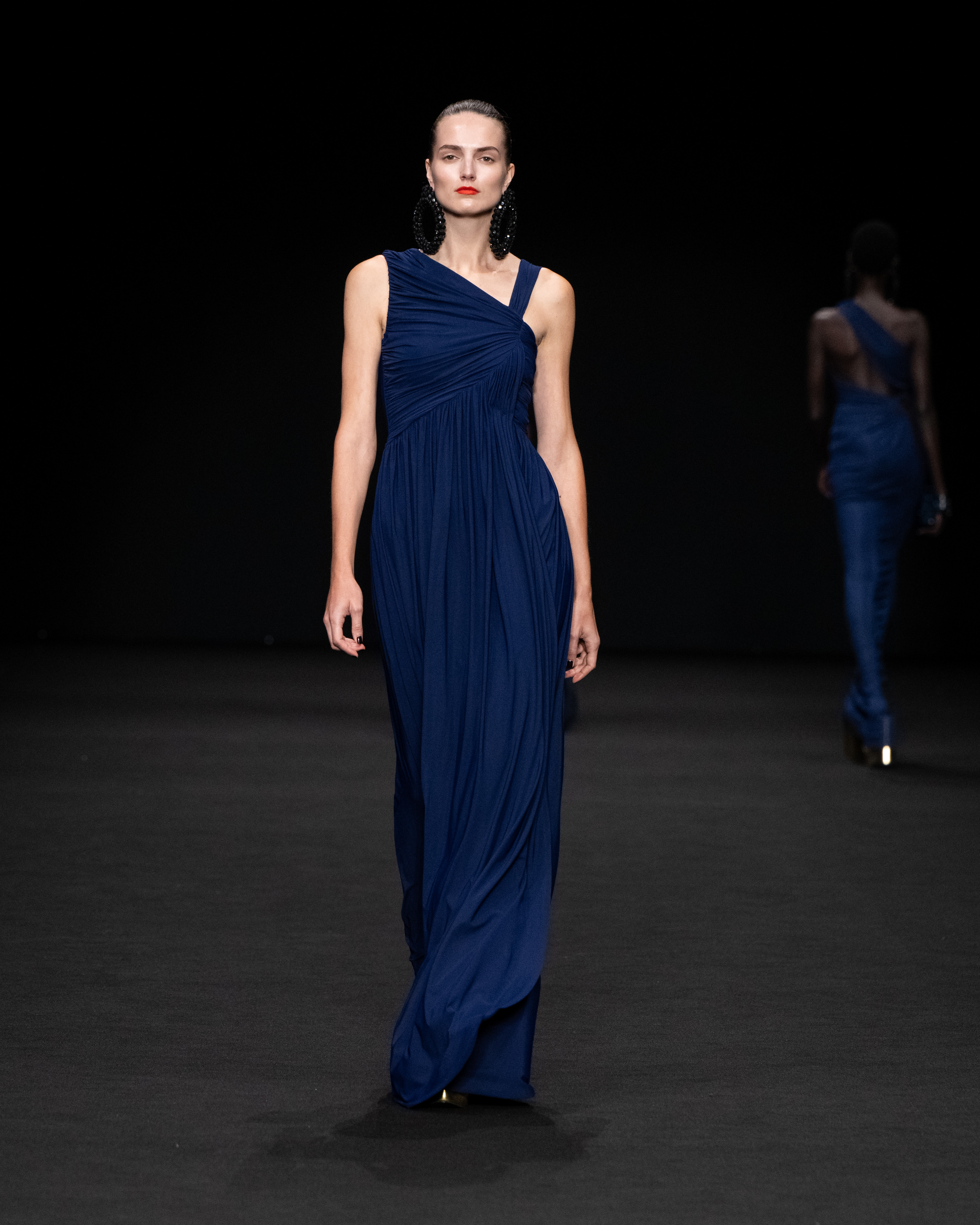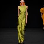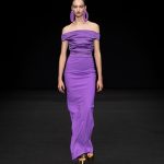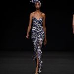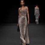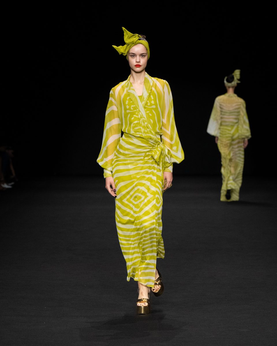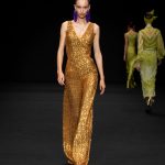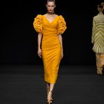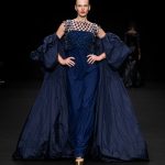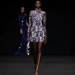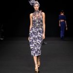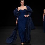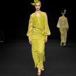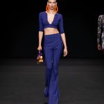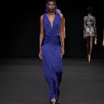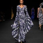 Non solo abiti, ma anche completi in stile pigiama con stessuti di stampe diverse; con max maniche che il tessuto leggero movimenta dando morbidezza e dinamicità, ma anche un po’ di ingombro data l’eccessiva lunghezza. Di effetto i due abiti che chiudono la sfilata – uno la ha anche aperto con Drusilla Foer- in blu notte corredati da una cappa molto scenografica dello stesso tessuto e colore.