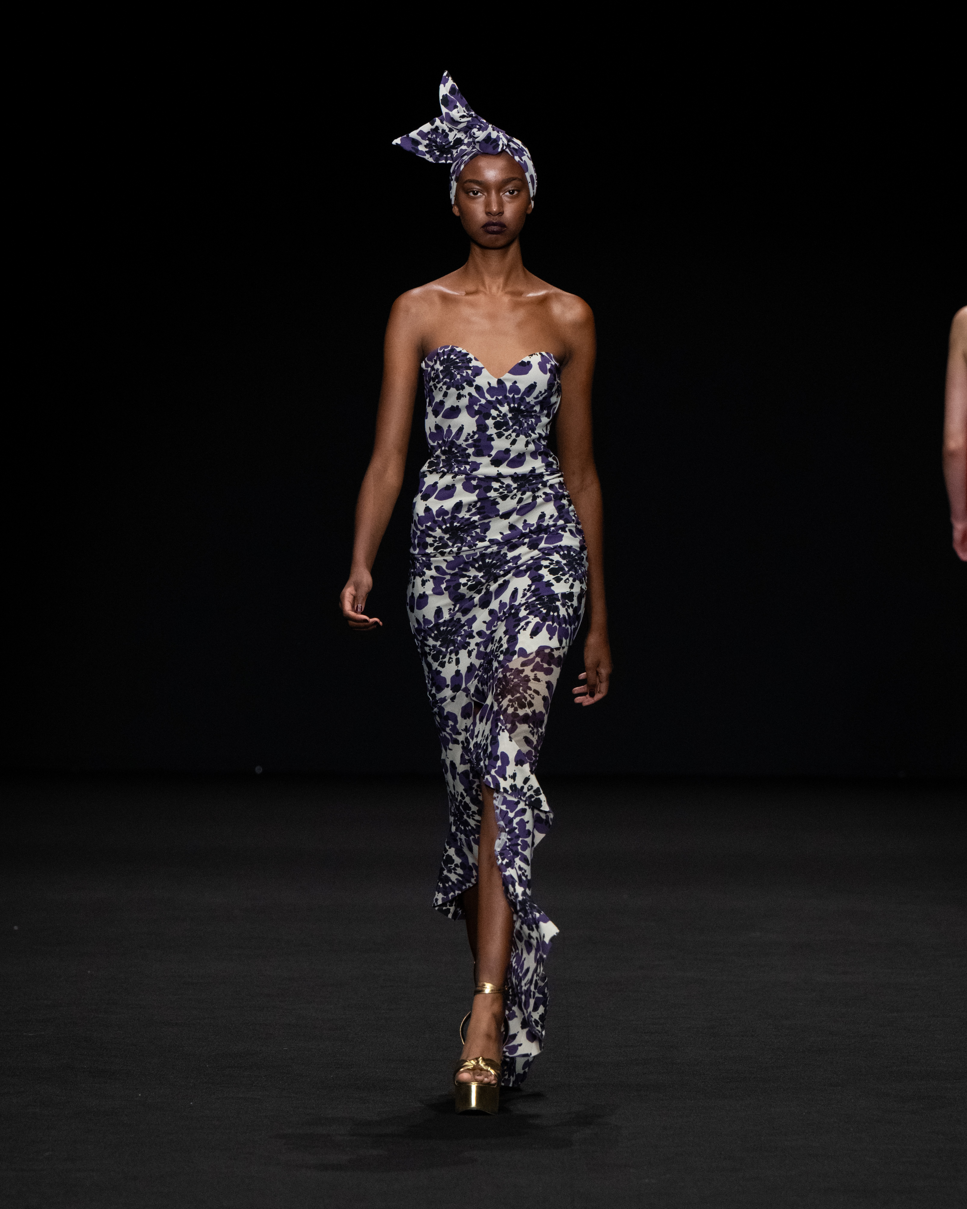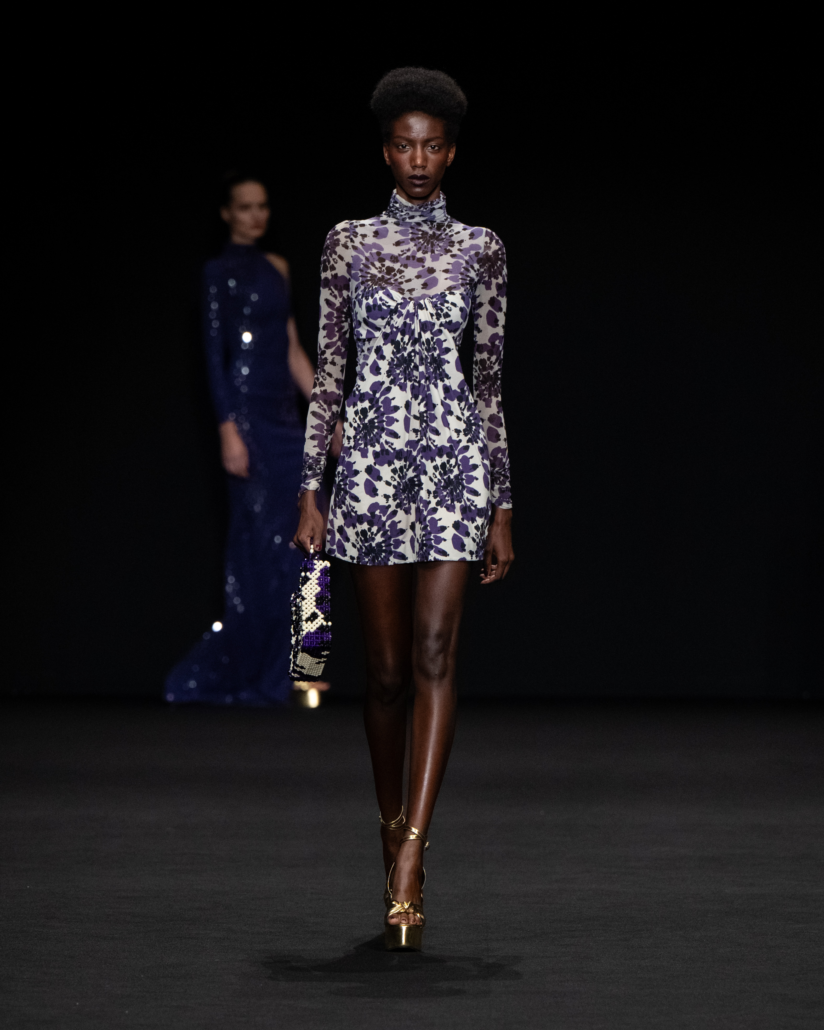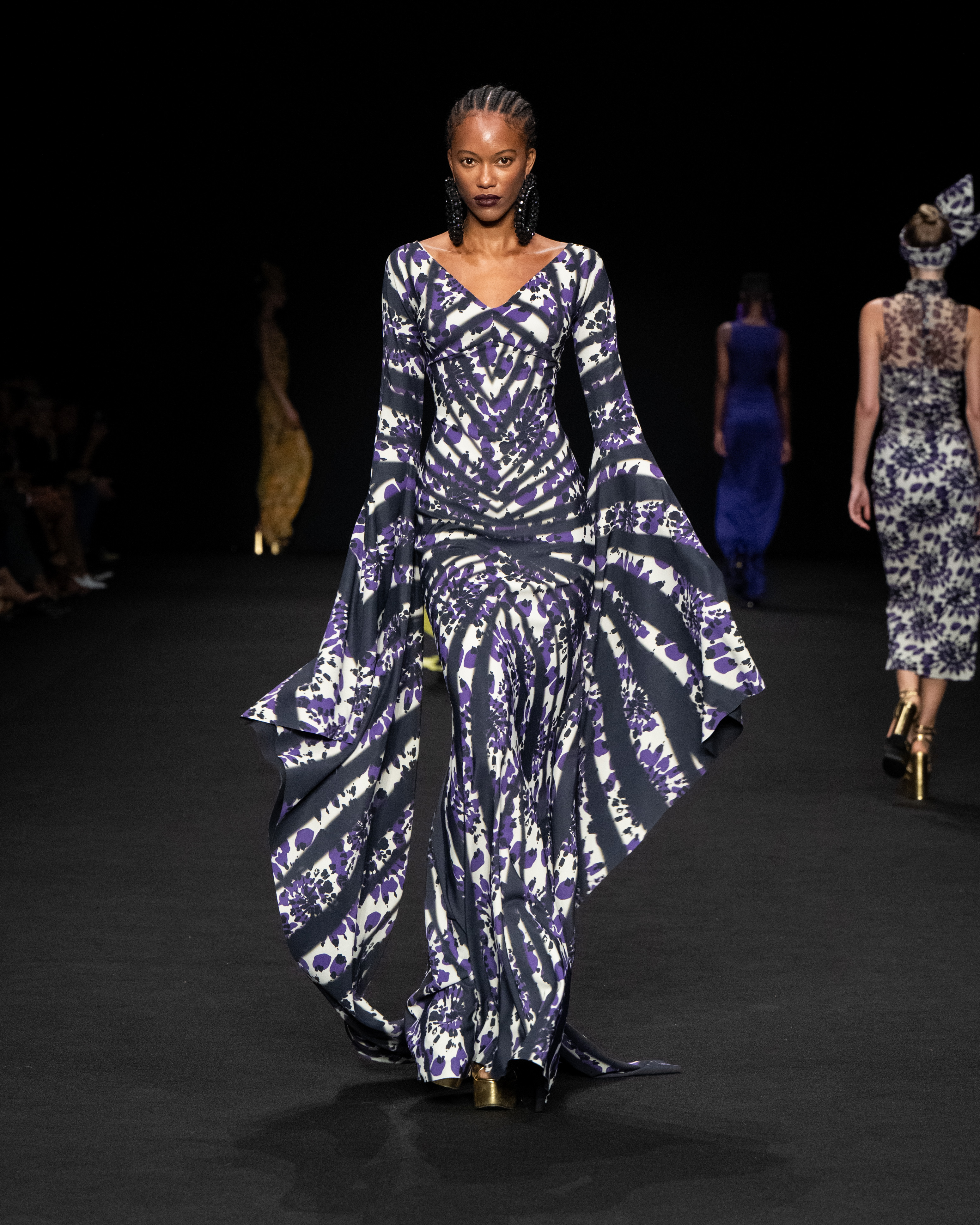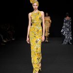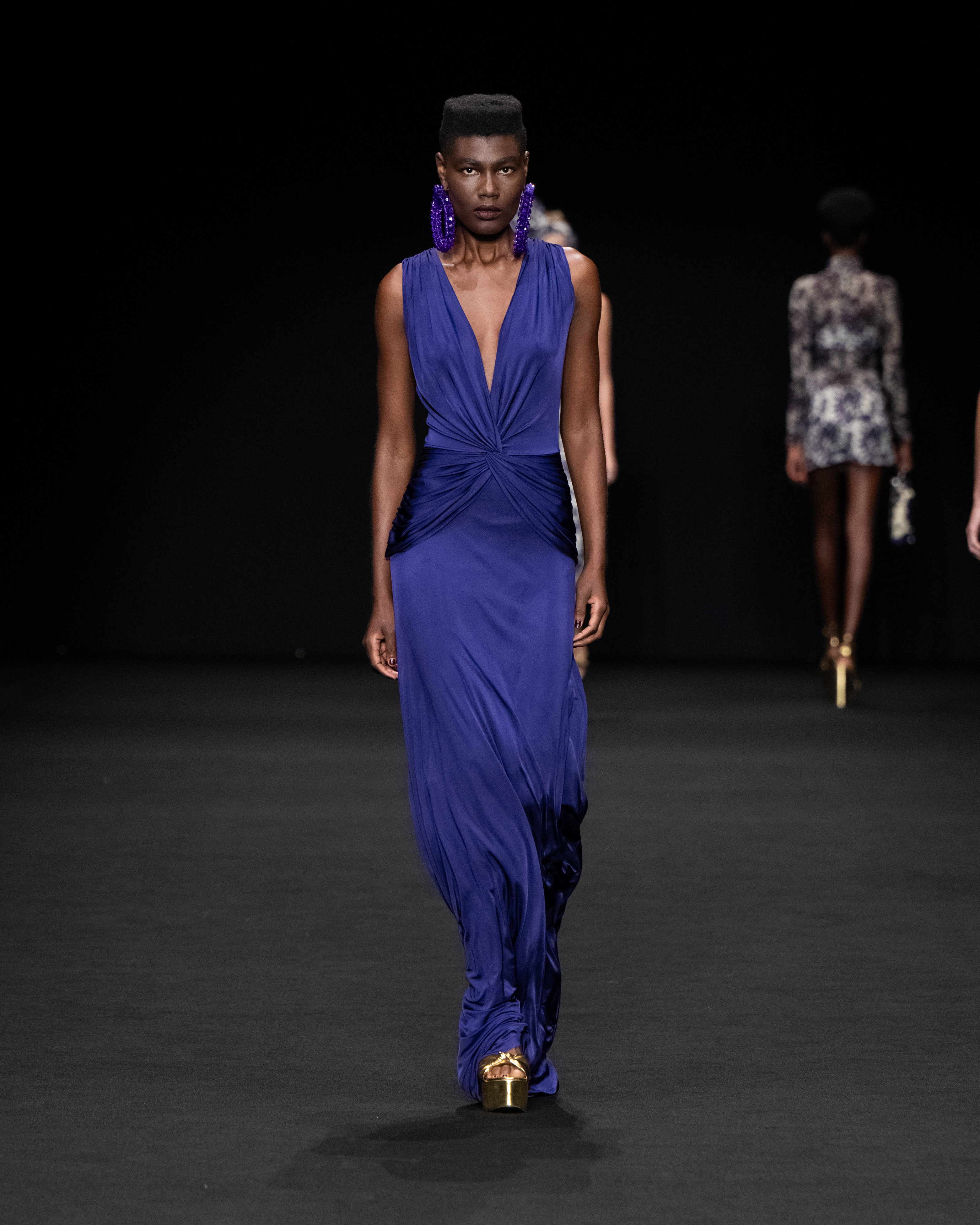 Non solo abiti, ma anche completi in stile pigiama con stessuti di stampe diverse; con max maniche che il tessuto leggero movimenta dando morbidezza e dinamicità, ma anche un po’ di ingombro data l’eccessiva lunghezza. Di effetto i due abiti che chiudono la sfilata – uno la ha anche aperto con Drusilla Foer- in blu notte corredati da una cappa molto scenografica dello stesso tessuto e colore.