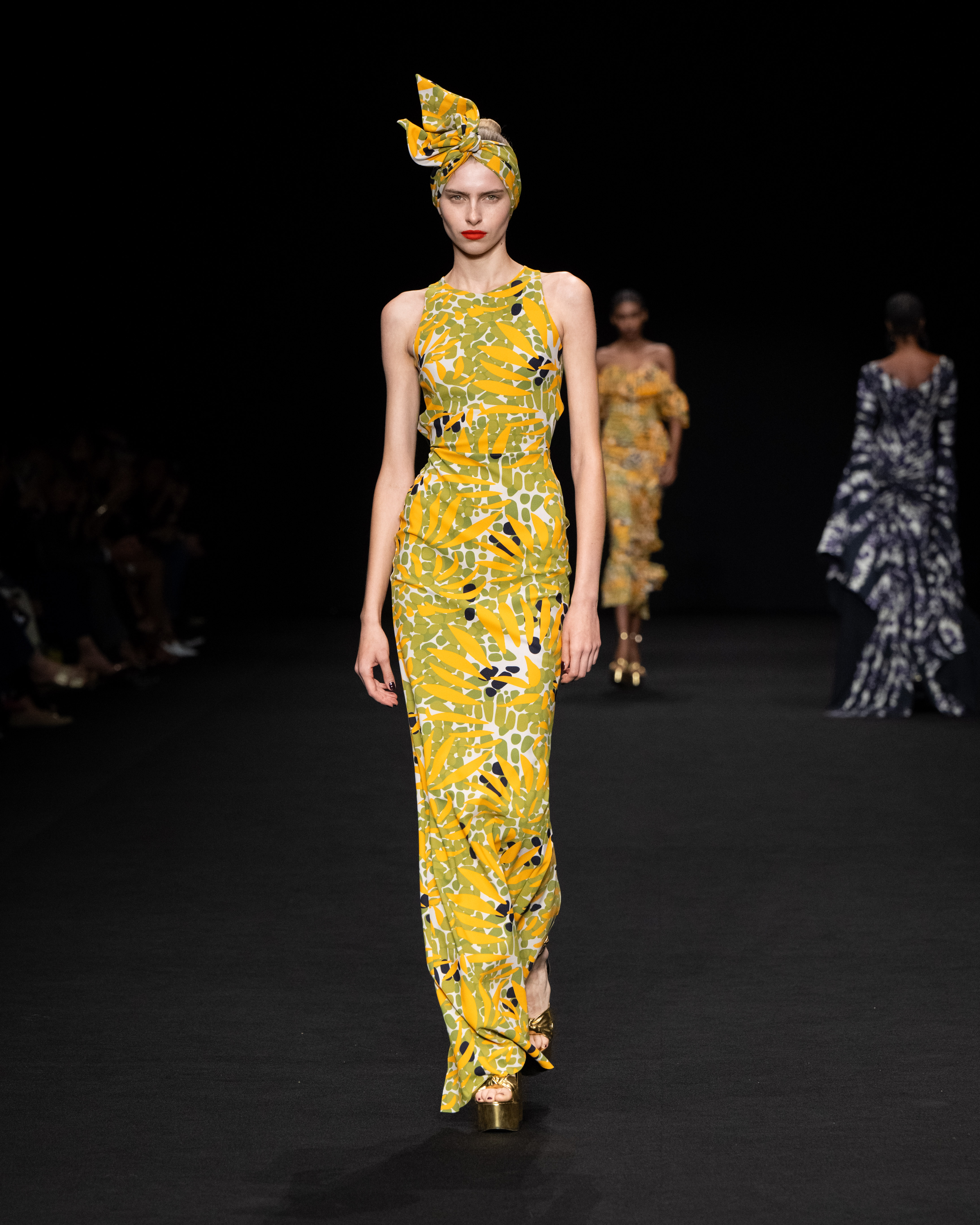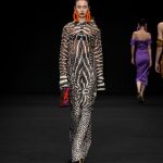 Interessanti le stampe a zebra o a macchie di giaguaro che rivelano l’ispirazione esotica della collezione spesso corredata da turbanti dello stesso tessuto; più classiche le personali interpretazioni grafiche dei tradizionali motivi di stampe per cravatte.