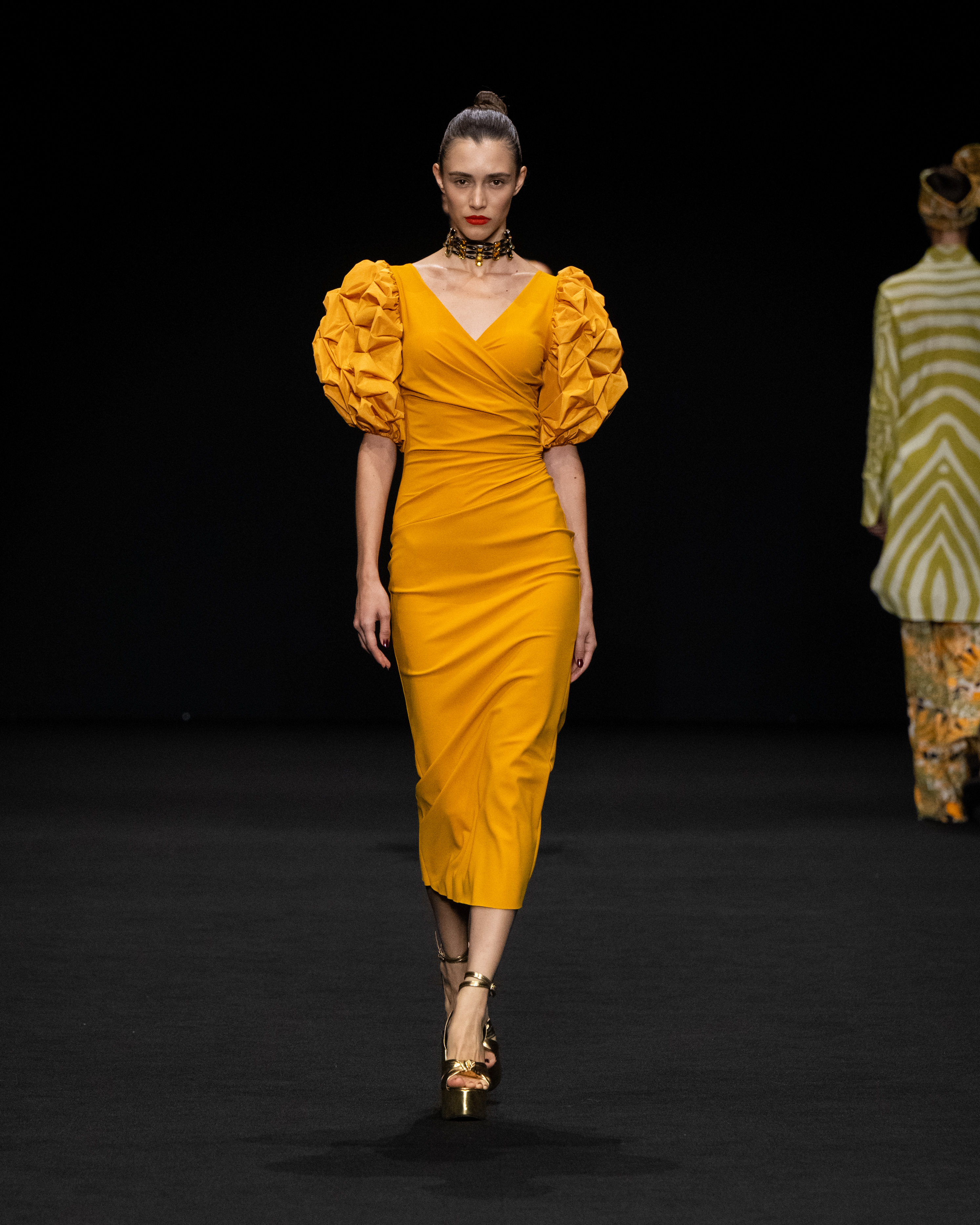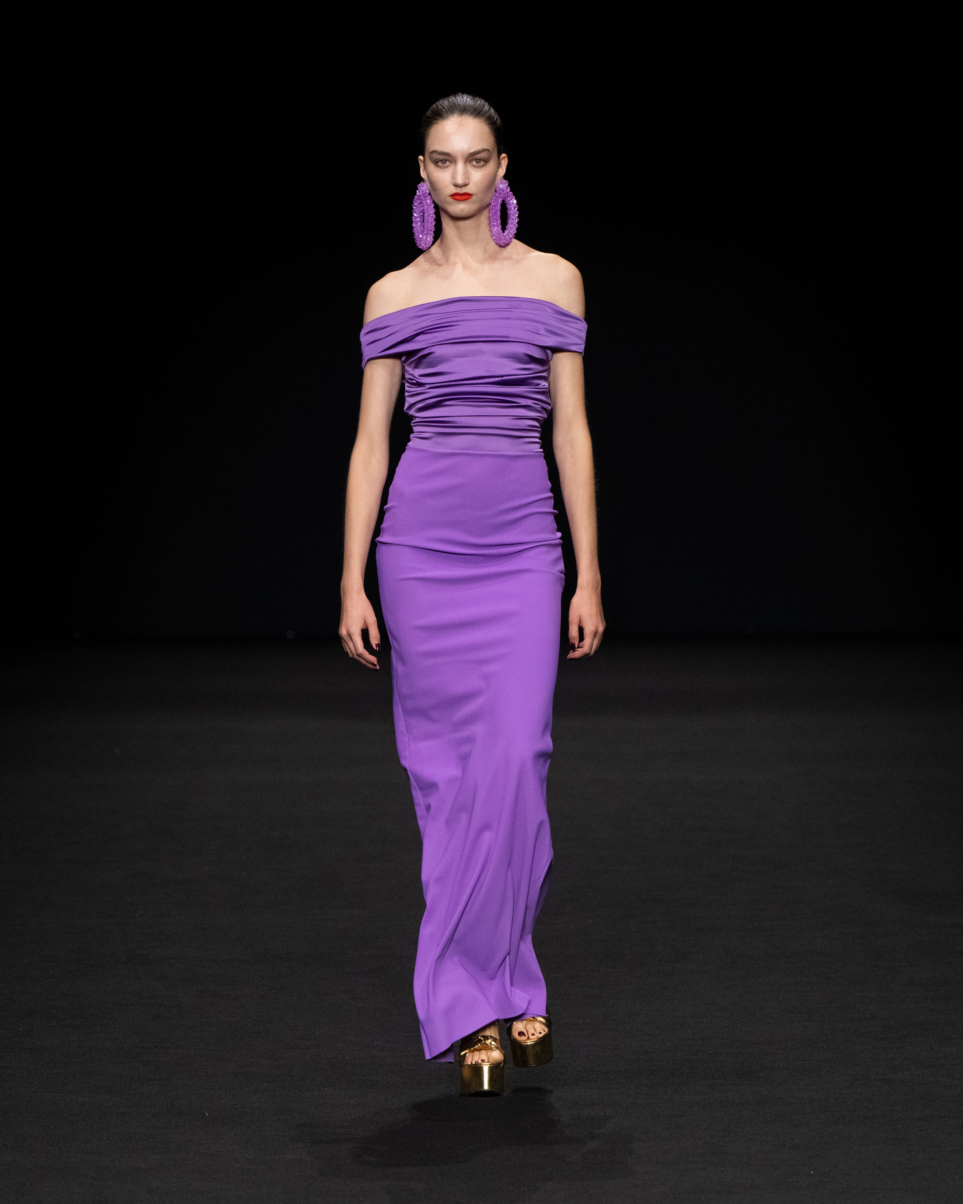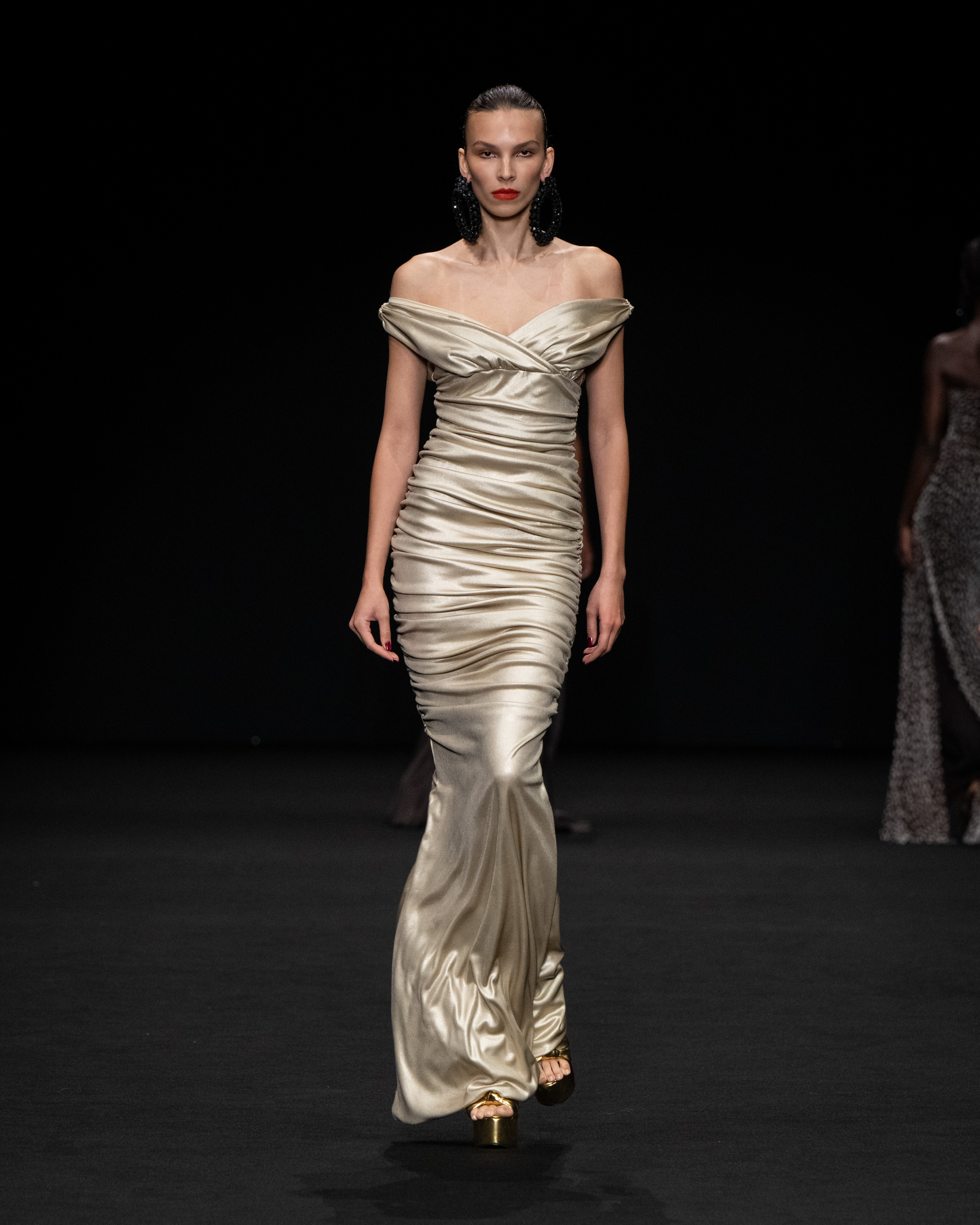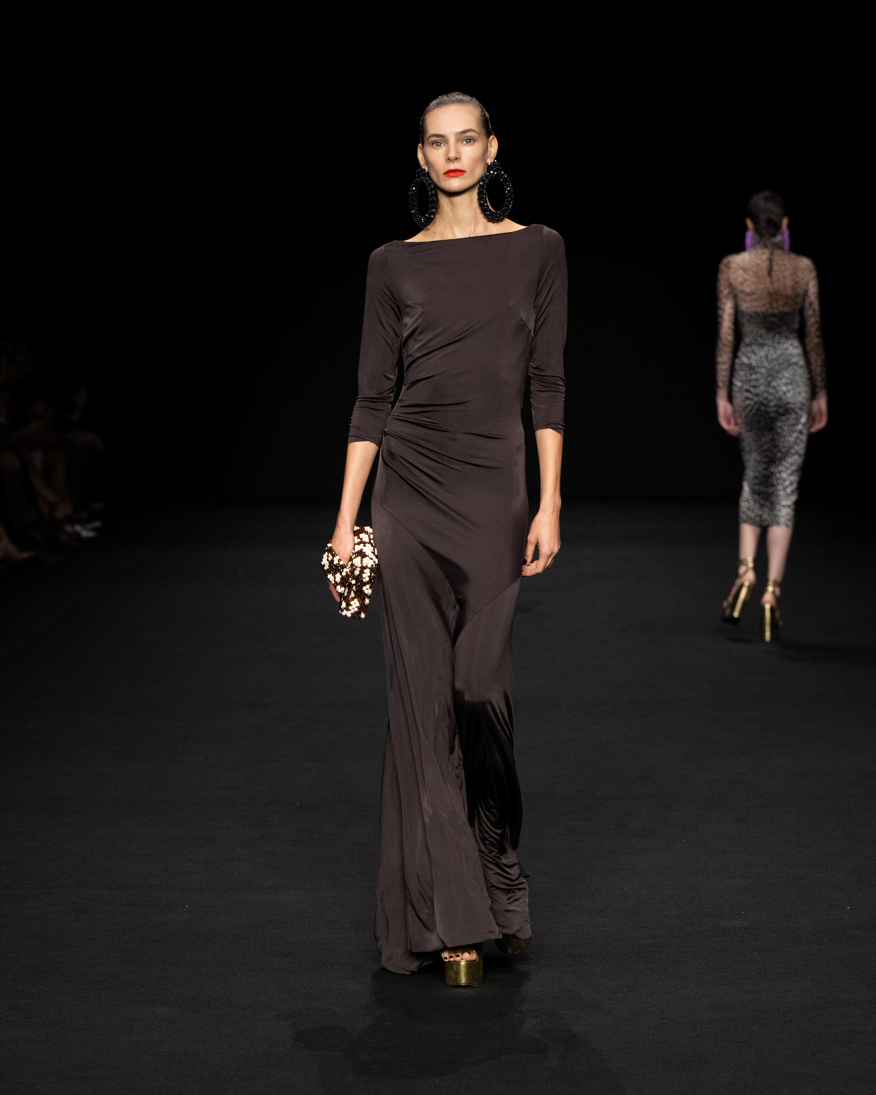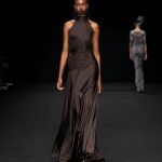 Una collezione iper-glamour che non rinuncia al confort. Da una parte la silhouette fasciante dell’abito esalta la figura femminile; i materiali stretch dall’altro, grazie anche al drappeggio, la liberano da rigidezza, dandole quel tanto di dinamicità che le permettono di mantenere un look elegante e raffinato. Tutto ciò ci ricorda -e possiamo ben applicarlo a pensiero della nostra stilista-, quanto asseriva la costumista Edith Head vincitrice di molti Oscar: “Un abito dovrebbe essere stretto abbastanza per mostrare che sei una donna e sufficientemente morbido da provare che sei una signora.”
