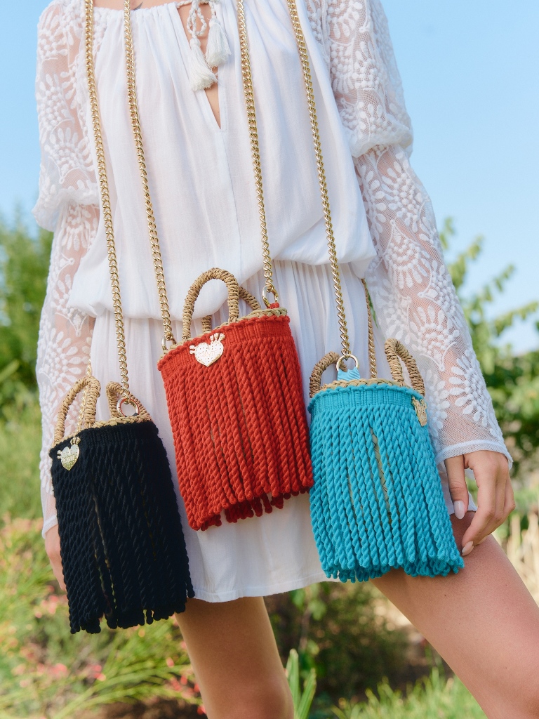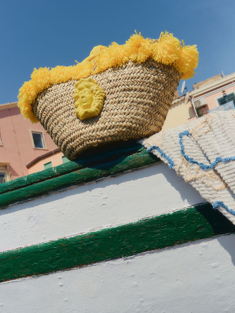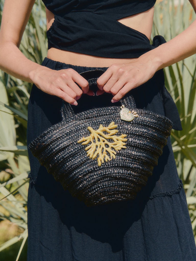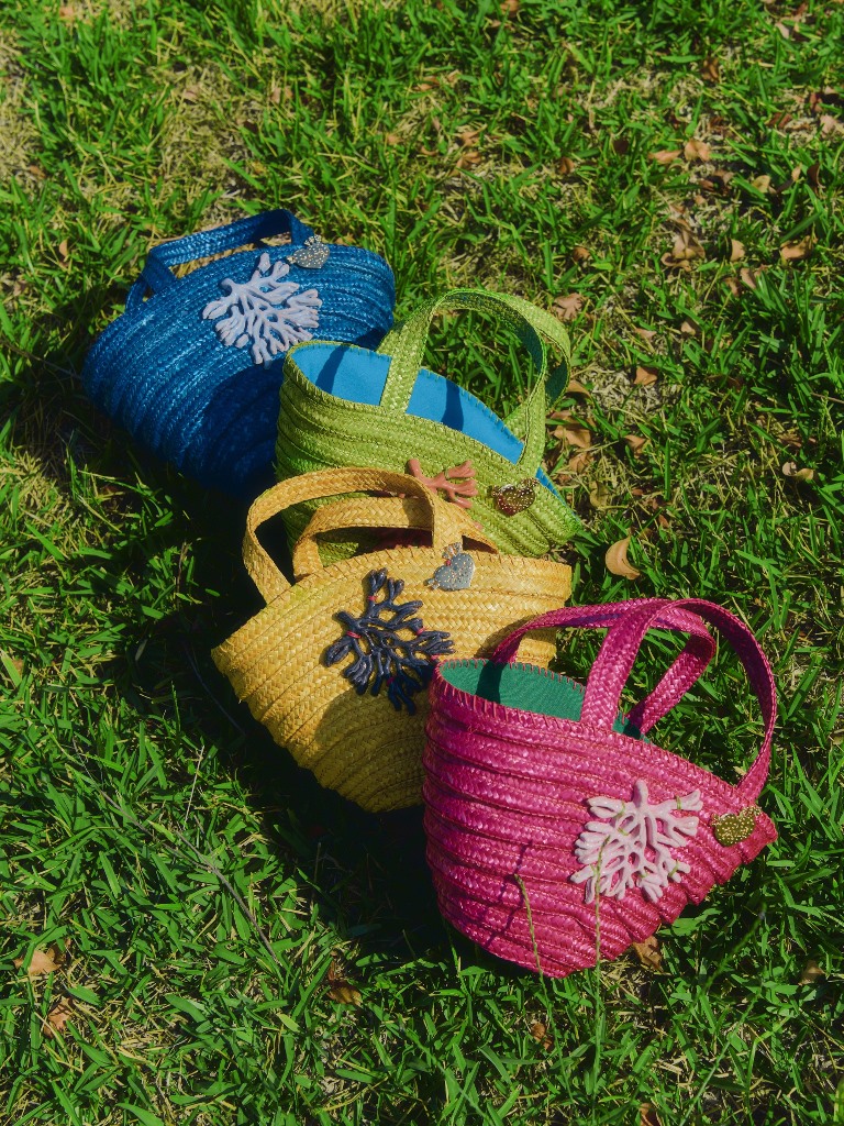 Coralline è un’ode alla storia vibrante e senza tempo della terra sicula della stilista in cui ogni borsa è incarnazione di ogni sfaccettatura della Sicilia. Coffette in paglia colorata con elementi decorativi in ceramica o metallo sono caratterizzate da nuances riecheggianti il colori della Sicilia: i toni del giallo sono i colori morbidi e arrossati dell’alba, i toni del blu un cielo limpido e sereno, quelli del verde a celebrare la natura rigogliosa e vibrante dell’isola, il fucsia in omaggio alla vivacità e all’intensità dei suoni dei mercati fino al nero, che ricorda le misteriose e profonde sfumature del mare di notte.
