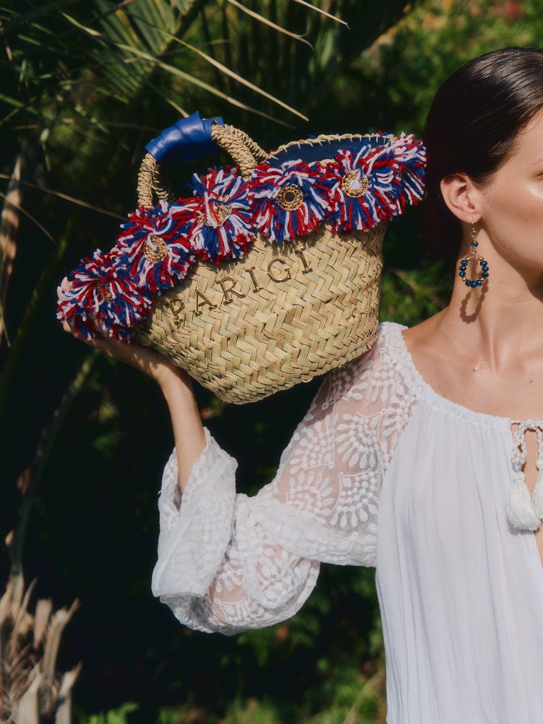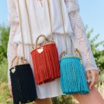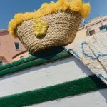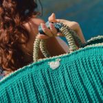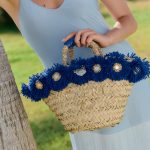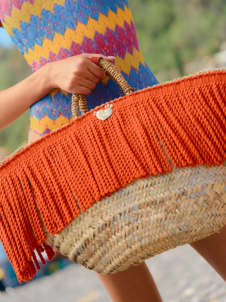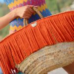 Frinza (frangia) omaggio al dialetto siciliano. Coffe maxi e coffette in palma, contraddistinte da frange variopinte completano il look se coordinate al cappello di paglia.