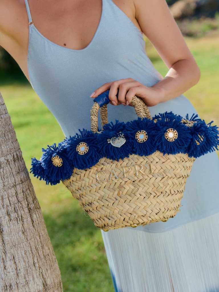 Colourdrops nasce dai colori della costa, dove le onde azzurre baciano le coste dorate e dove gli echi di antiche tradizioni sussurrano nel tempo. Due le coffe ovali di questa linea con manici in pelle riciclata e leziosi pompon.