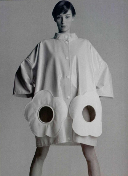 Esattamente cinquant’anni fa André Courrèges, in coppia con la moglie Coqueline Barrière, lanciava la collezione “Space-age look”, che apriva la strada ad uno stile modernista e innovativo, precursore della moda “spaziale” degli anni ’60, declinata in linee pure e filanti, tagli semplici e netti, colori metallici e acidi o asettici bianchi/neri, tessuti rigidi con stampe optical (in cui si inserisce l’utilizzo della plastica e del pvc).
