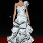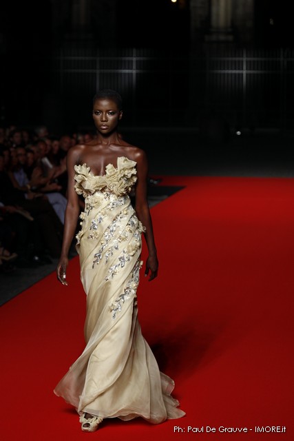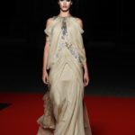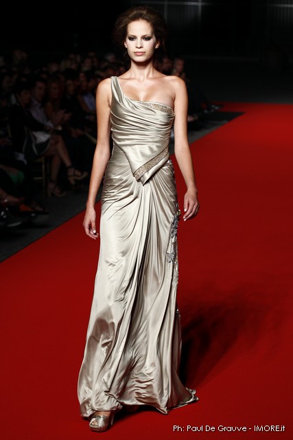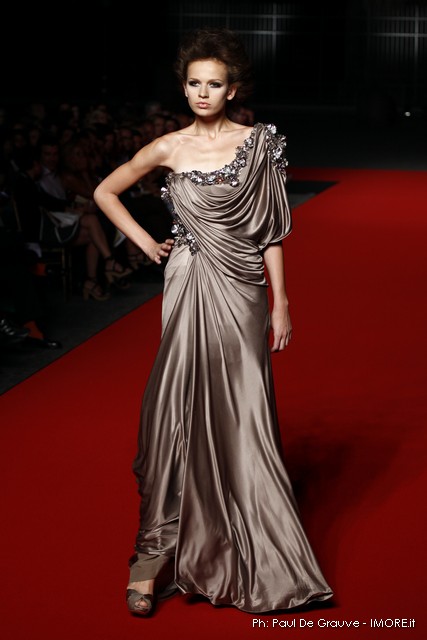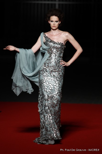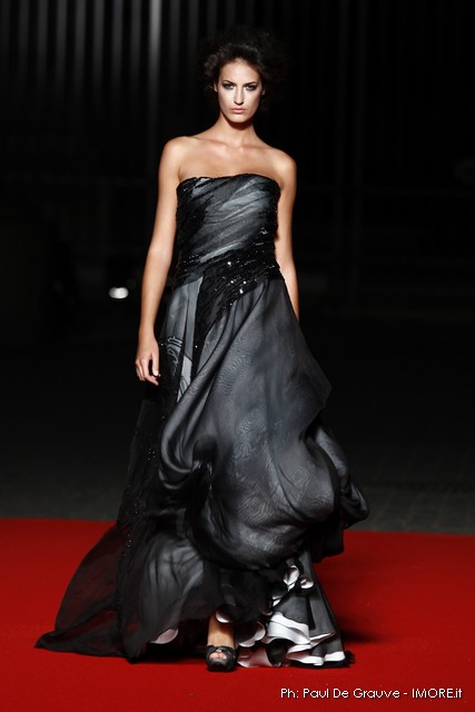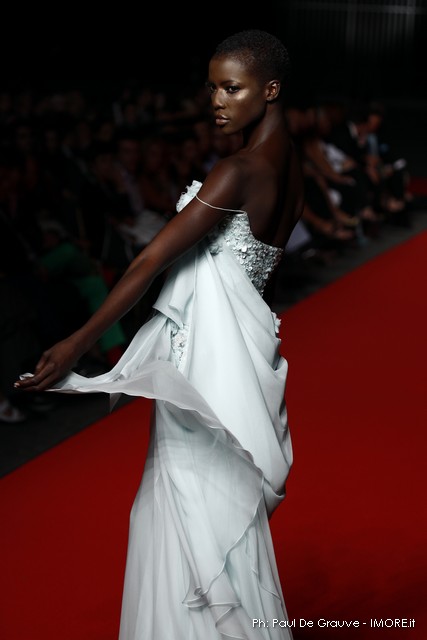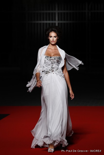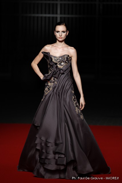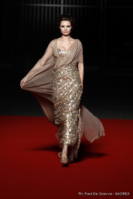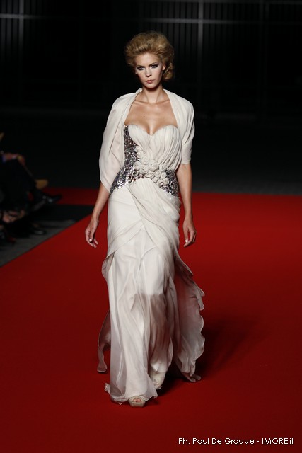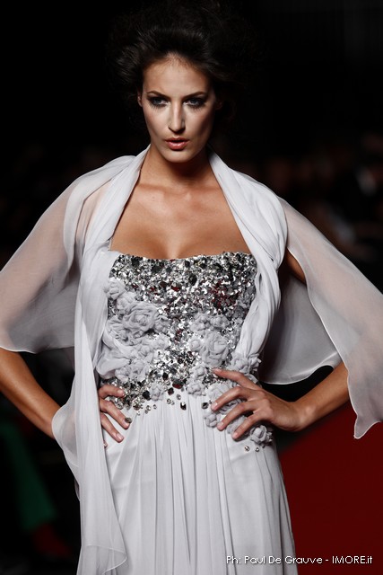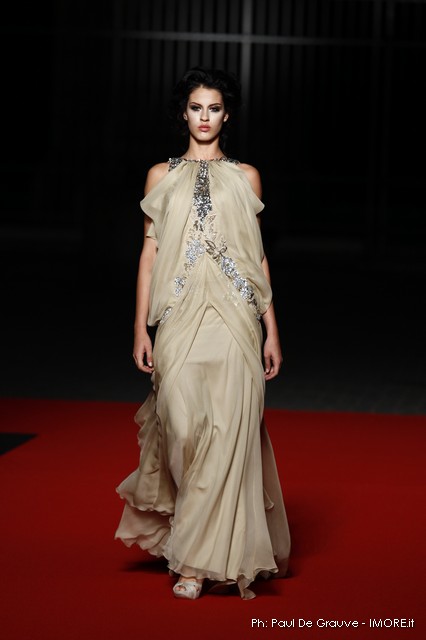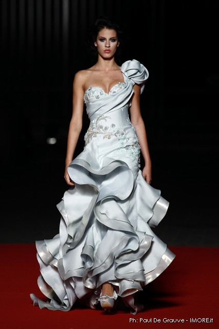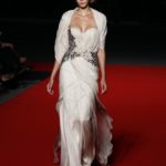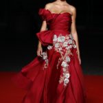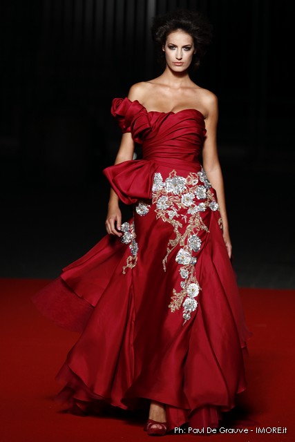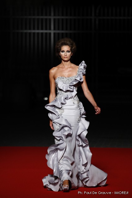 Ogni taglio possibile è esplorato, ogni tridimensionalità sfruttata, punti di luce inserite con l’uso di pietre e paillettes. Sono i ricami ad essere in primo piano, in questa proposta di stile “barocco contemporaneo” del bravo Mahfouz. Linee suadenti e morbide indirizzate alla donna elegante e chic, portano in trionfo su una passerella rosso passione la moda internazionale a Roma.