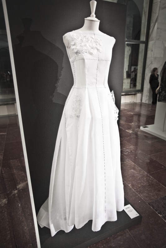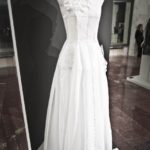 “L’abito della maison simonetta sarà rieditato in organza di seta color cipria, con la manica e la balza a ruota. Sull’organza di seta verranno applicate diverse tipologie di elaborazione, dalla stampa digitale e serigrafica fino ad un minuzioso lavoro di ricamo realizzato da matilda ricami. si crea un collage di estetiche e tecniche molto diverse tra loro che contemporaneamente possono esaltare l’apparente semplicità di questo capo. Il lavoro di reinterpretazione dell’abito si basa sullo studio di quello che per noi è il particolare più interessante della linea del capo, ovvero la manica e il fondo a ruota che concilia il nostro spirito leitmotiv con quello classico della maison simonetta”