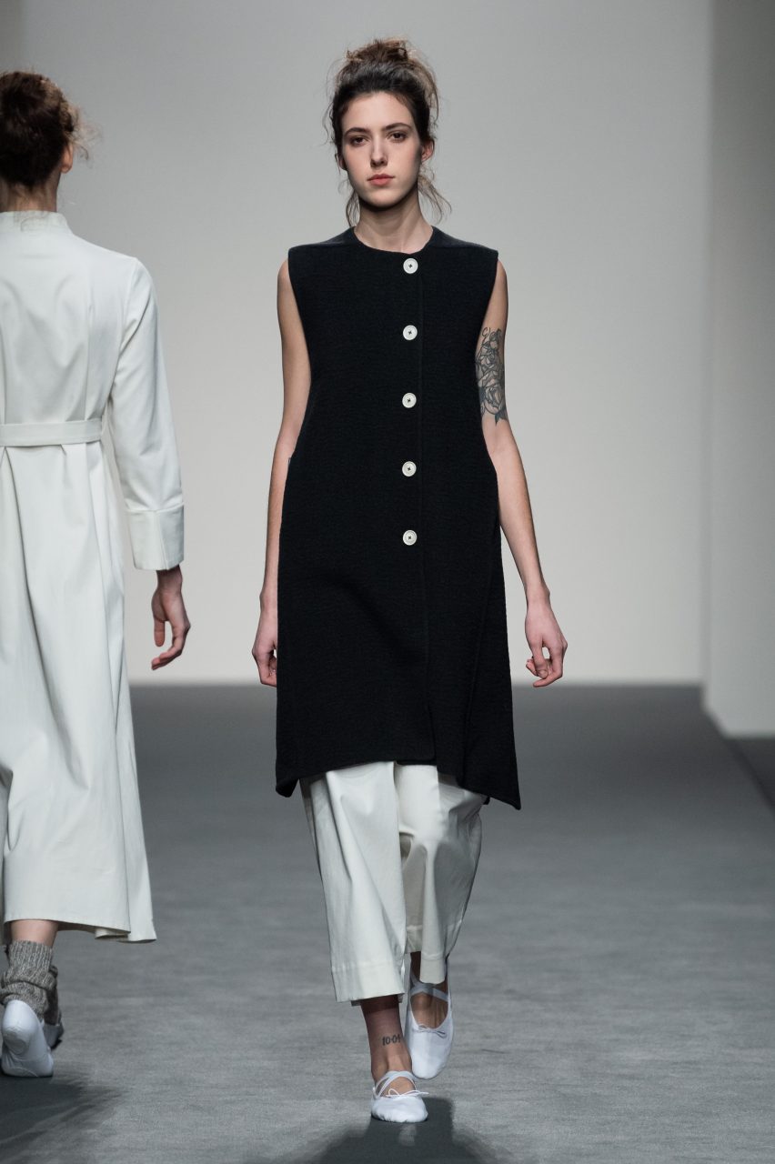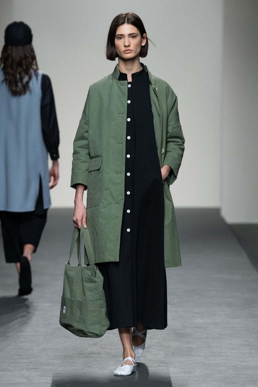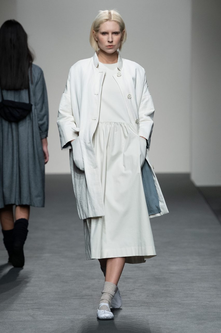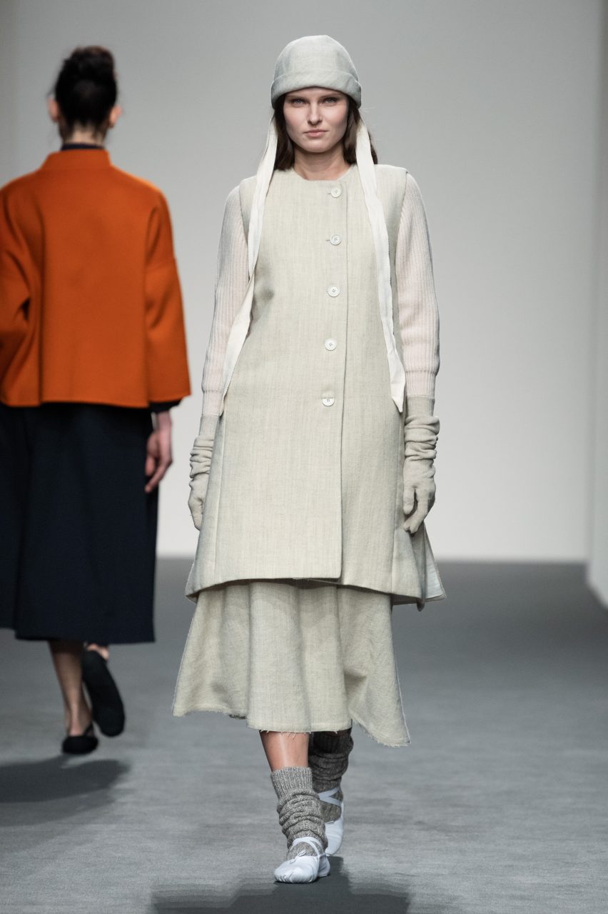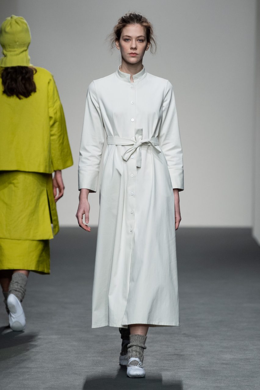 La purezza delle linee e delle forme si fonde all’uso di tessuti green: lane green in bland con la canapa non sottoposte a processo di tintura dalla tonalità naturali e cotoni organici. Ciò richiama visivamente la finitura grezza dei capi dei primi esploratori che raggiunsero l’Antartide all’inizio del 1900. Inoltre, un nuovo “tessuto” di piuma naturale brevettato (Thindown) è stato utilizzato per dare volume e isolamento termico, senza intaccare la purezza delle superfici con trapunte. La collezione si completa con alcuni capi in pizzo di lana, cashmere double sottoposti a processo di infeltrimento e maglieria e accessori in cashmere.