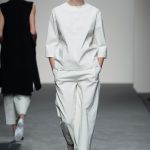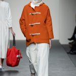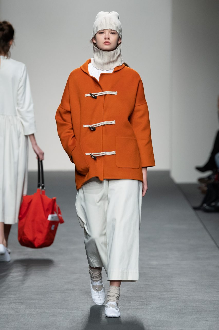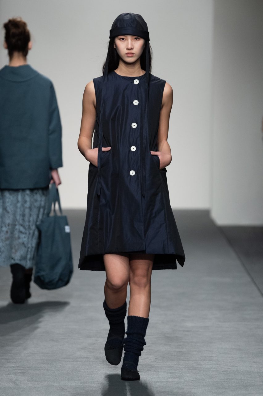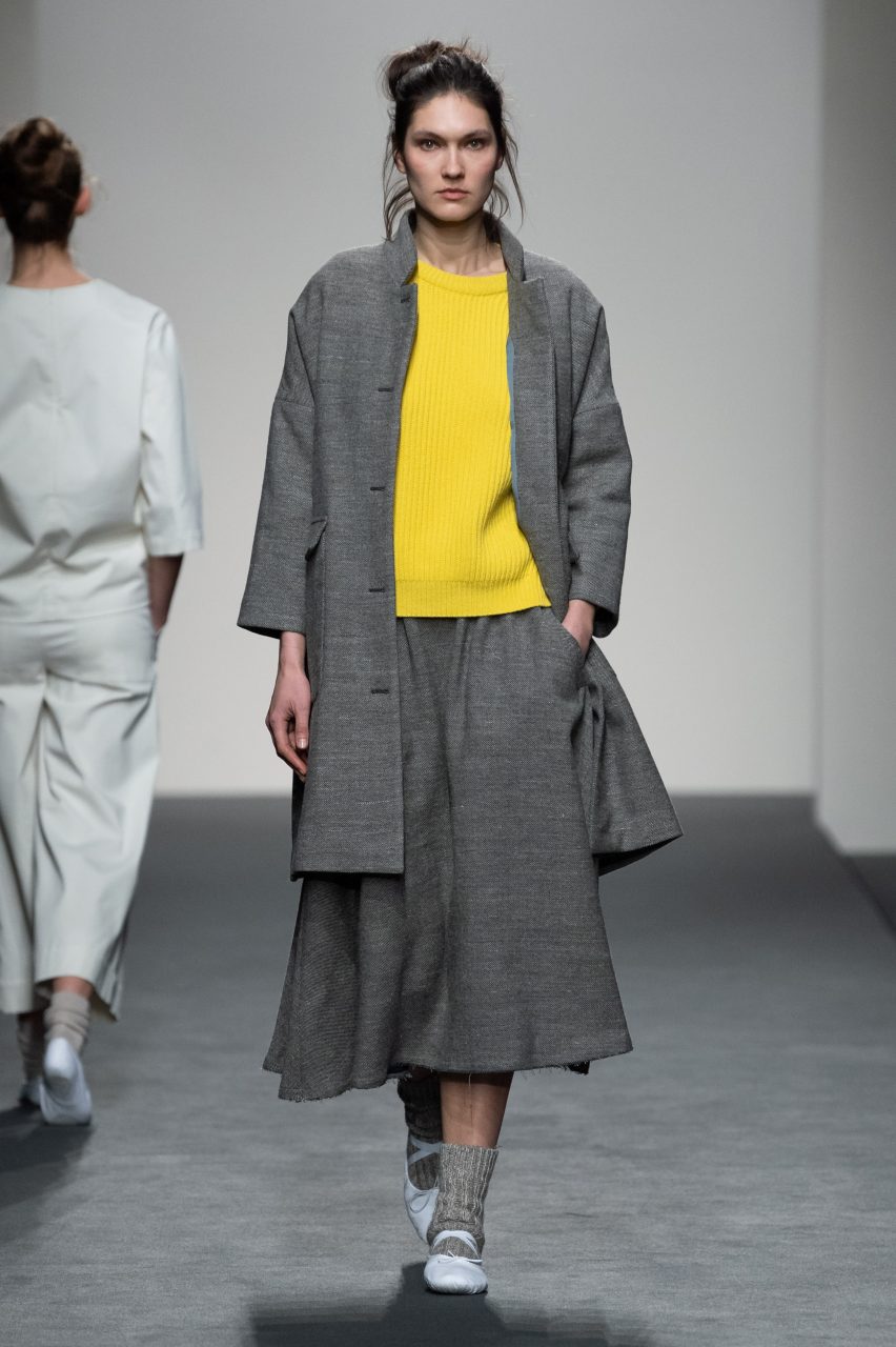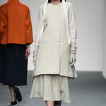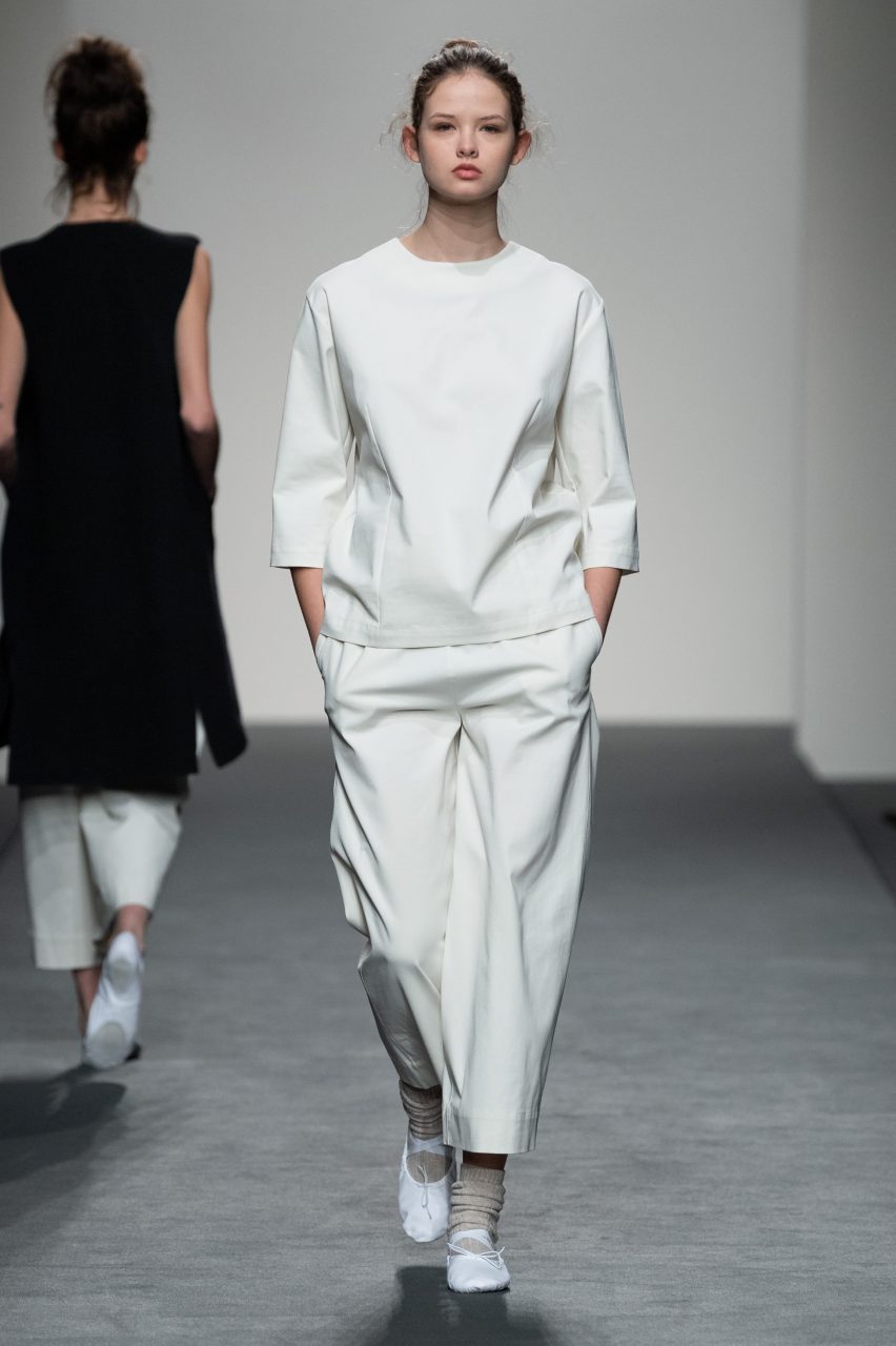 La purezza delle linee e delle forme si fonde all’uso di tessuti green: lane green in bland con la canapa non sottoposte a processo di tintura dalla tonalità naturali e cotoni organici. Ciò richiama visivamente la finitura grezza dei capi dei primi esploratori che raggiunsero l’Antartide all’inizio del 1900. Inoltre, un nuovo “tessuto” di piuma naturale brevettato (Thindown) è stato utilizzato per dare volume e isolamento termico, senza intaccare la purezza delle superfici con trapunte. La collezione si completa con alcuni capi in pizzo di lana, cashmere double sottoposti a processo di infeltrimento e maglieria e accessori in cashmere.