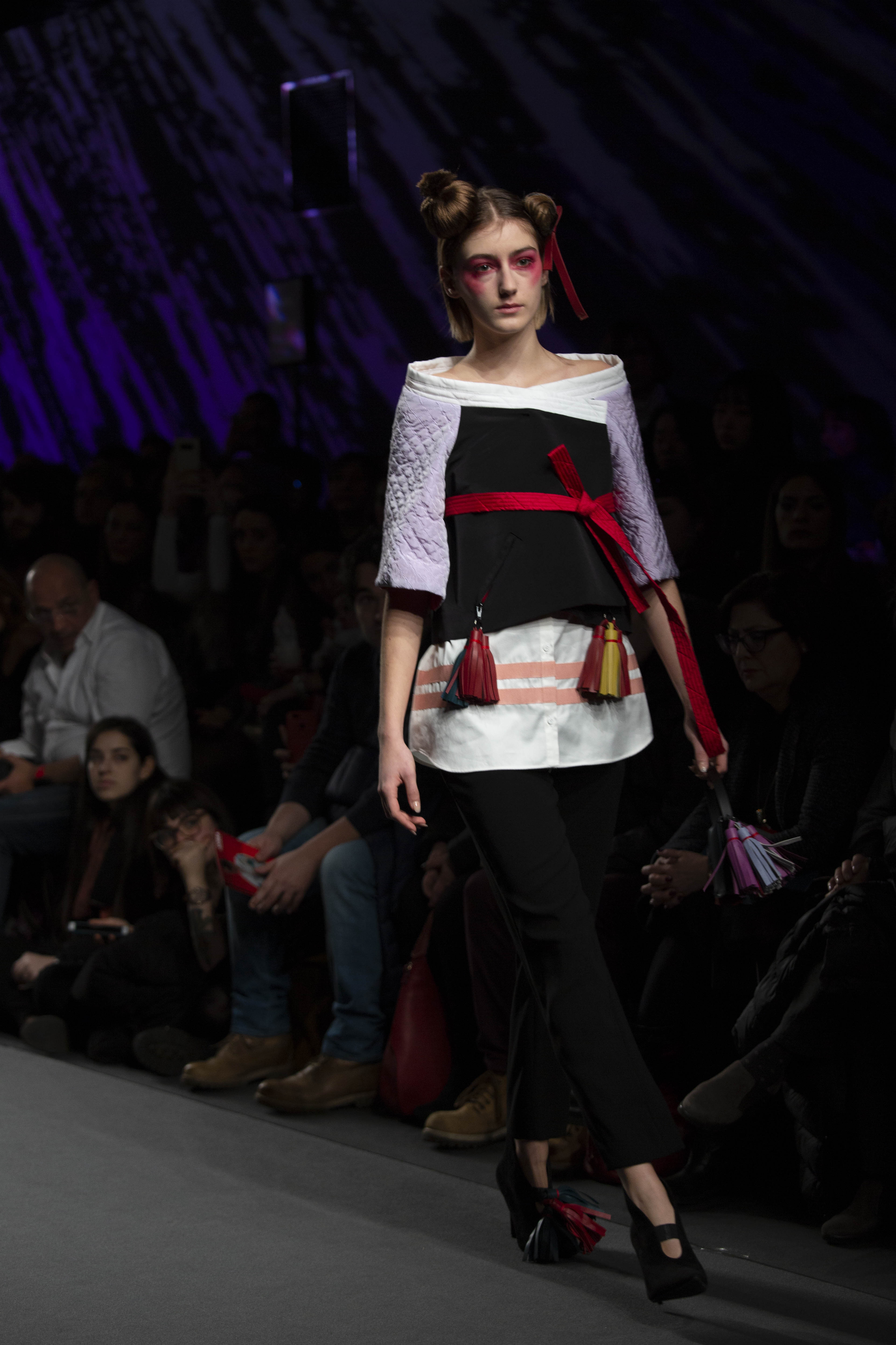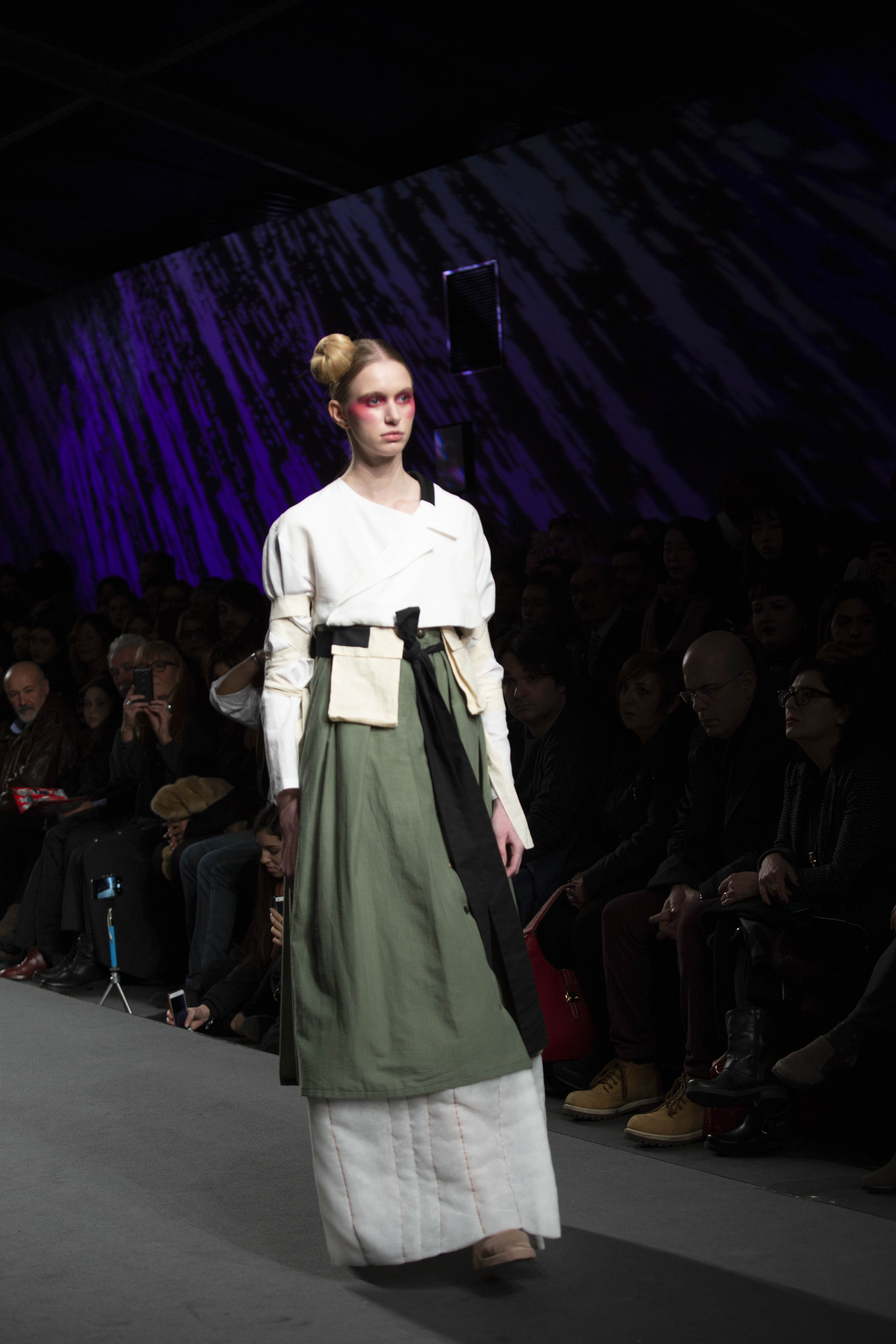 L’idea di partenza è quella di rendere contemporaneo il costume tradizionale coreano. Nella collezione alcuni elementi fondamentali dell’hanbok, come le maniche larghe, il busto corto, sono declinati secondo forme nuove. Se i colori riprendono quelli più comuni del costume coreano, i tessuti scelti sono contemporanei, per dare a questo una nuova forma.