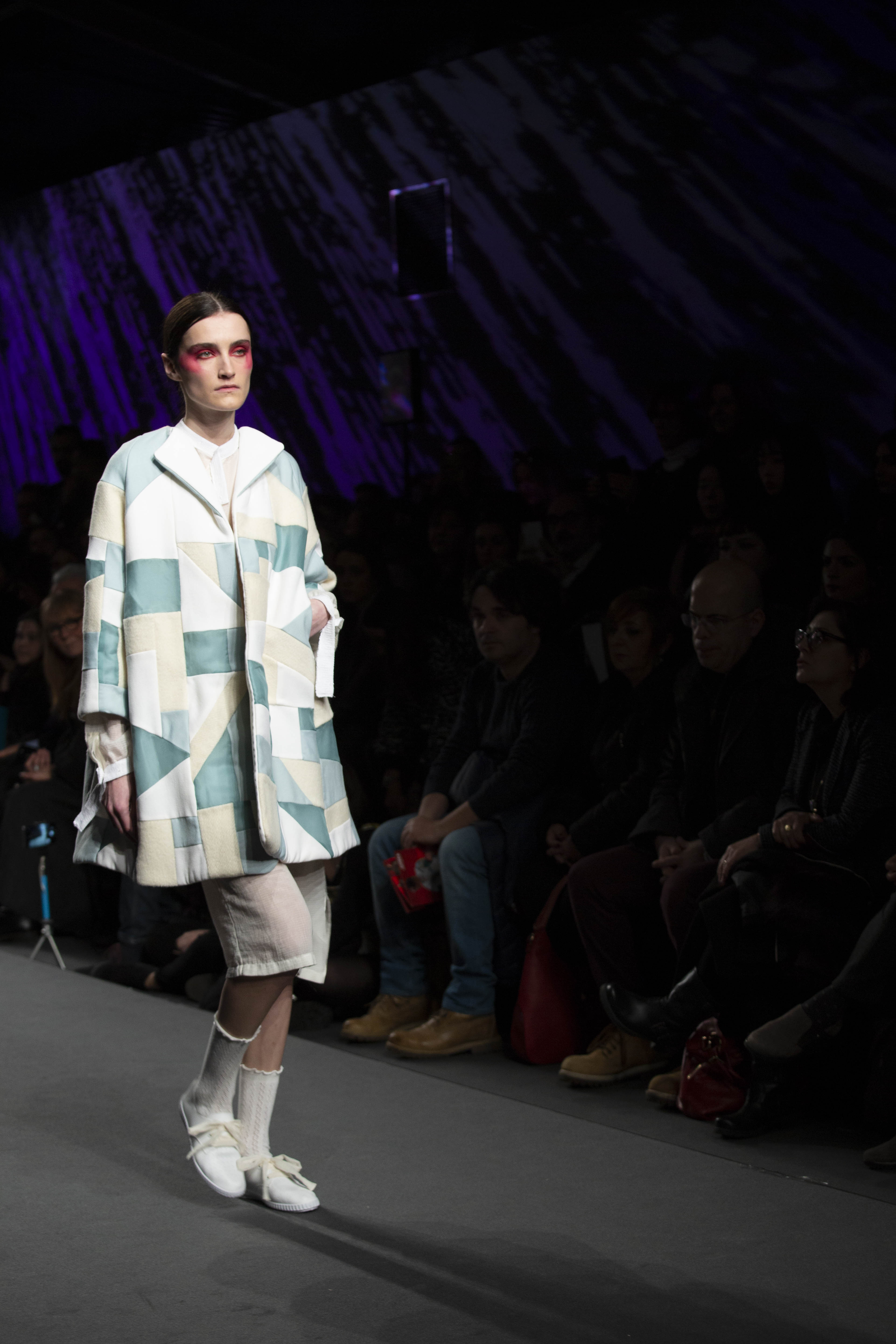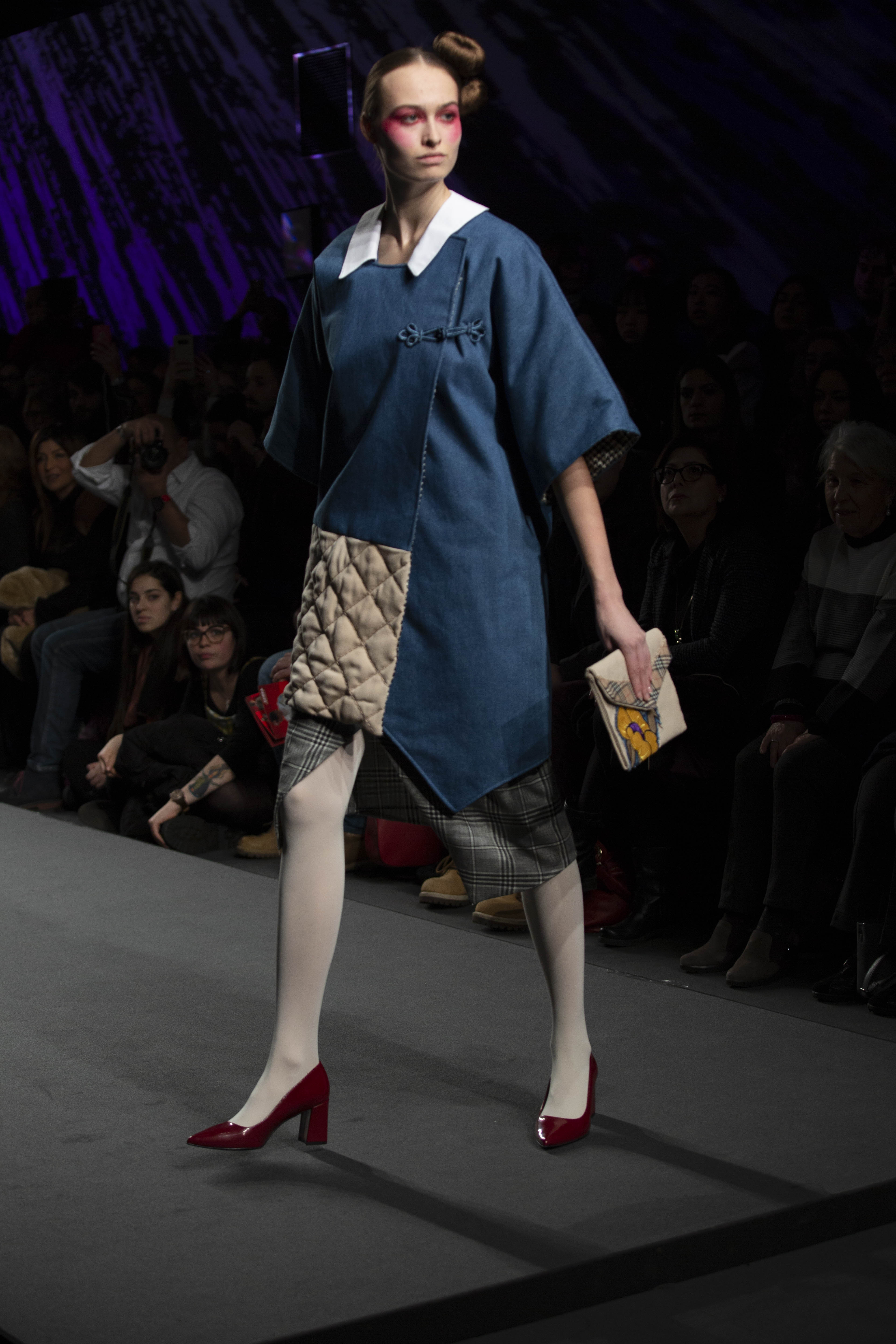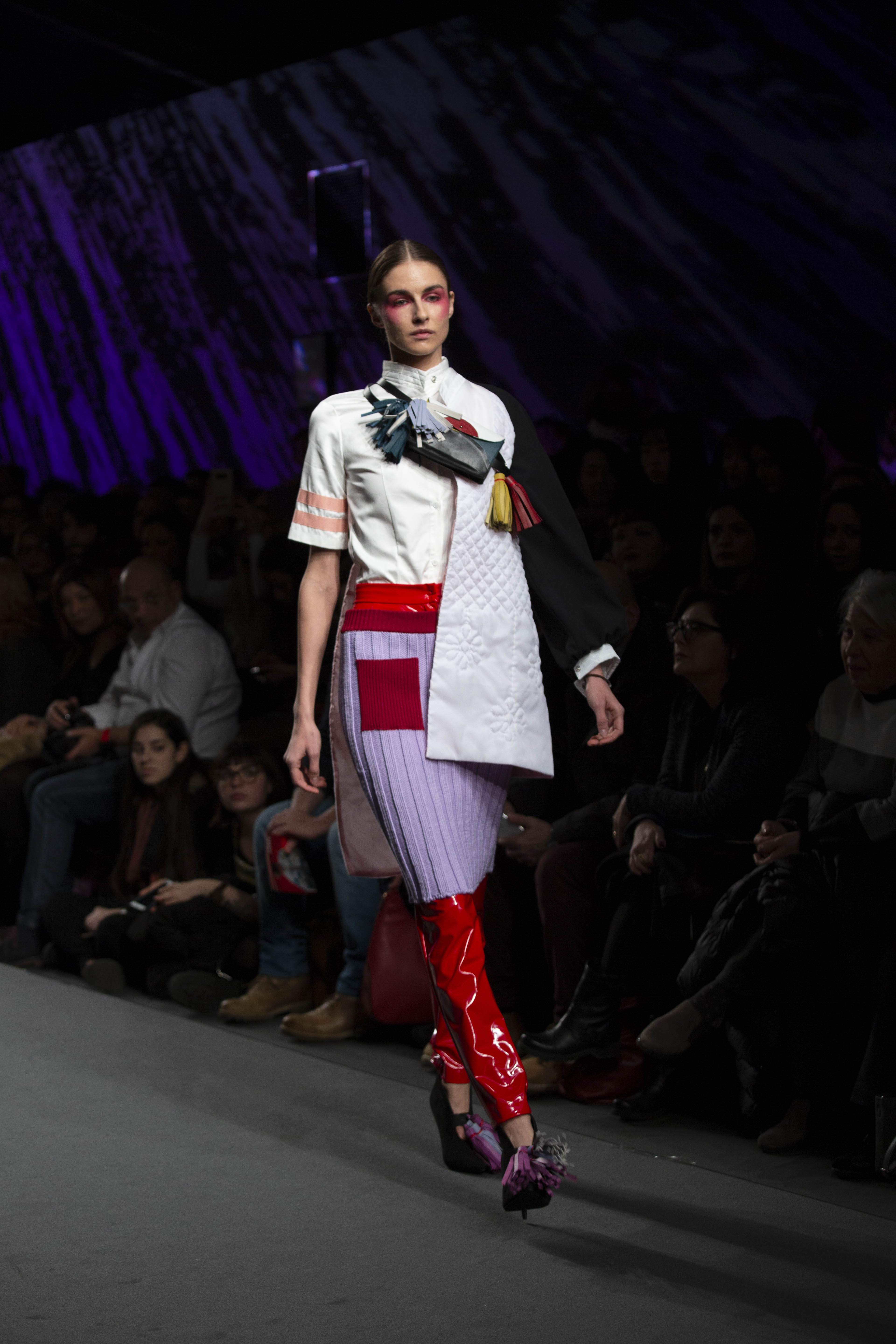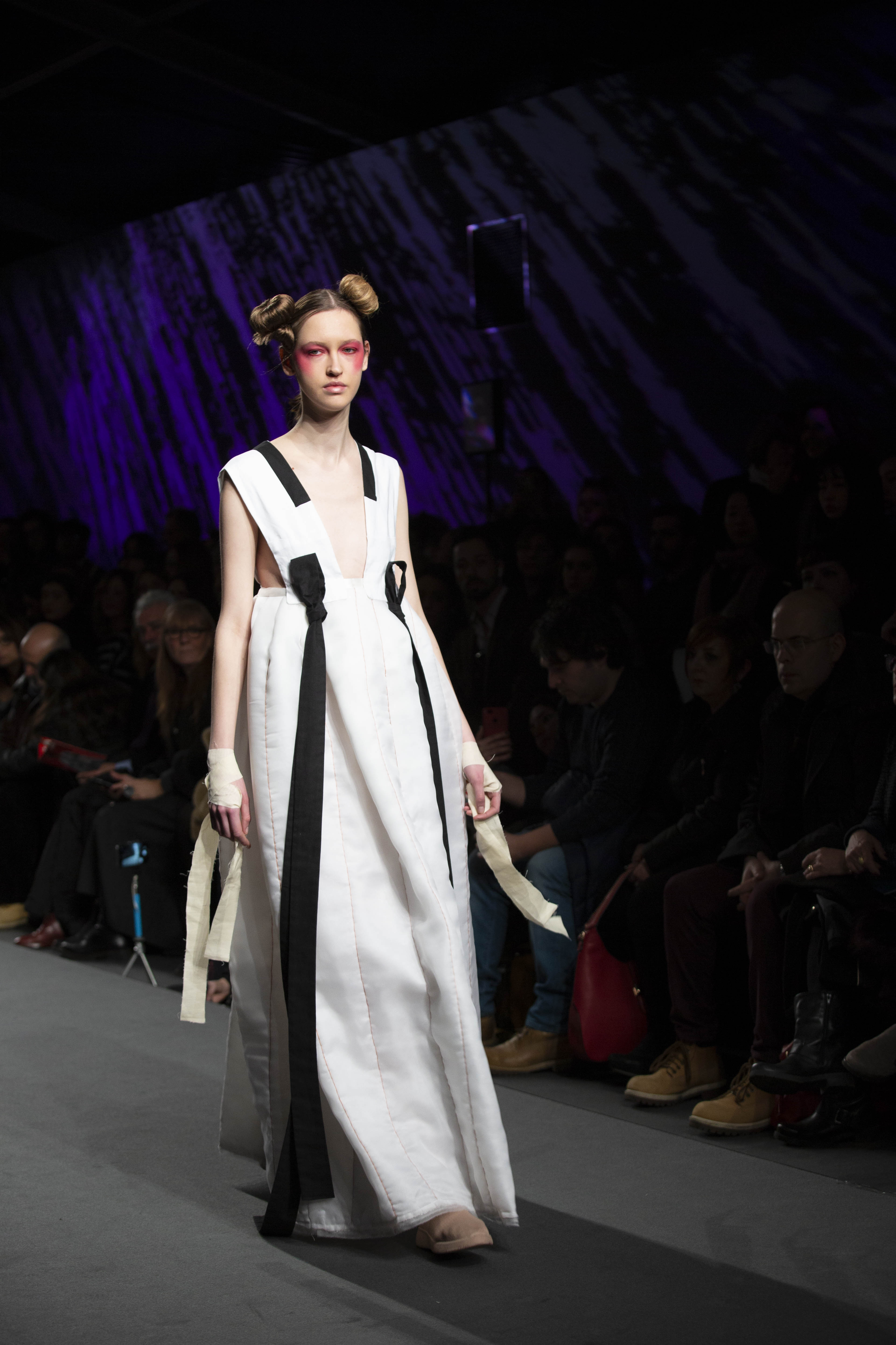 Sintesi e occidentalizzazione di volumi e forme dell’Hanbok, attraverso una grafica che rimanda al patchwork e ai disegni coreani sia nelle linee precise che nei colori tenui, con elementi bianchi che riprendono nella tradizione l’idea e il loro pensiero sulla purezza d’animo e la spiritualità. Il tutto combinato in una silhouette morbida dalle curve dolci.