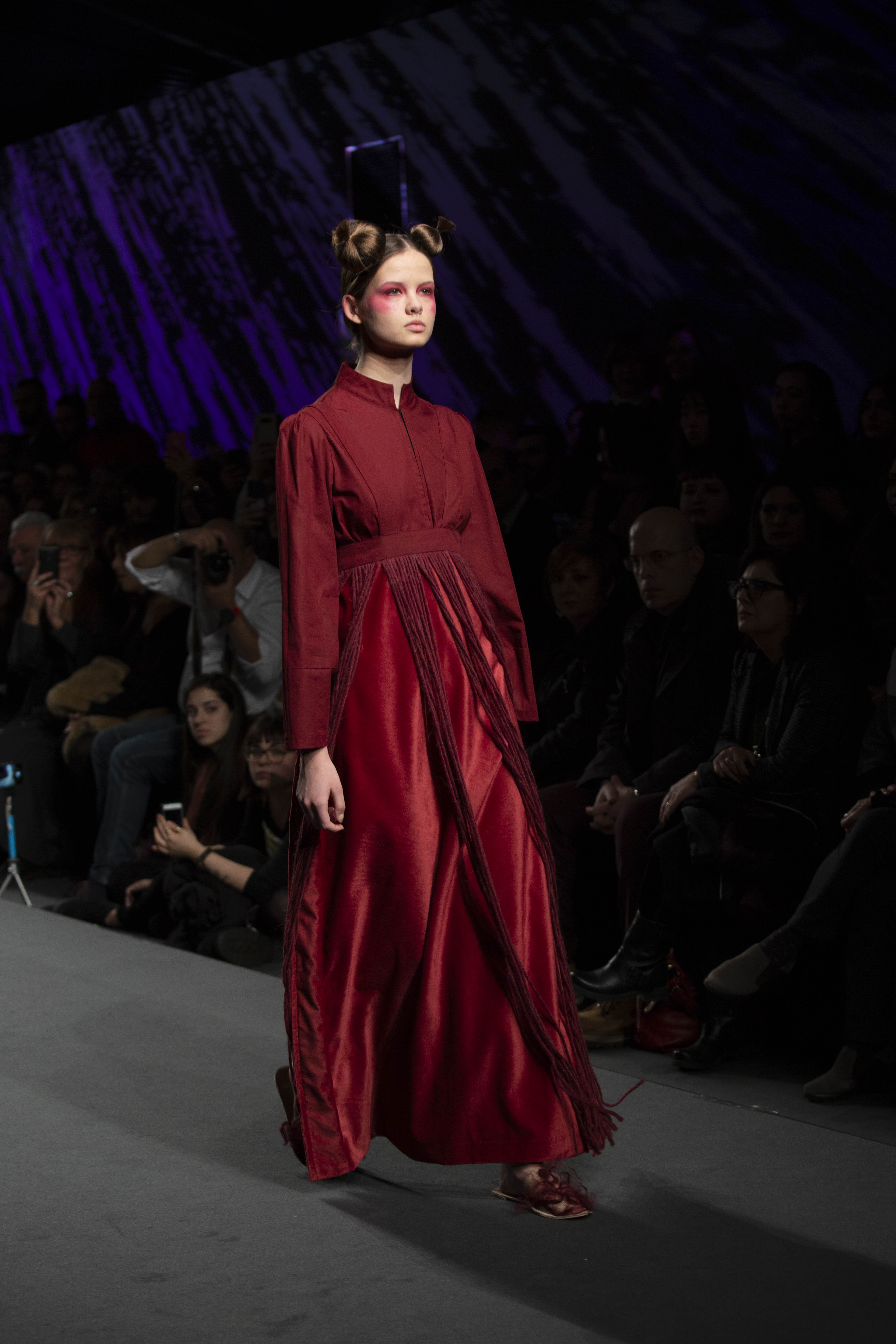 Nell’abito tradizionale coreano ogni colore ha un significato ben preciso, un flusso di energia che invade ed eleva ogni abito. Il colore verde è legato alla terra mentre il rosso al fuoco. Le radici della tradizione sono piantate nella terra ed il fuoco, che è simbolo di trasformazione, influisce sulla materia e la modifica. Fili e fibre, che come elementi della natura si piantano nel terreno, si intrecciano e si snodano, in una metamorfosi che segue il corpo ed i suoi movimenti.