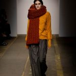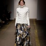 In passerella filati intrecciati a capi in maglia dai punti tridimensionali, trecce, intarsi, morbidi rilievi e jacquard ricamati, danno vita a un’eleganza raffinata senza tempo unica e ricercata, fatta di cappotti avvolgenti sofisticati e sartoriali nei tagli, di cardigan preziosi e soffici capaci di infondere nella mente di chi osserva quel certo non so che di estetico confort; fatta di giubbotti in velo di cammello inseriti sotto uno strato di pvc trasparente dal piglio pratico, intelligente, moderno ed originale; fatta di linee flessuose morbide e scivolate per i pantaloni con pince a vita alta con su soffici tricot, e gonne –midi o maxi- sormontate da avvolgenti quanto confortanti pullover. Linee fluide pulite ed eleganti, lavorazioni sublimi, texture impalpabili, imprinting attuale, volumi generosi seppur nel loro rigore sobrio e gentile le linee guida della collezione.