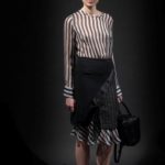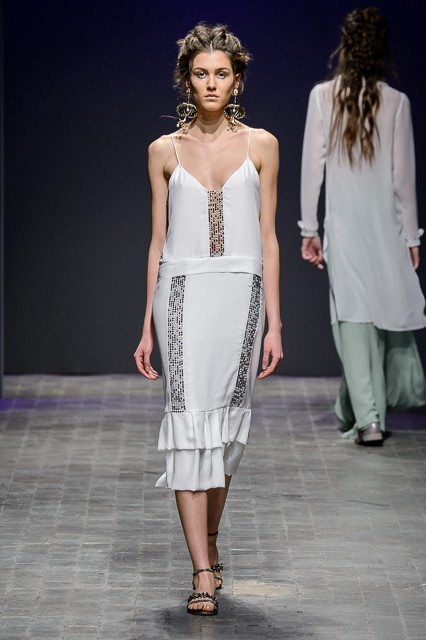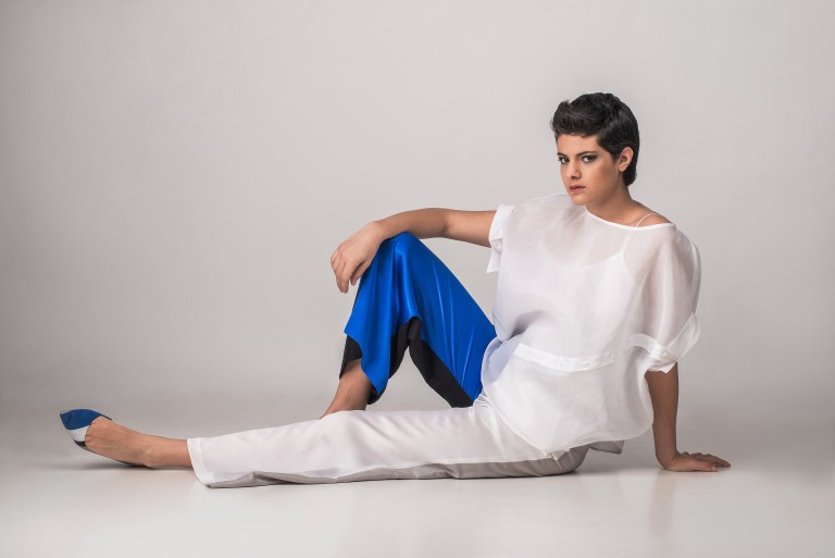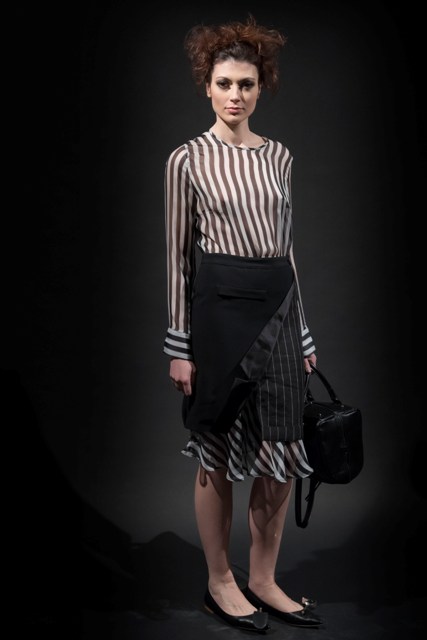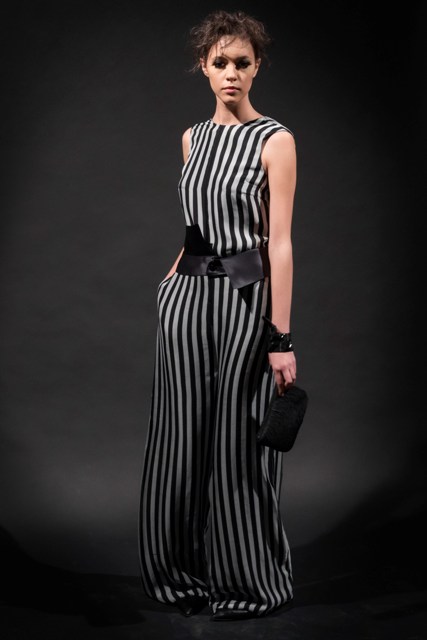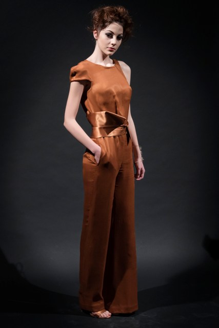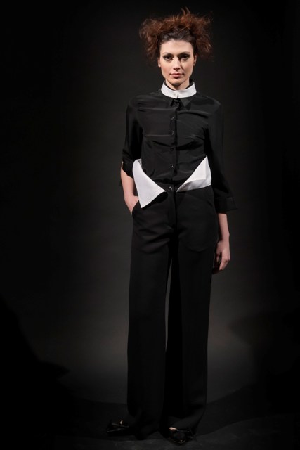 Estro, linee pulite, tagli sartoriali e tessuti nobili, questi gli elementi salienti della collezione. Chiffon , sete, lini e doppi di raso si colorano delle cromie decise del blu ming, del verde foglia, del rosso fragola, e dei bianchi grigi e neri. Per la sera, il bianco si mesce al cognac.