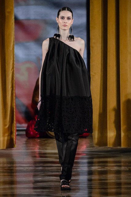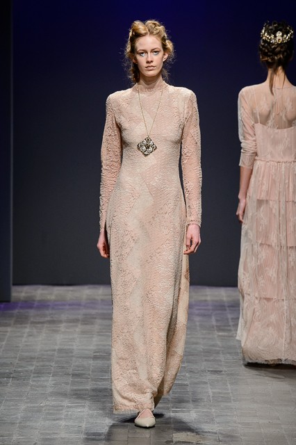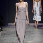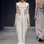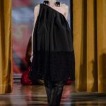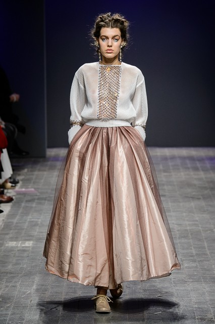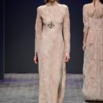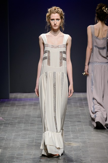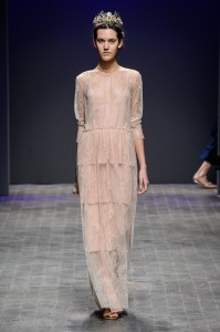 La collezione, dedicata alle diverse forme del femminile, presenta un’anima ancestrale sospesa tra passato e presente. Voluttuosa e femminile con netti richiami alla sontuosità del periodo settecentesco, ma anche agli anni 50, che vedono nel New look di Dior la rinascita della haute couture. Le volumetrie di questi anni vengono riproposte dal couturier con una nuova lettura, che fa della modernità il suo pass par tout, e poi trasparenze tipicamente anni 70’ -tante – ricoperte di sfavillanti zampilli di Svarowski; di grande charme gli abiti in seta leggera così come gli impalpabili trionfi di pizzo.