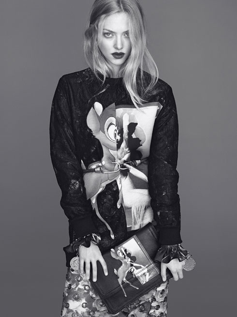 Le creazioni di Givenchy per la Seyfried sono abbastanza deludenti e a volte fanno un po’ storcere il naso: si sente la mancanza dei colori e degli altri elementi che davano al suo stile un tocco giovanile. Visto il risultato, si arriva quasi a preferire gli enormi maglioni “rubati” dalle collezioni maschili del marchio che Amanda Seyfried e altre star di Hollywood indossano come vestiti nella vita privata, abbinandoli spesso a collant pesanti e a stringate maschili. Forse non è un caso che molti pezzi della collezione femminile autunno/inverno 2013-14 di Givenchy siano proprio felpe e maglioni oversize caratterizzati da stampe grafiche – ad esempio il Bambi spezzato a metà da un’immagine in bianco e nero-, abbinati a gonne che arrivano al ginocchio o fino a terra trasparenti, oppure arricchite da stampe floreali o di influenza orientale, esattamente il look che sfoggia l’attrice americana nel primo scatto della campagna pubblicitaria.
