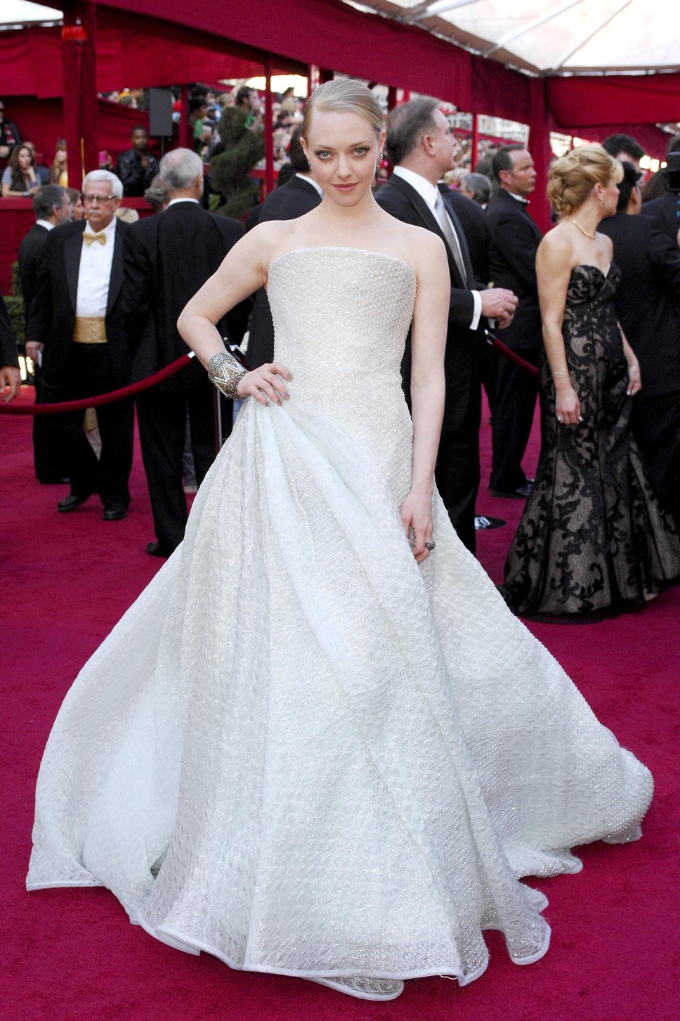 Non a caso, anche lo stile della Seyfried è adatto alle ragazze e contribuisce a farla sembrare più giovane dei suoi ventotto anni, assieme alla lunga chioma bionda e agli enormi occhi azzurri. Infatti predilige abiti corti; anche se, a dire la verità, prima delle varie premiere di “Les Miserables” e della successiva stagione dei premi, ha partecipato a poche occasioni veramente importanti in cui era d’obbligo un lungo ed elegante vestito da sera. Inoltre, non si fa problemi a presentarsi sul tappeto rosso con indosso giacca, shorts e tacchi. Gli abiti corti che predilige hanno sempre una linea semplice ma colpiscono per il colore o la stampa: da colori particolari come il bordeaux, l’arancione, il viola melanzana, l’azzurro scuro e il lillà passa a stampe che creano particolari effetti ottici. Non la si potrebbe definire esattamente una che “osa”, ma sicuramente da lei ci si può aspettare di tutto, quindi anche un disastro, come il ridicolo completo nero e bianco tutto ruches da ballerina di flamenco di Balenciaga indossato alla premiere inglese di “Les Miserables” lo scorso anno. I vestiti corti che sfoggia sono quasi sempre azzeccati, e lo sono anche quelli da sera, alternando bianchi angelici, come quello da perfetta Cenerentola firmato Armani Privé indossato agli Oscar 2010, a tonalità scure e decise, come il vestito di Alexander McQueen sfoggiato lo scorso anno a una delle tante premiere di “Les Miserables”, formato da lunga gonna nera e corpetto con decorazioni dorate.
