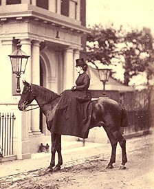 Completo usato dalle donne per cavalcare all’amazzone: le gambe da un solo lato della sella. E’ il più antico fra gli abiti sportivi, di moda a partire dal 1800. È formato da un corpetto attillato, di linea molto semplice, con collo in velluto risvoltato, spesso accompagnato da gilet, cilindro con velo, cravattina a farfalla e naturalmente da frustino e guanti. Di solito si univa ad una gonna quasi sempre molto ampia, soprattutto molto lunga, in modo da poter nascondere le gambe quando si cavalcava. Scendendo dalla sella la gonna veniva raccolta sul braccio in un armonioso drappeggio. Molto spesso sotto la gonna si celava un paio di calzoni in jersey.