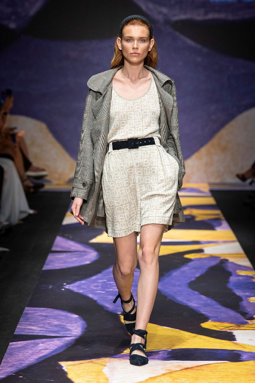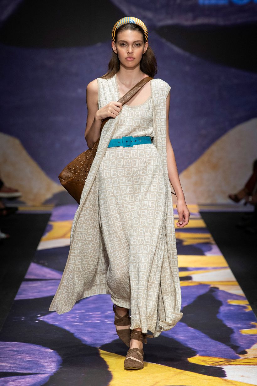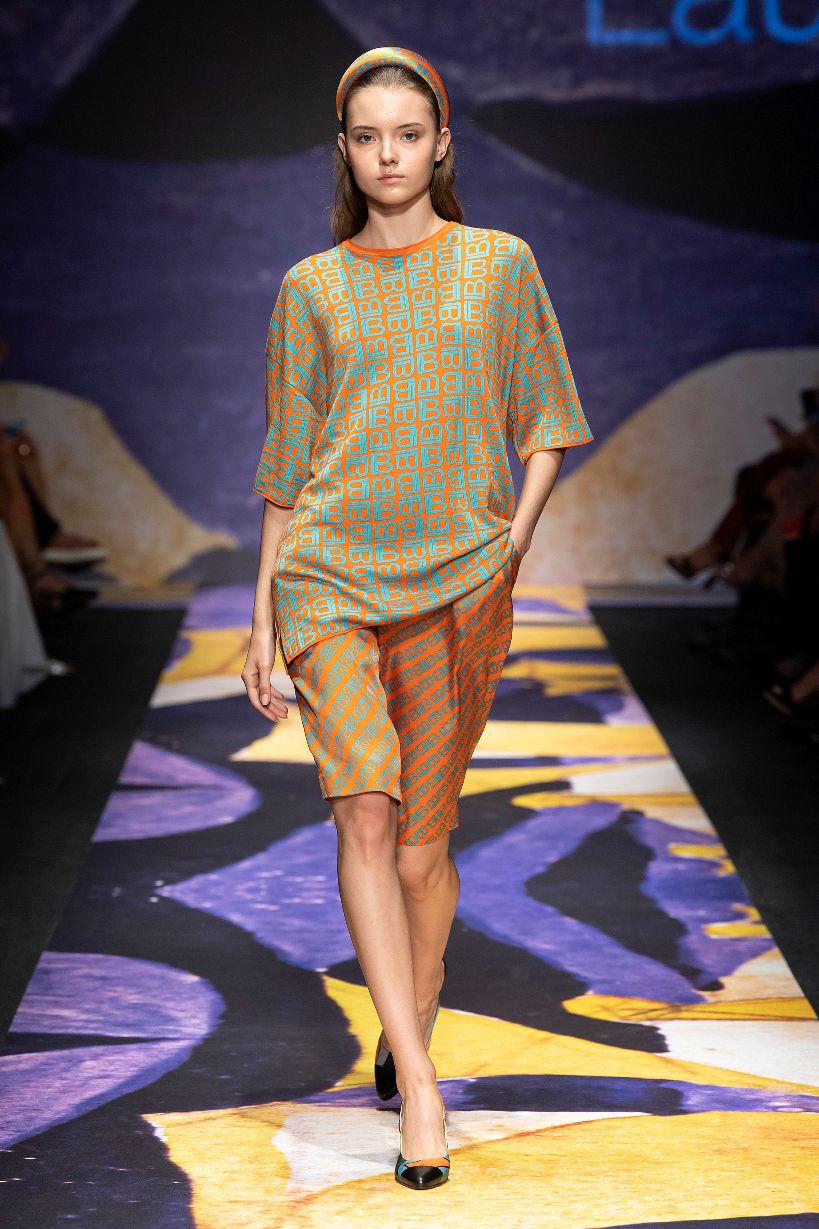 Non mancano nella collezione il Bianco Biagiotti e i toni naturali espressi in garza di lino, anche in versione gessata e principe di galles, e la maglia sottile fino alla trasparenza, lavorata con punti inediti come quello “a conchiglia”; elementi che bilanciano i colori e le stampe di ispirazione futurista. Ovunque poi si può leggere, tessuto, stampato, laserato sulla pelle, il logo LB