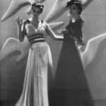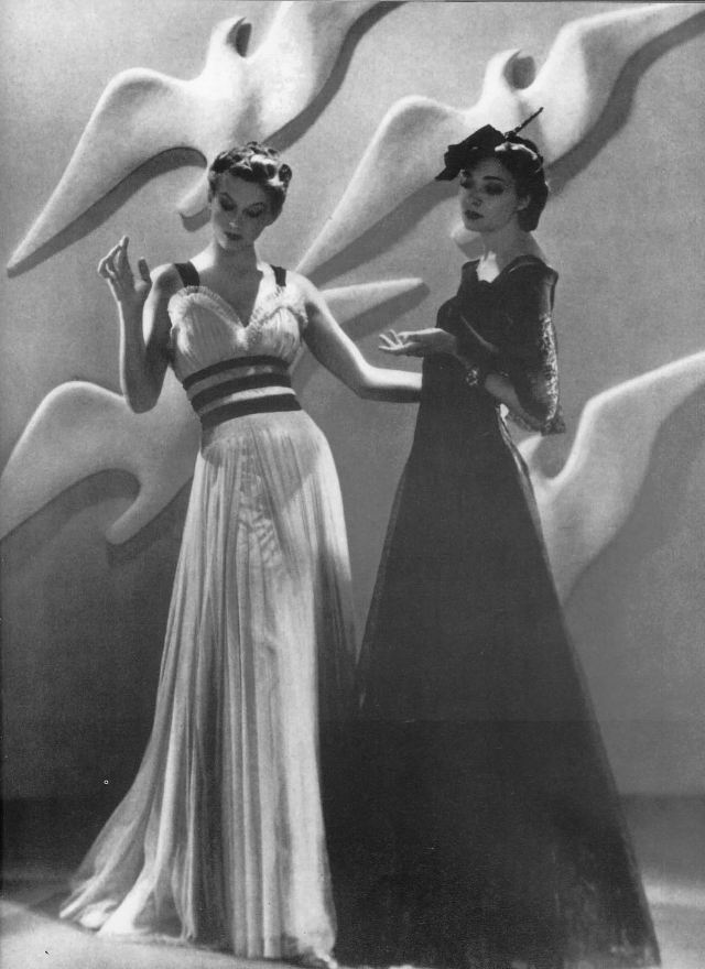 Come in tutti i periodi di crisi l’attenzione volge alla verità, all’essenziale, i pensieri si edulcorano e la mente diviene più indulgente…. così anche il corpo della donna torna ad avere linee più soavi, morbide e femminili. Il punto vita slitta al suo posto naturale: sopra al primo fianco, le spalle delle giacche si strutturano , gli orli delle gonne si allungano fin sotto al ginocchio, arrivando “a caviglia”; nelle mise di mezza sera. i capi spalla seguono tre tendenze: hanno maniche a kimono, tonde, oppure maniche a pagoda. Per la mattina una moda intelligente prende il sopravento: gli abiti, o i tailleur – gonna o pantalone-, sono volti a sottolineare una predilezione alla signorilità, invece che ad una sfrontata femminilità; i tessuti , morbidi e duttili, sono il jersey di lana e seta, e il tweed.