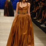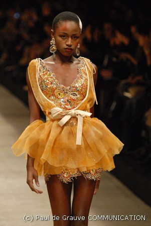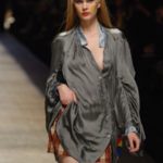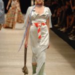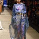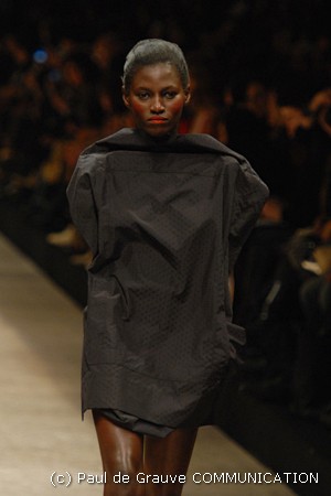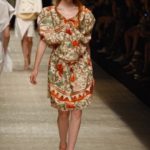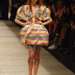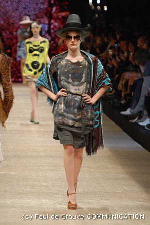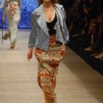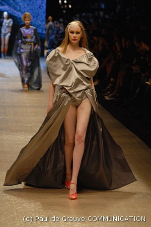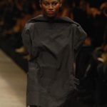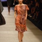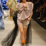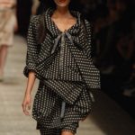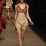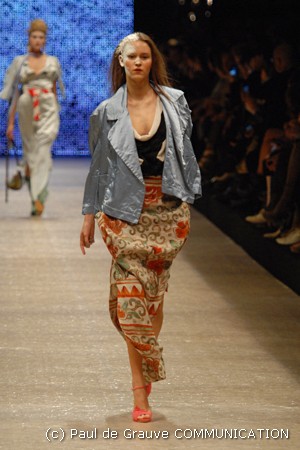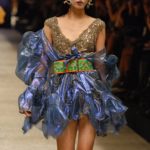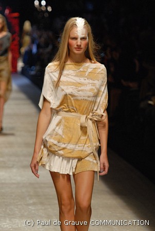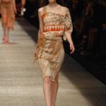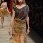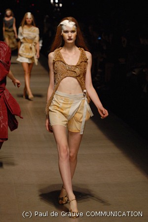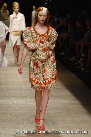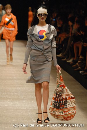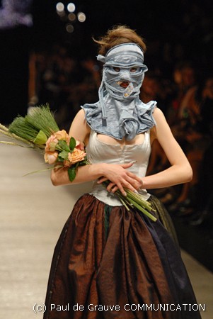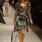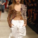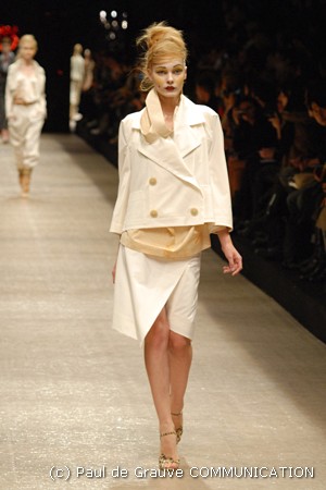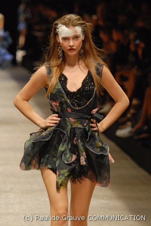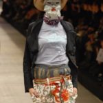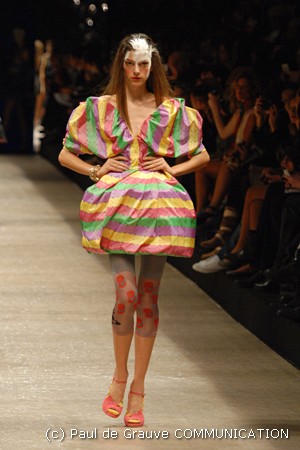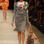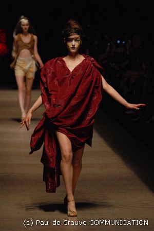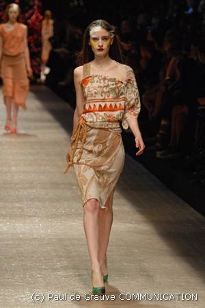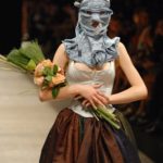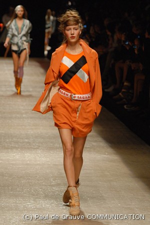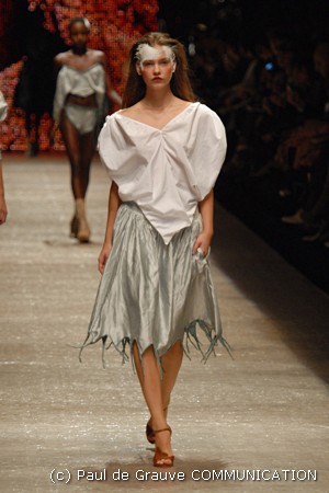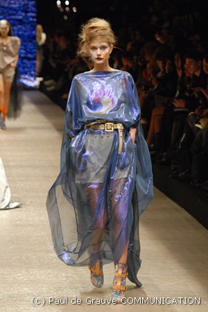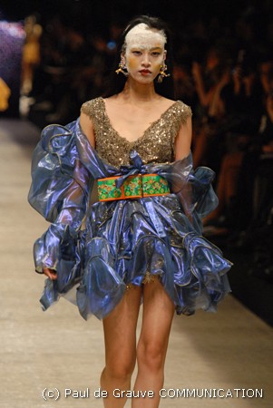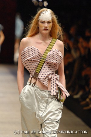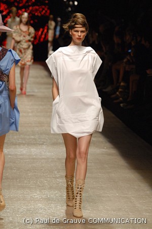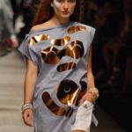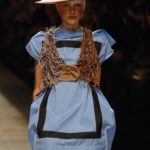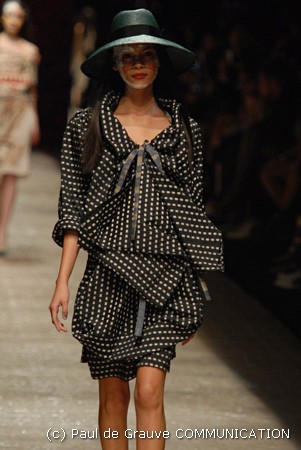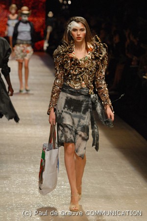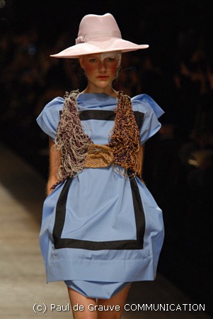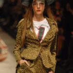 Molto particolare la maglieria, pensata come un intricato gioco di reti o in un trionfo di stampe floreali o più grafiche. Le stoffe spaziano dal semplicissimo cotone, utilizzato su colori prettamente neutri, a tessuti più rigidi, dalle sembianze plastiche, per abiti corti o cortissimi dall’allure romantica. Divertenti i tailleur pantalone, in particolare il modello dalla stampa leopardata, abbinati a semplici t-shirt con grandi scritte campeggianti sul petto. È strano l’effetto di un passaggio da forme molto minimal, di una semplicità assoluta, ad altre fortemente barocche ed eccentriche, come la giacca scultura con voluminose applicazioni floreali, impreziosita da pietre e strass ad illuminare un fondo scuro bordeaux.