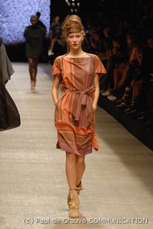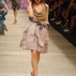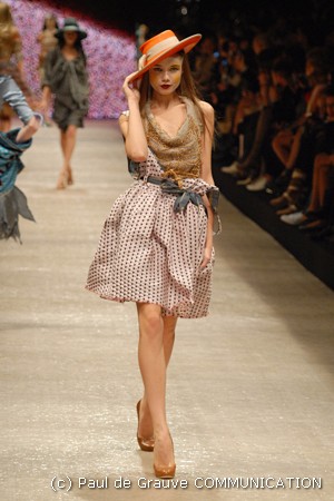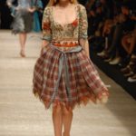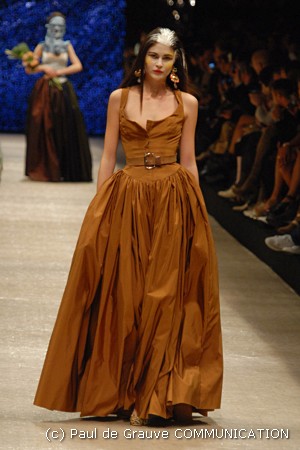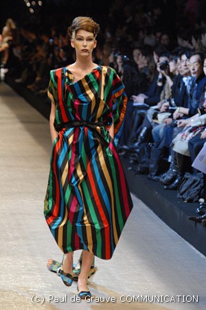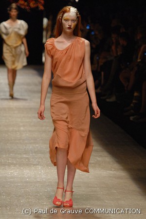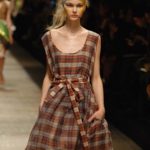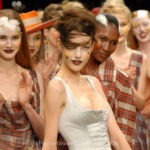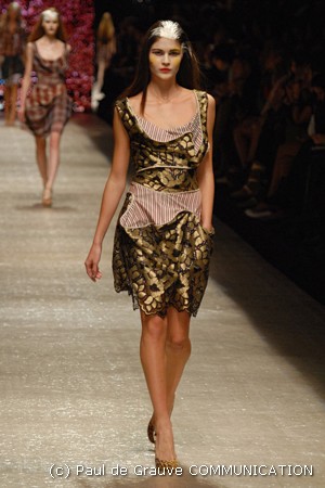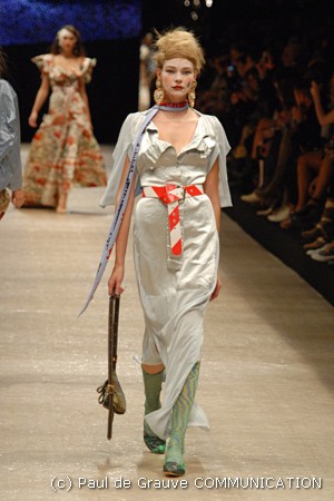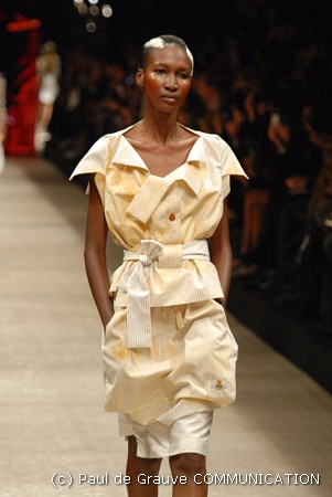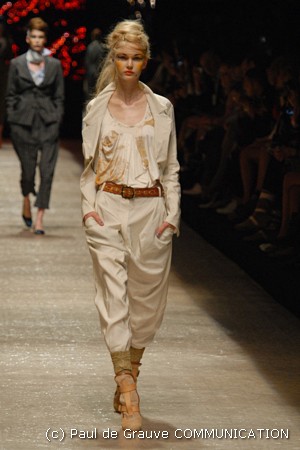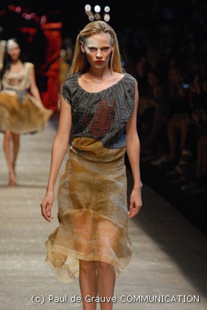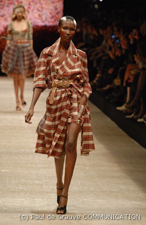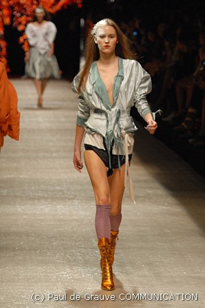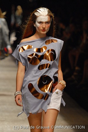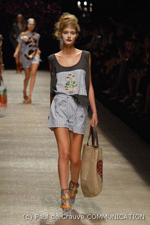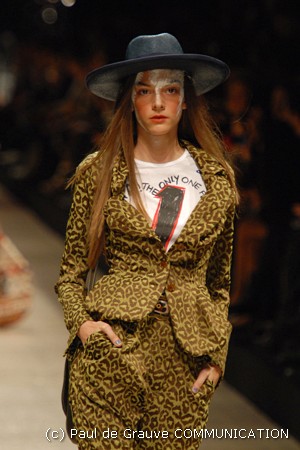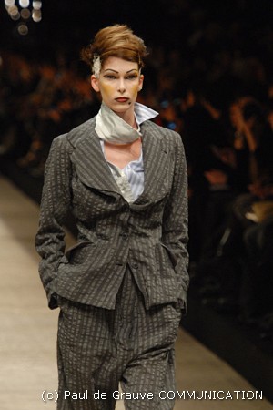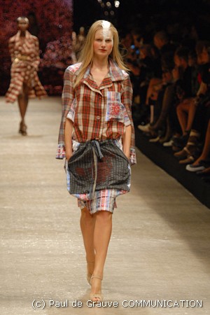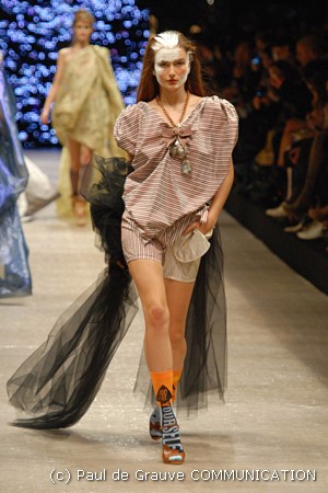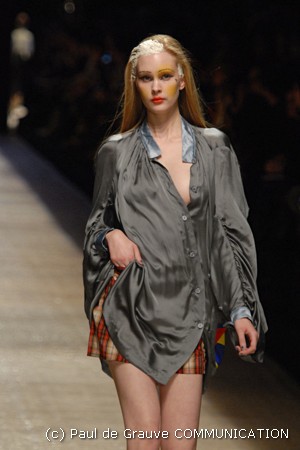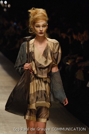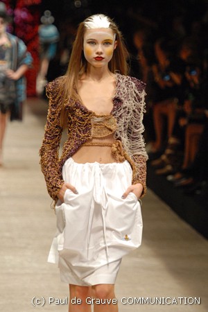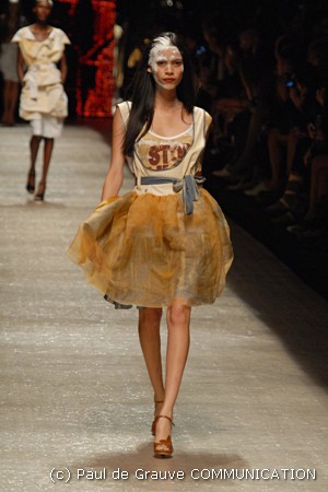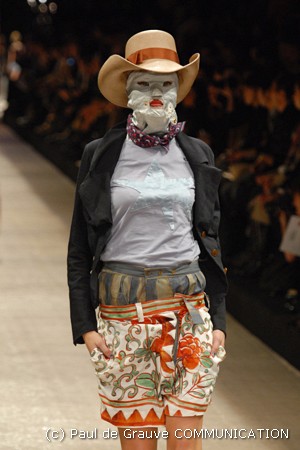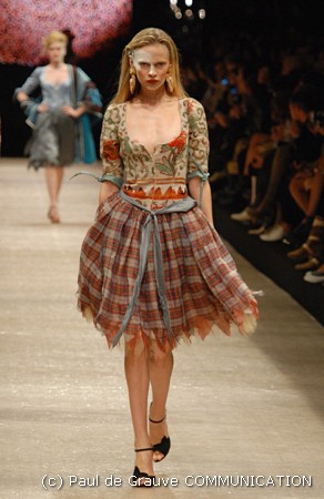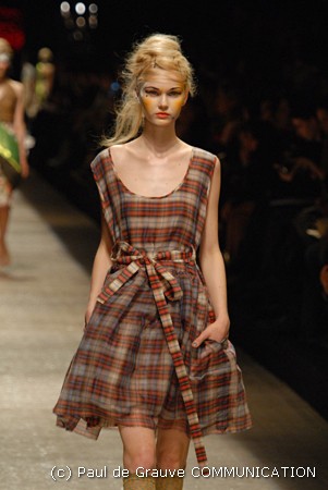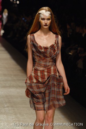 Come tradizione in casa Westwood ritorna la stampa scozzese per abiti, gonne e addirittura un lungo e scivolato trench. Righe multicolor per abiti lunghi alla caviglia o più corti dalla forma rigonfia a palloncino. Gli ultimi modelli a calcare la passerella parigina sono dei lunghi abiti in cotone con minuti corpetti superiori e ampi al fondo, che richiamano genuine atmosfere bucoliche.