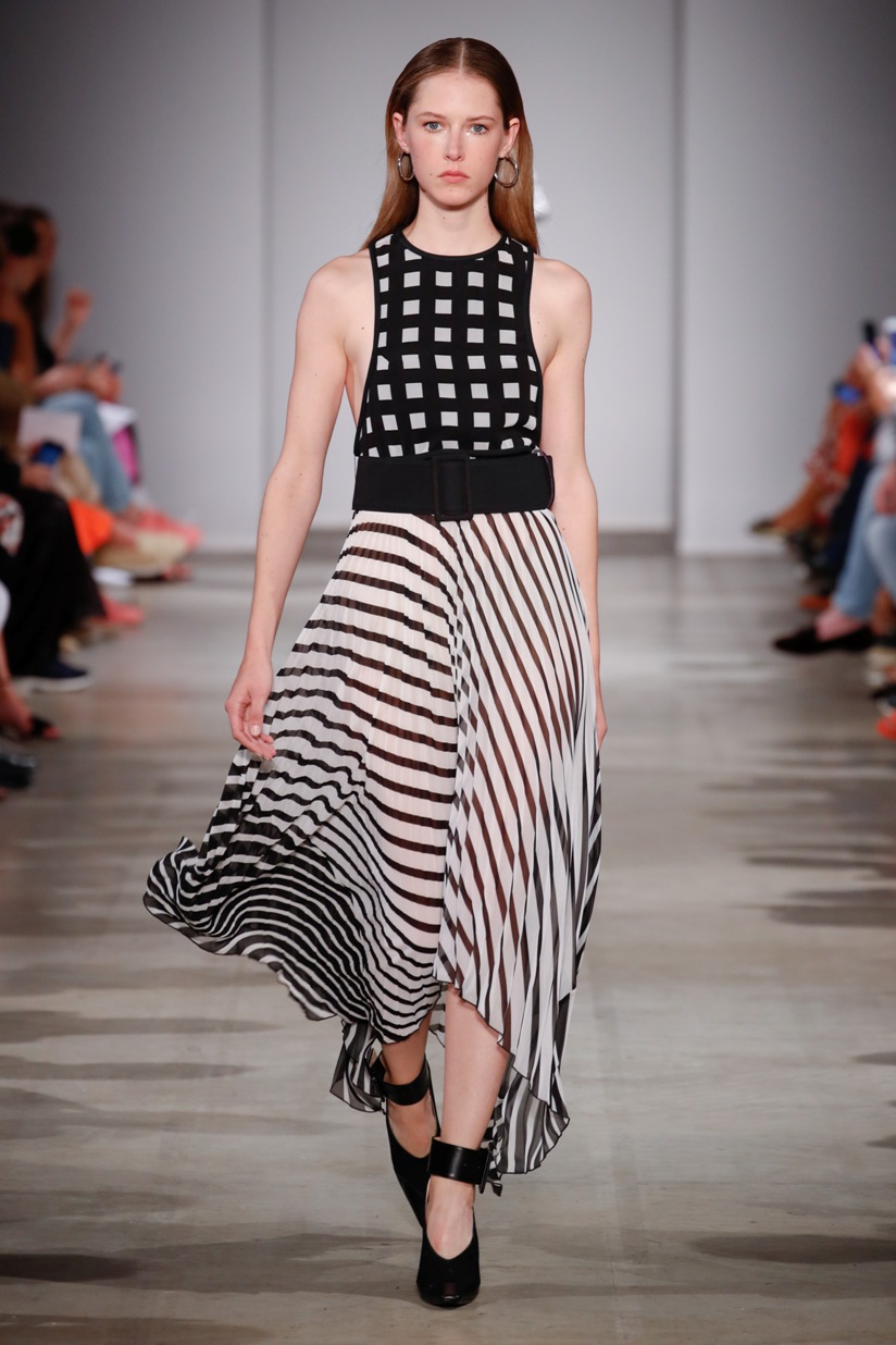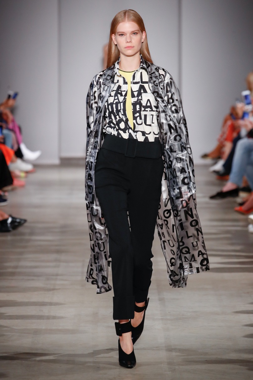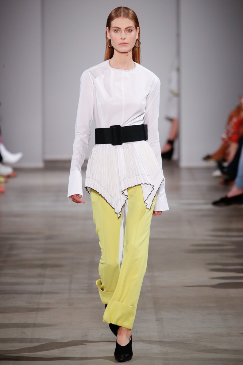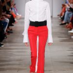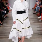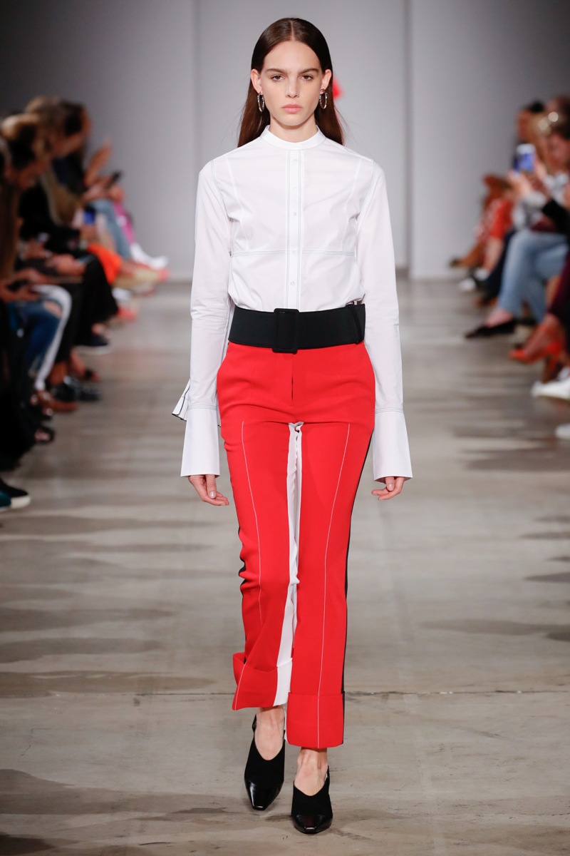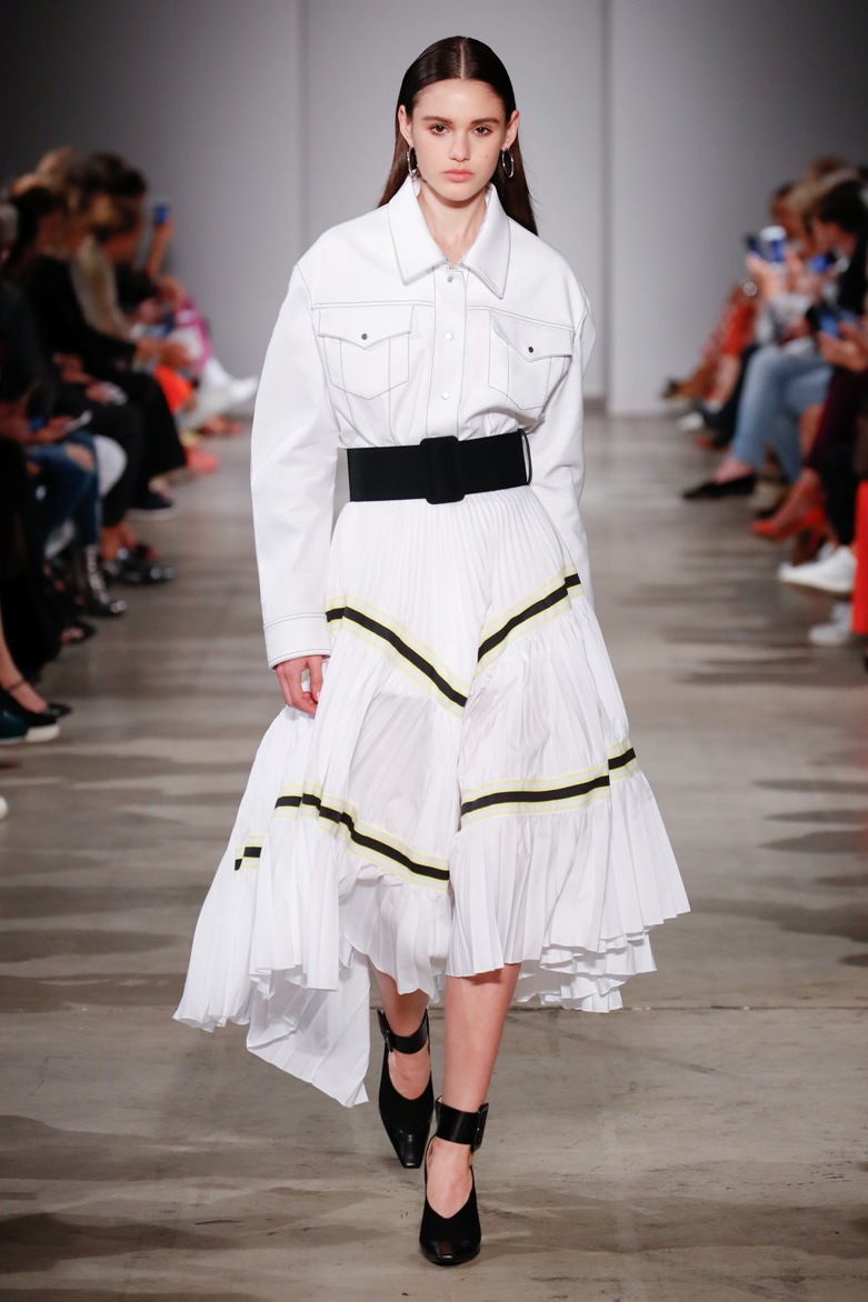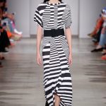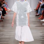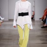 I volumi sono ampi soprattutto quelli che ridisegnano le camicie bianche, capo iconico del marchio. L’identità della collezione è nei tagli essenziali, evidenziati da intersezioni cromatiche di righe e geometrie, come nei pantaloni dalle lunghezze varie caratterizzati da bande laterali; ma l’identità è anche nelle asimmetrie, che costruiscono gonne dall’allure femminile e leggera enfatizzata dalla vita strizzata in cinture alte, che disegnano abiti leggeri e fluttuanti, sofisticati, iperfemminili e vibranti.