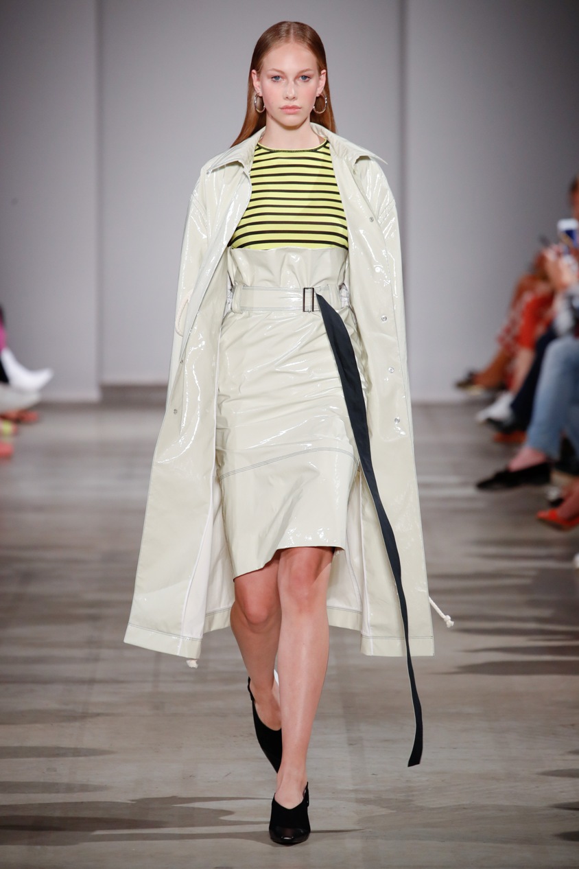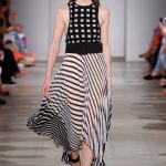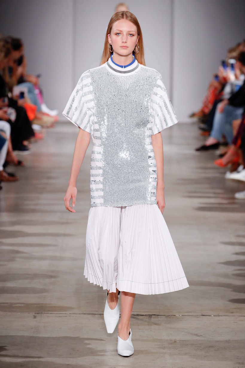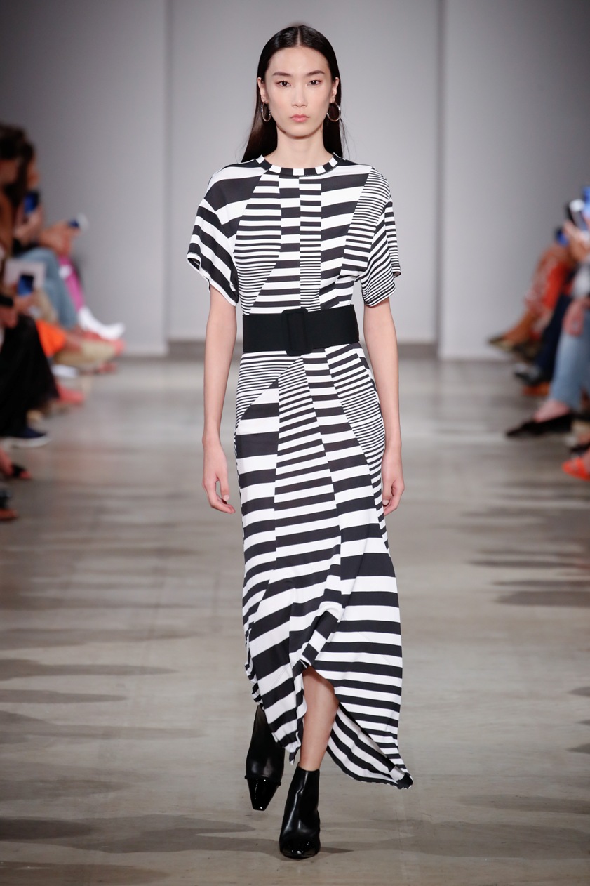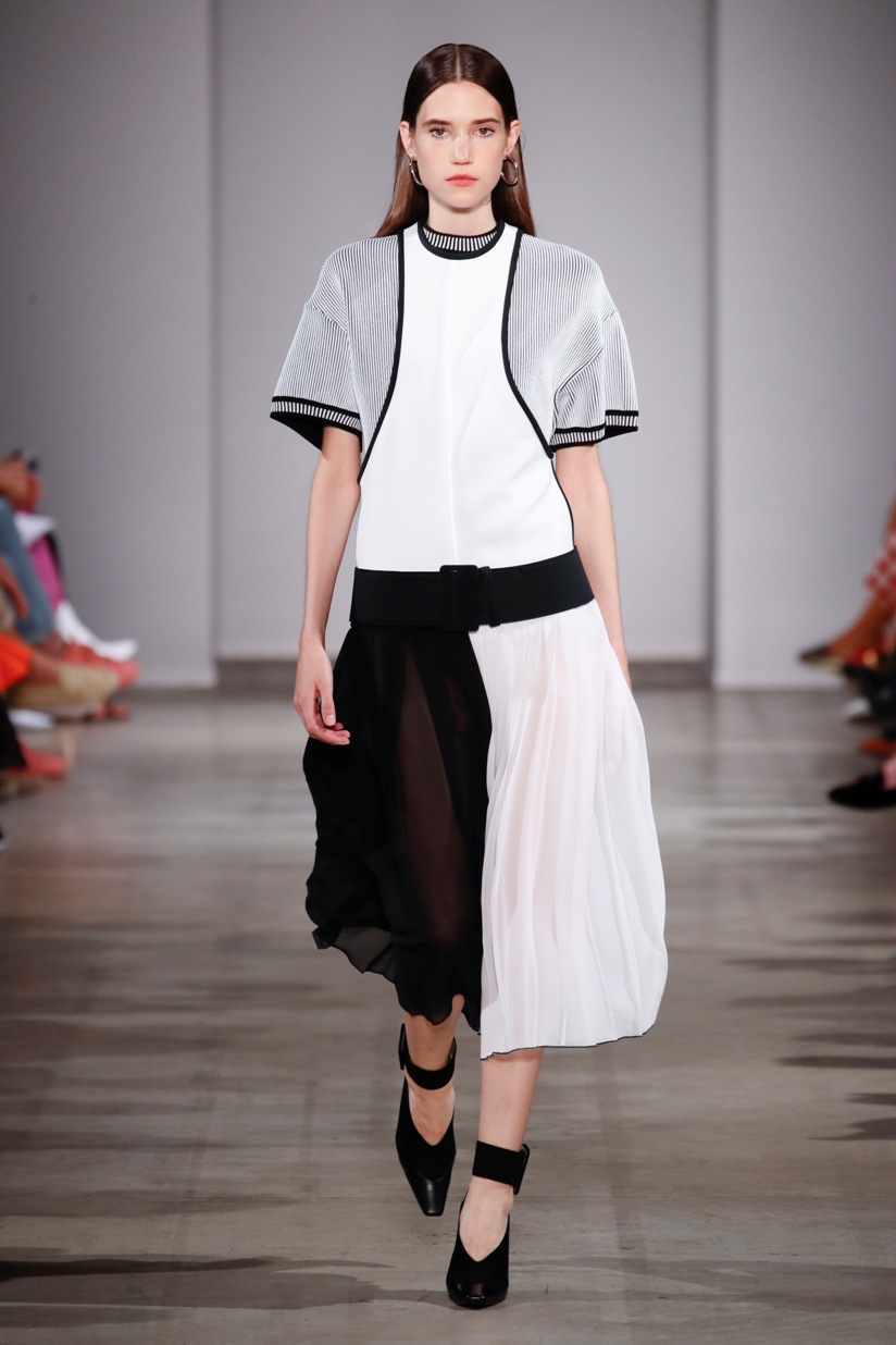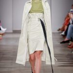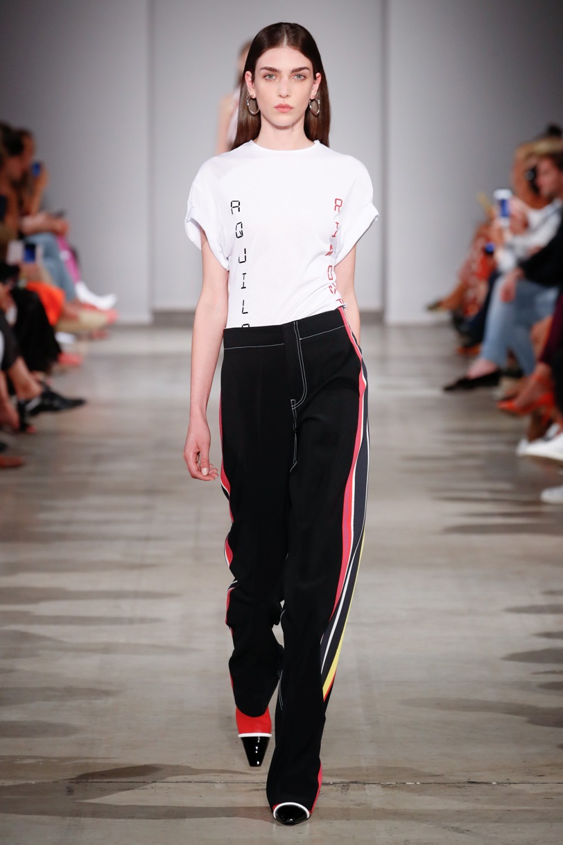 I volumi sono ampi soprattutto quelli che ridisegnano le camicie bianche, capo iconico del marchio. L’identità della collezione è nei tagli essenziali, evidenziati da intersezioni cromatiche di righe e geometrie, come nei pantaloni dalle lunghezze varie caratterizzati da bande laterali; ma l’identità è anche nelle asimmetrie, che costruiscono gonne dall’allure femminile e leggera enfatizzata dalla vita strizzata in cinture alte, che disegnano abiti leggeri e fluttuanti, sofisticati, iperfemminili e vibranti.